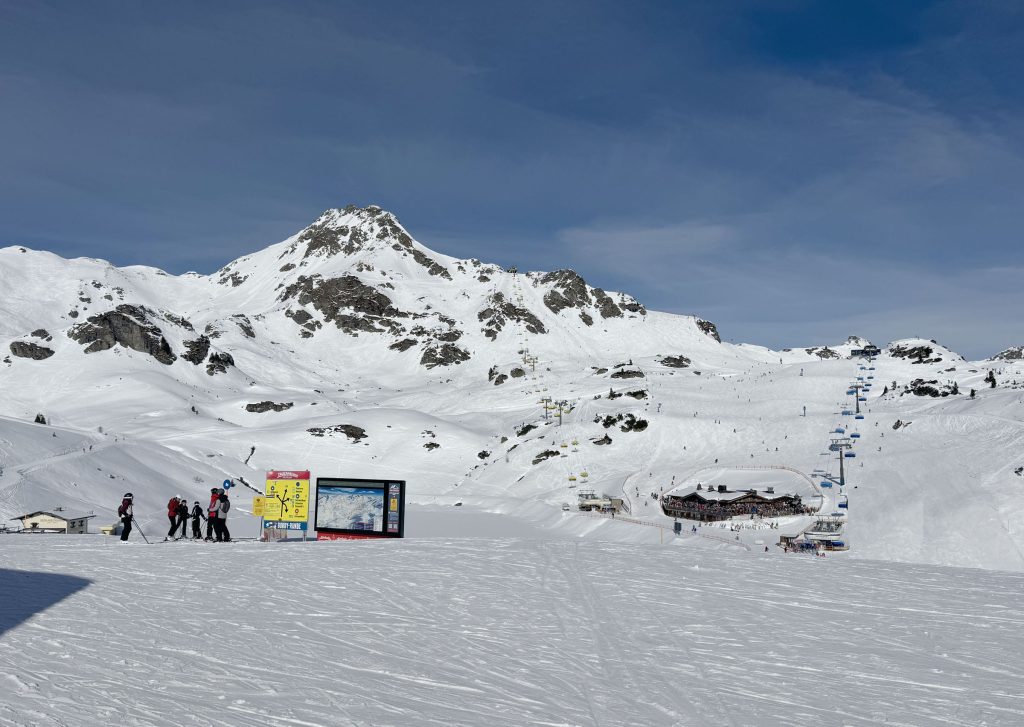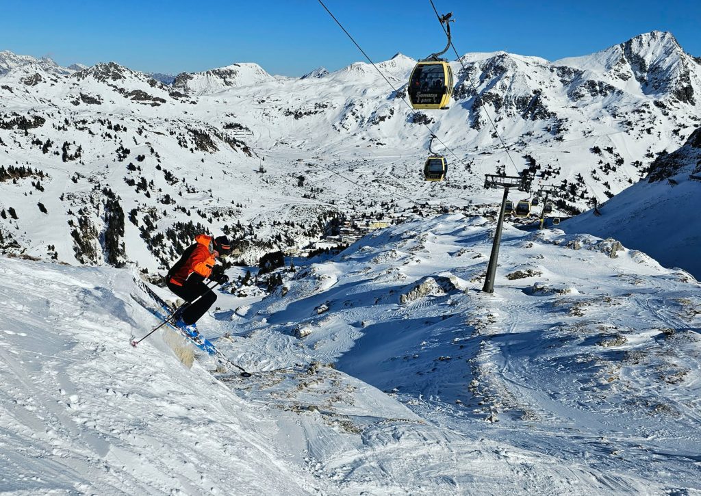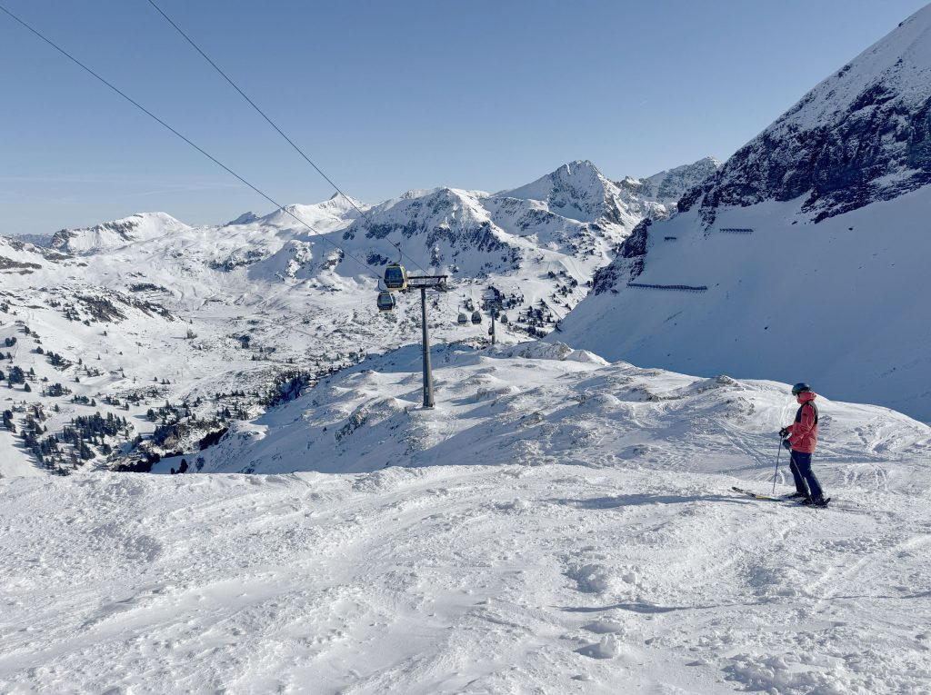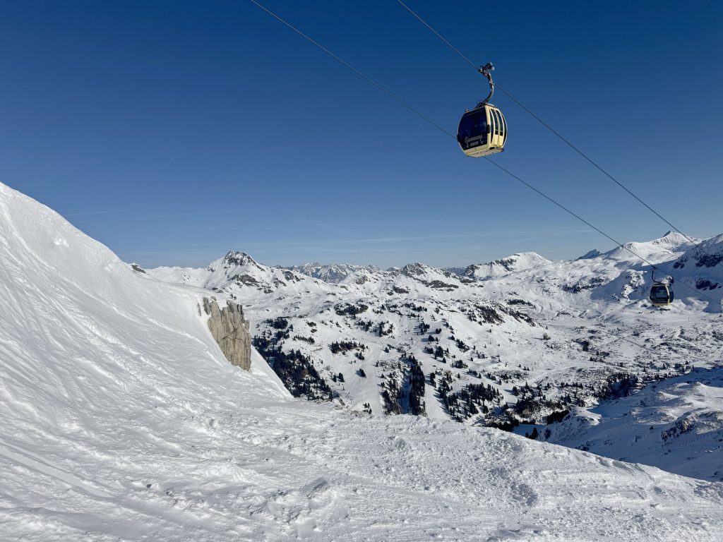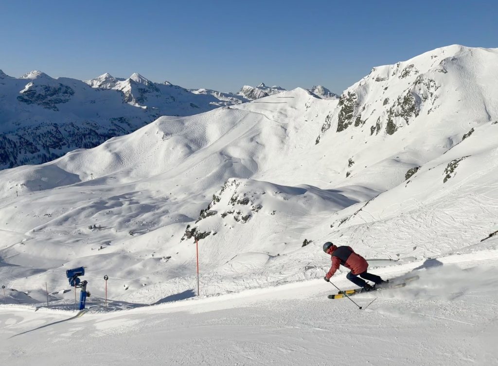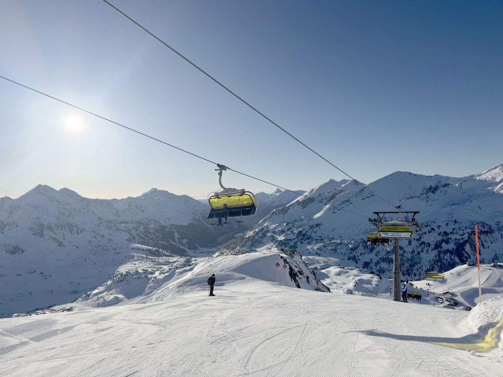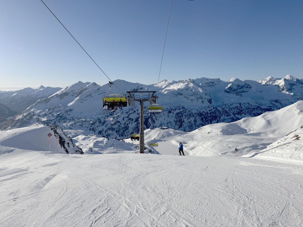 Considered Austria’s most snow-rich area, Obertauern enjoys snowfall from both the north and the south, with a base elevation of 1630 meters, and skiing up to 2313 meters (7,588′) on seven interconnected peaks around the valley surrounding the alpine valley of Obertauern. Its shaped like a snow bowl, so you can follow the sun to varying exposures during your ski day, on a variety of new modern lifts and older high-capacity lifts, moving people around in circuitous routes.