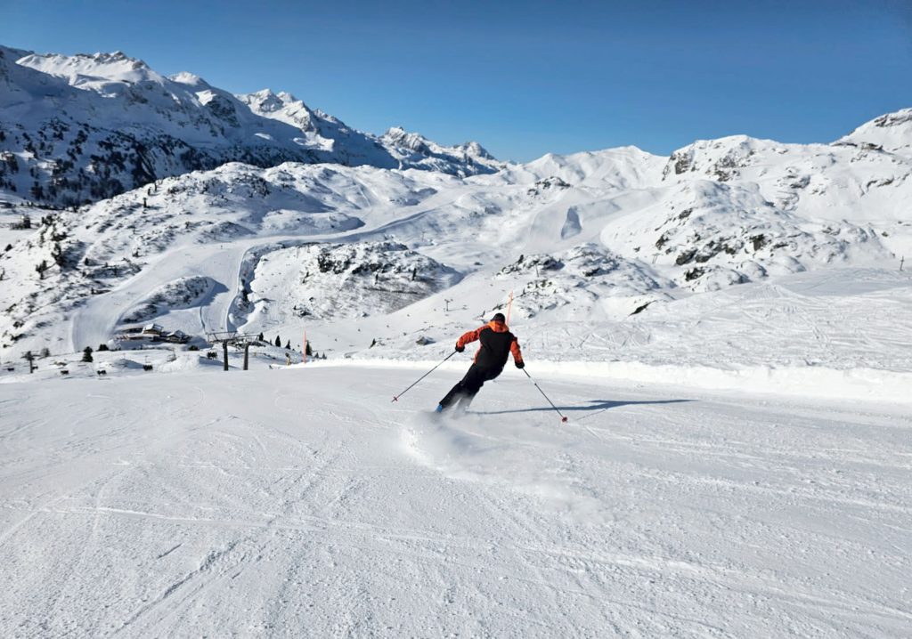 You can see much of Obertauern’s entire ski area from the upper mountain lifts, on a clear day in the Alps which is magical. You can ski in a clockwise or counter-clockwise circuit. There are two tours, for fun and challenge, the Red Tour (Tauernrundle) is clockwise and more difficult, while the Green Tauernrunde, is more intermediates. This ski tour has skiers riding many of the 26 lifts.