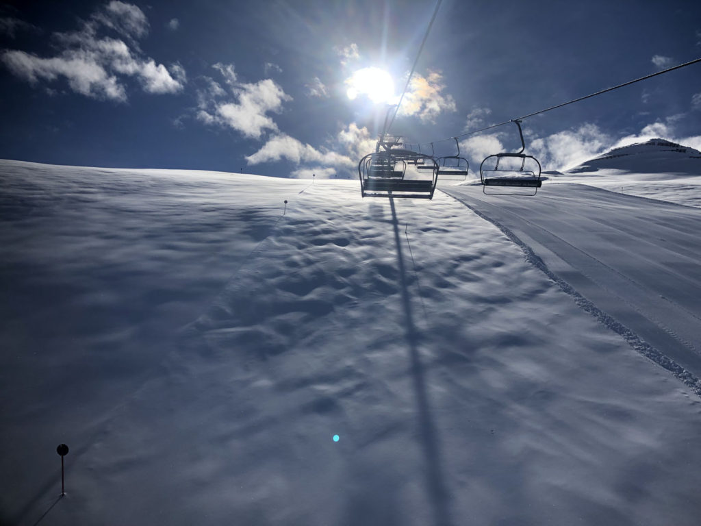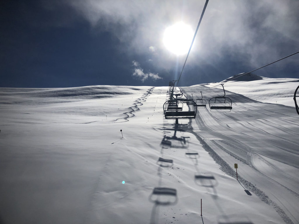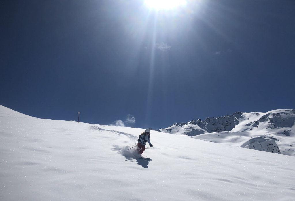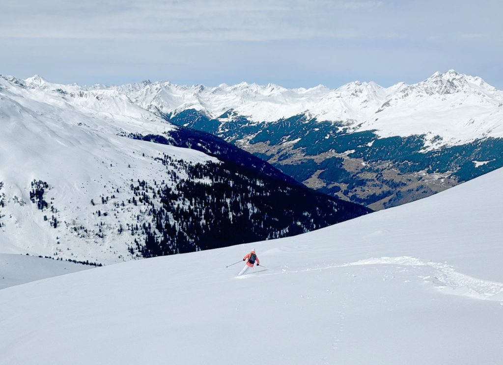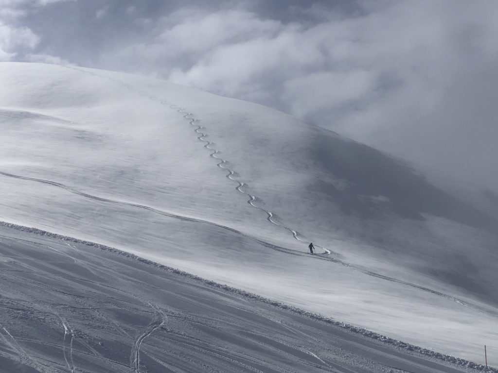 From Rauhkopflift summit, right side of the trail map, the Rossmoos fixed grip (slow) quad serves a few well-groomed long beautiful trails, and more tremendous off-piste fields right next to the trails. On our fresh snow day, in early April, we were 2 of about 12 skiers scoring run after run of fresh untracked powder – with no climbing, easily reached just off the prepared marked trails. This is farm pasture in summer where cows graze and locals produce delicious Paznaun cheese in little cheese huts. Note: watch out for hidden covered farm fences in the snow fields.