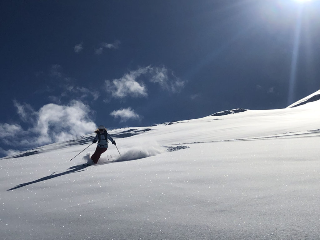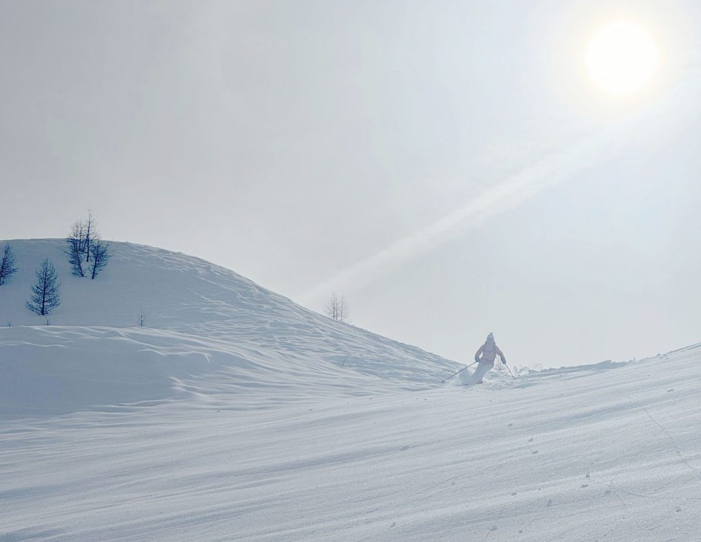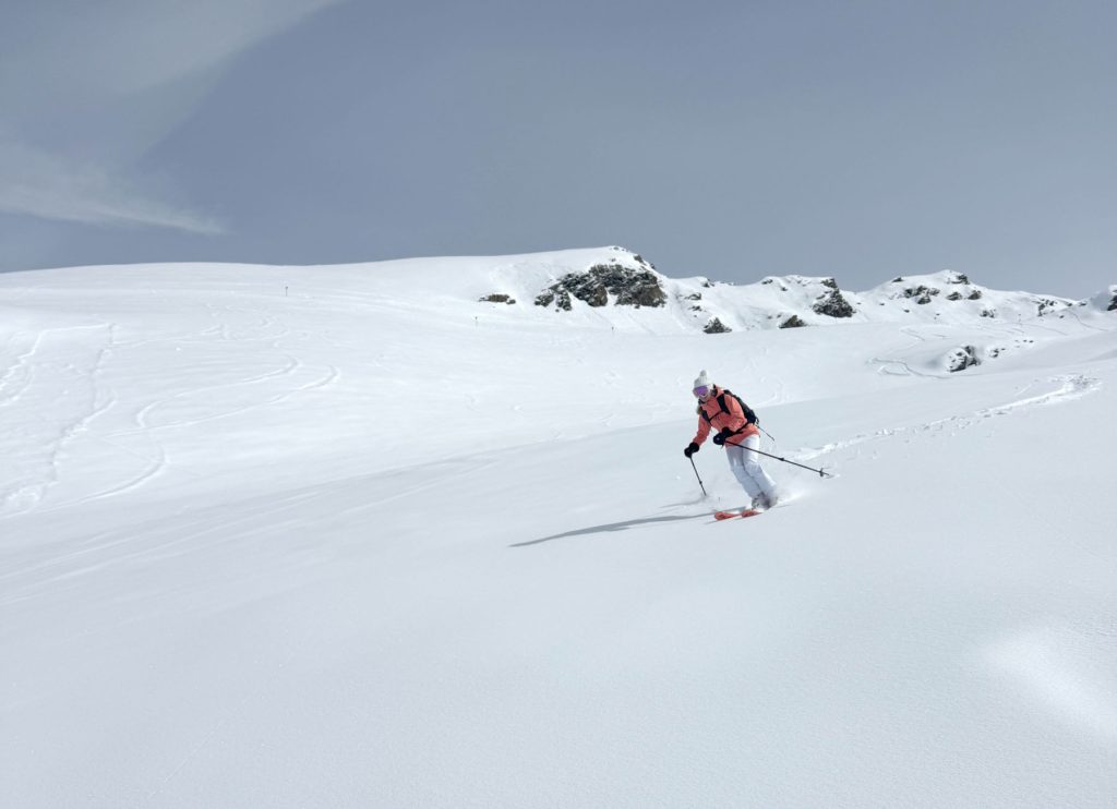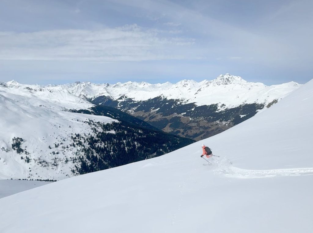 From Rauhkopflift summit, right side of the trail map, the Rossmoos fixed grip (slow) quad serves a few well-groomed long beautiful trails, and more tremendous off-piste fields right next to the trails. On our fresh snow day, in early April, we were 2 of about 12 skiers scoring run after run of fresh untracked powder – with no climbing, easily reached just off the prepared marked trails. This is farm pasture in summer where cows graze and locals produce delicious Paznaun cheese in little cheese huts. Note: watch out for hidden covered farm fences in the snow fields.