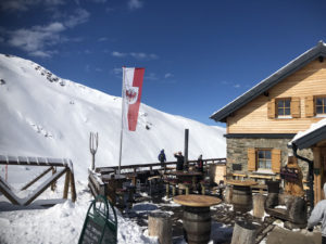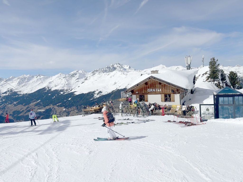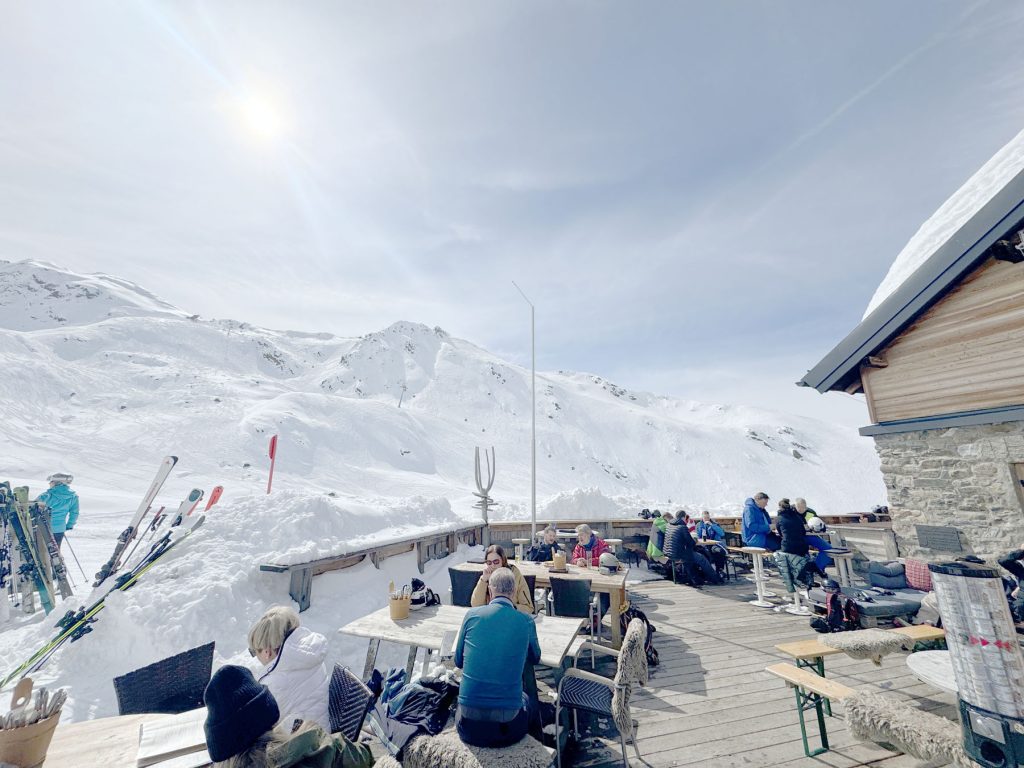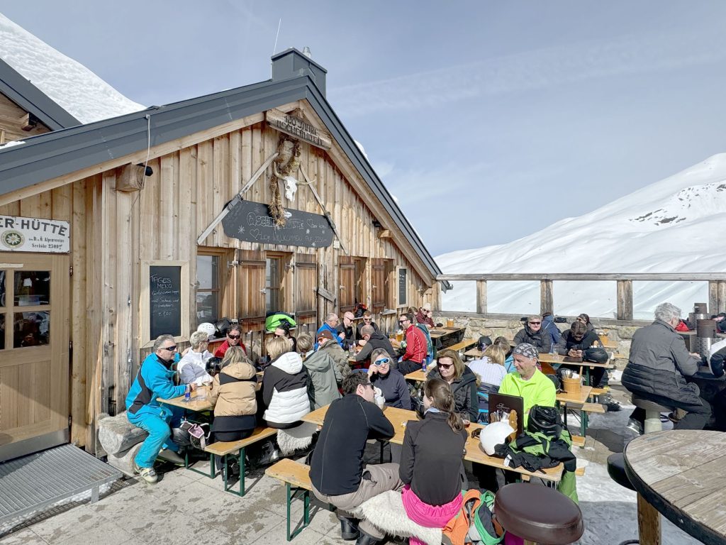 Ascher Hutte is a charming chalet restaurant perched on a crest just below the Versing gondola summit, follow trail 12c and signs to Ascher Hutte. Lunch here is traditional homemade Austrian fare in classic hut ambiance. We dined on Grosti – a yummy crock of warm potatoes, bacon, melty local cheese with egg on top, and Wiener schnitzel served with native berry sauce. Dine inside the cozy hut, or outside with fabulous Alps views of where you’ve just skied at See. A beer or Austrian wine in Ascher’s Umbrella bar here would be lovely, but we had too much to ski at See.