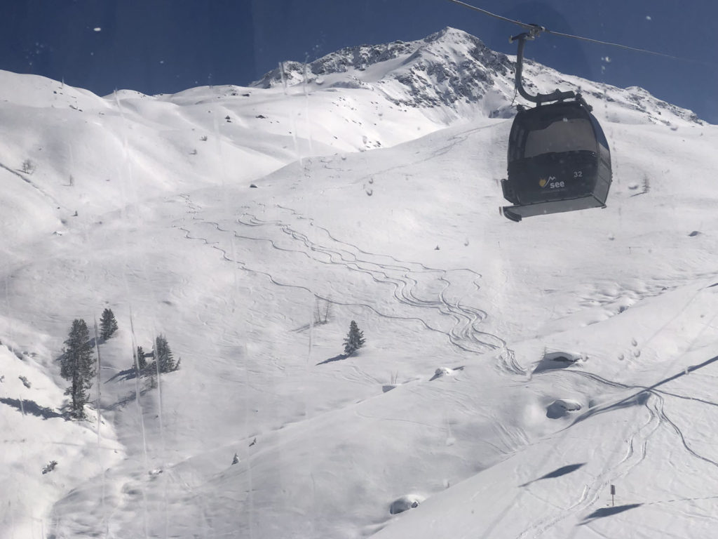 See is worth a look (humor) and a ski day. Seriously, See is the name of a small family friendly ski area near Ischgl, Galtȕr, and Kappl. See, while smaller in size than the massive modern ski resort of Ischgl, offers big mountain skiing on well-groomed ski pistes and makes for a very pleasant day ski area for families, and its super fun on a powder day for free skiers. We scored a powder day here and it was amazing.