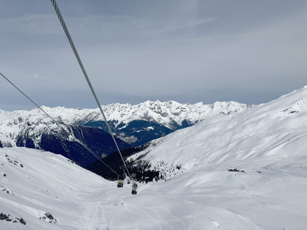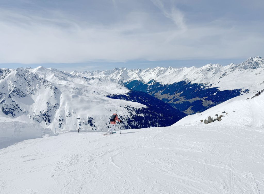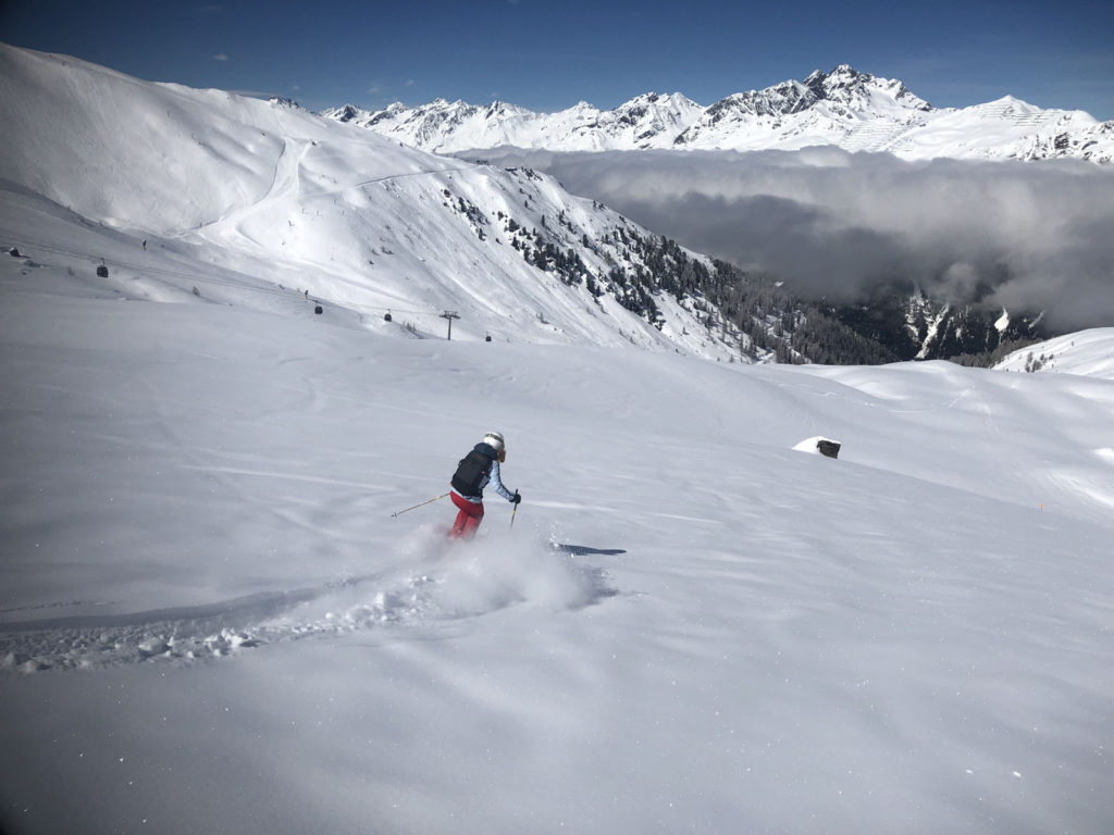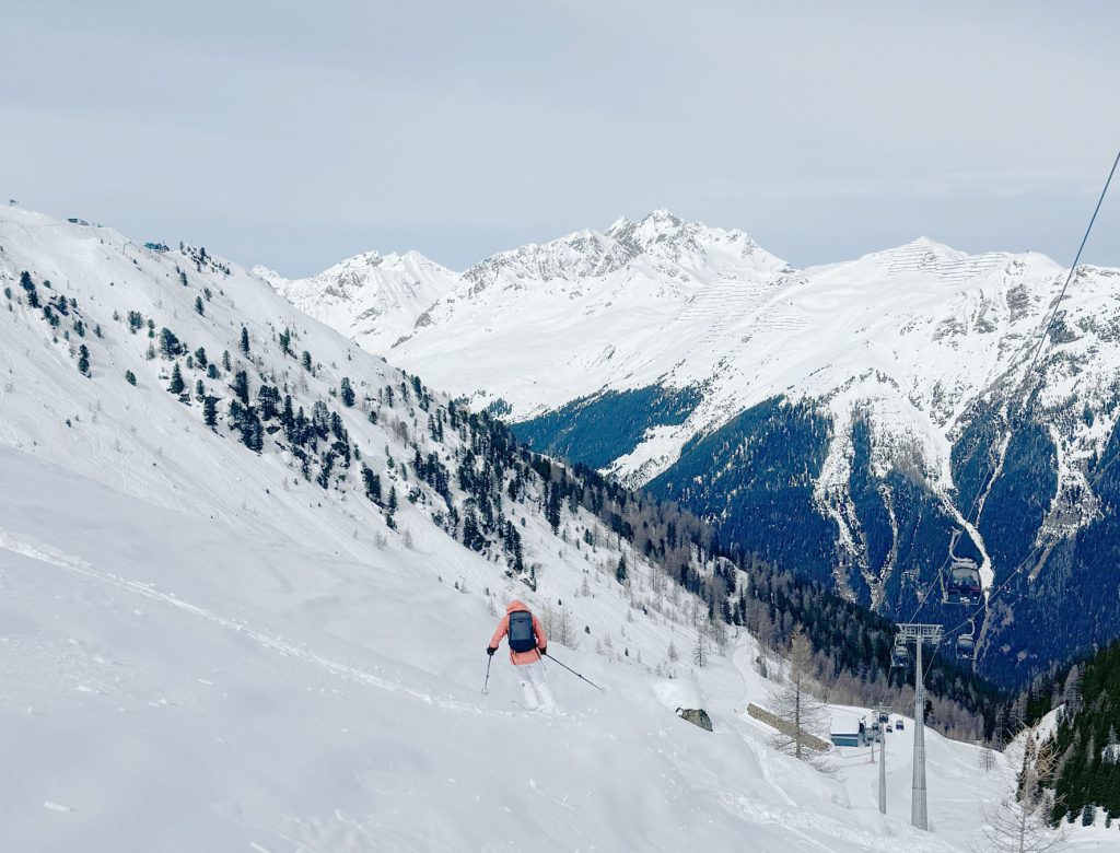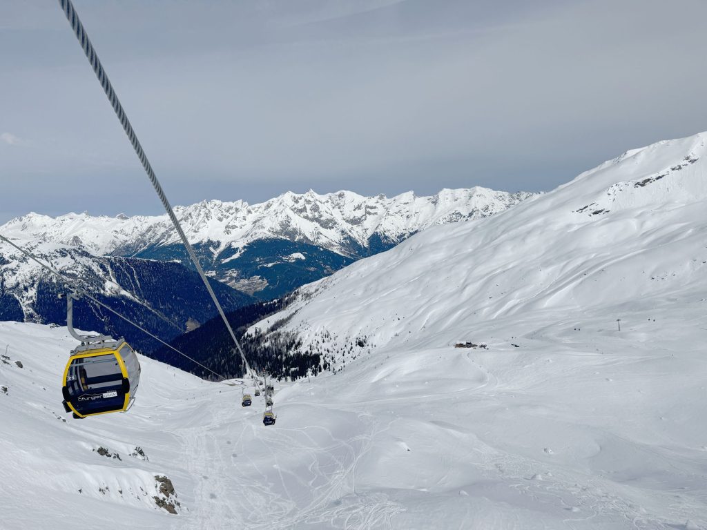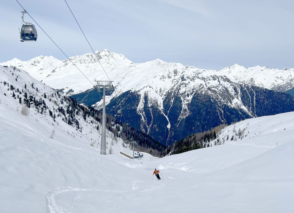 See’s long ski trail #1 winds back and forth at the end of the day to the village of See, its super fun and a full 5,000′ vertical if you start from the Furglerblick summit. Or you can download the Medrigjoch gondola, which might be prudent for intermediates and beginners on a busier ski day, or in spring when the snow becomes too warm at lower elevation.