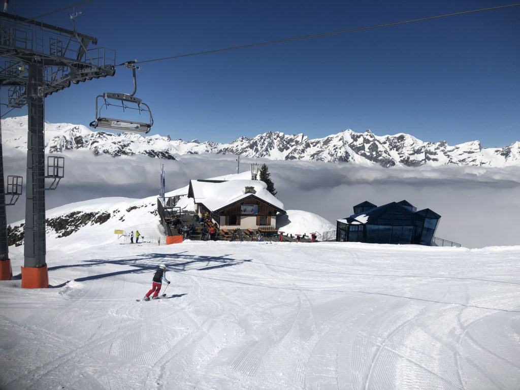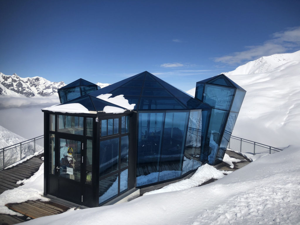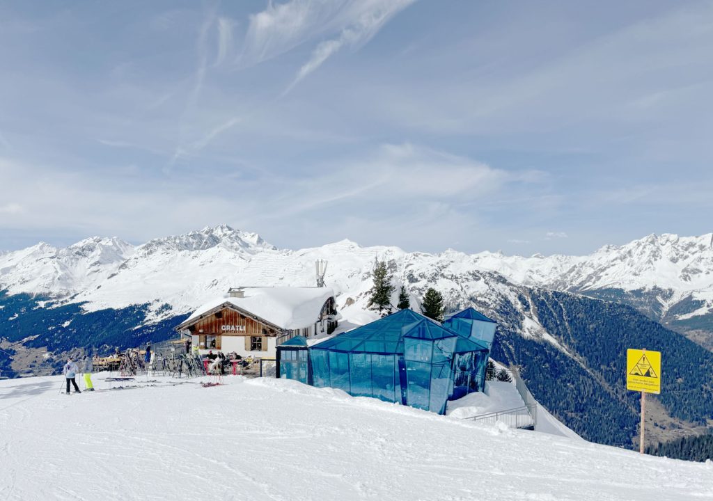 A scenic wood chalet restaurant here at See offers a grand sun terrace, and a very cool modern “Sky Bar” – a glass modular lounge for drinks with spectacular blue window panes and views in every direction at 2200-meters. It’s incongruous to have an old-fashioned wooden chalet next to this angular mod iridescent structure, but this “old meets new” works. You can “see” See in all direction from this spectacular vantage, and ski in all directions too.