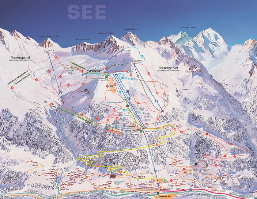 Much of See’s terrain is moderately pitched. The steepest terrain connects the west to the eastern side of mountain. New in 2022, See installed the 8 -passnger Furglerblick Gondola taking skiers to 2570-meters, 8,400′. This creates a beautiful new trail, opening up hundreds of acres of challenging off-piste terrain.