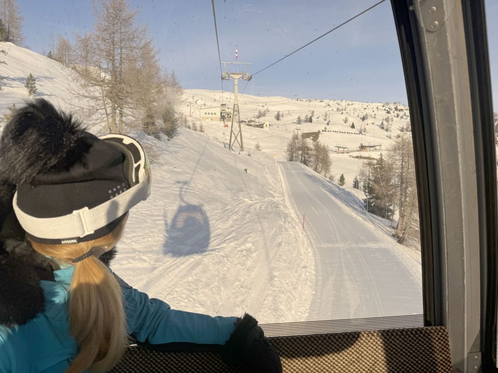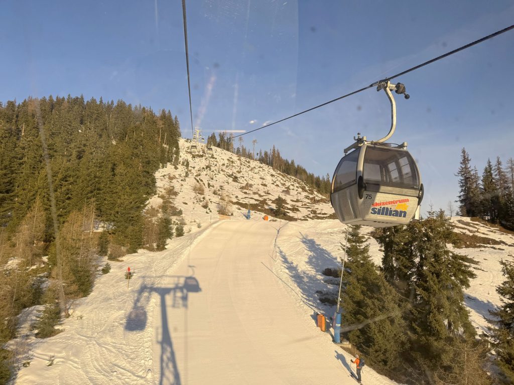 Our first ski run at Sillian, we chose to ski back down to the gondola base as Trail #1 was in the sun. It is a wonderfully pitched long 3400’ vertical groomed trail to the base. Next ride up, we ventured right over to the modern 6-passenger bubble covered chairlift – called Thurntaler and headed for the 2407 M (7,896’) summit.