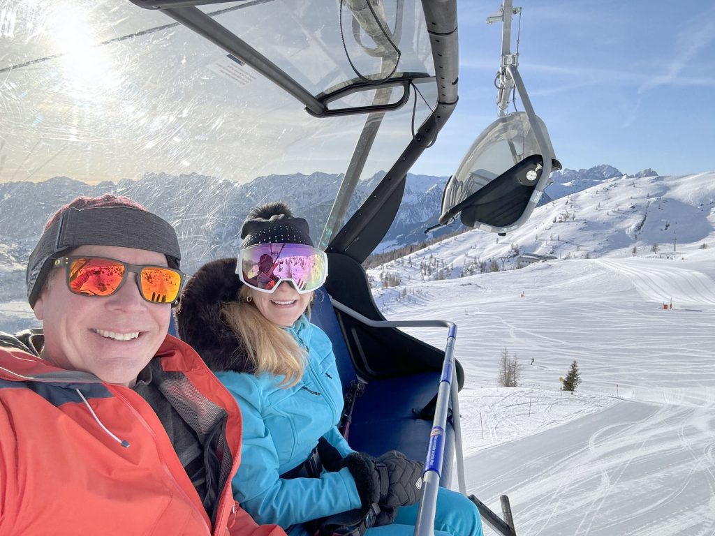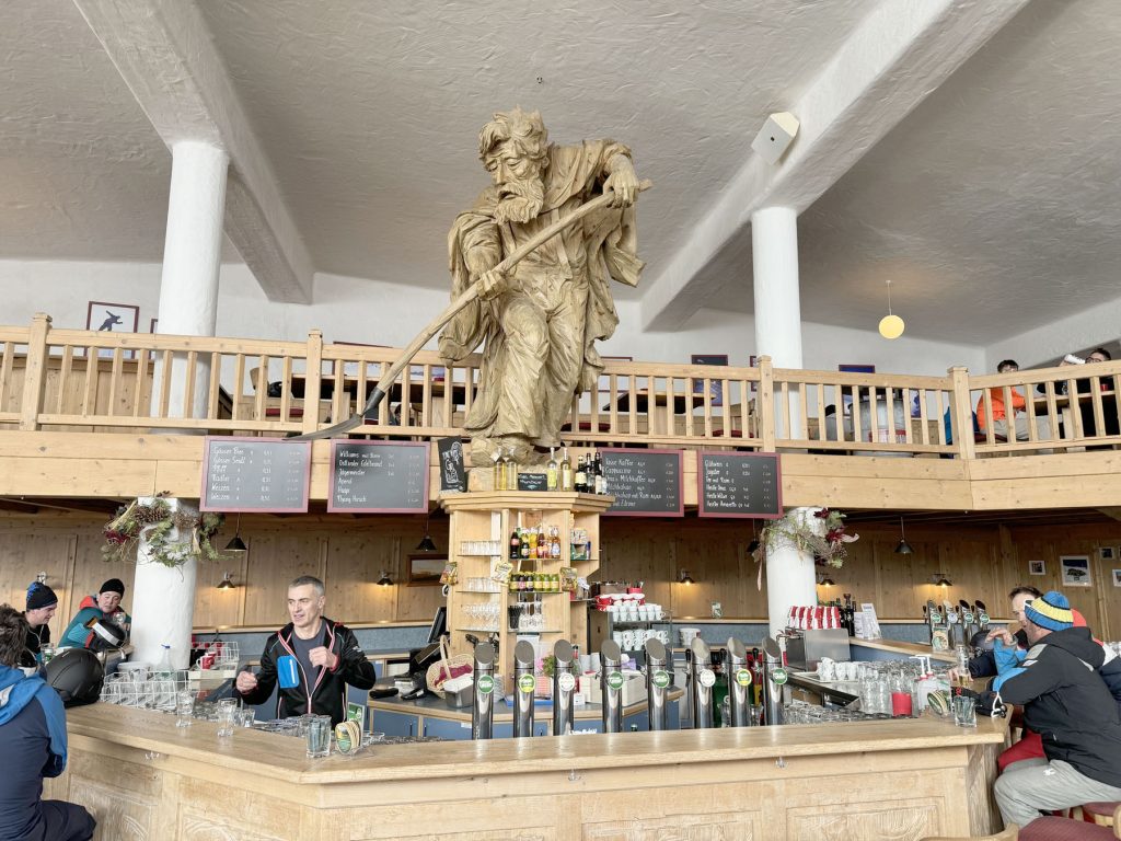 Trail 6 was another fun long run to a separate base, descending well below the six-pack lift, to a small alpine farm, with just one lodge and a perfectly cozy chalet hut – The Pistentreff. A speedy quad chair brings you back up to midmountain. On our third lap of this favorite Trail 6, we stopped at Pistentreff chalet for a hot Gluhwein and an Almdudler (an herb-infused Austrian soft drink Heather loves) to refresh before more big ski laps in this sunny wonderful playground.