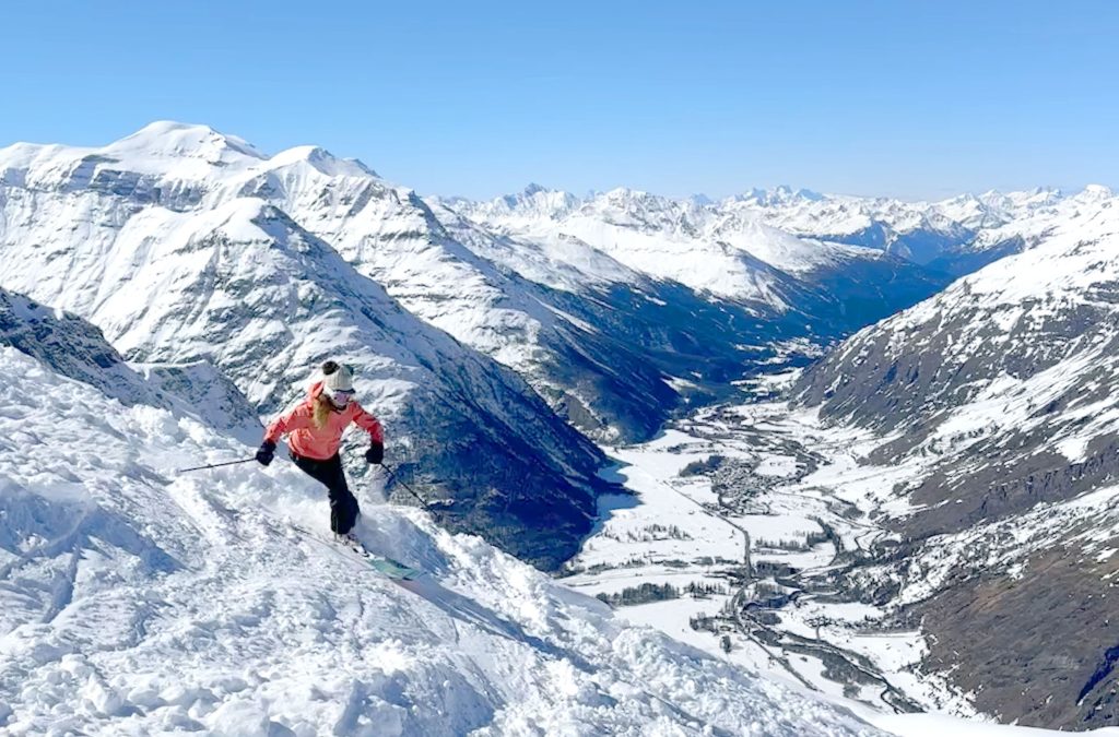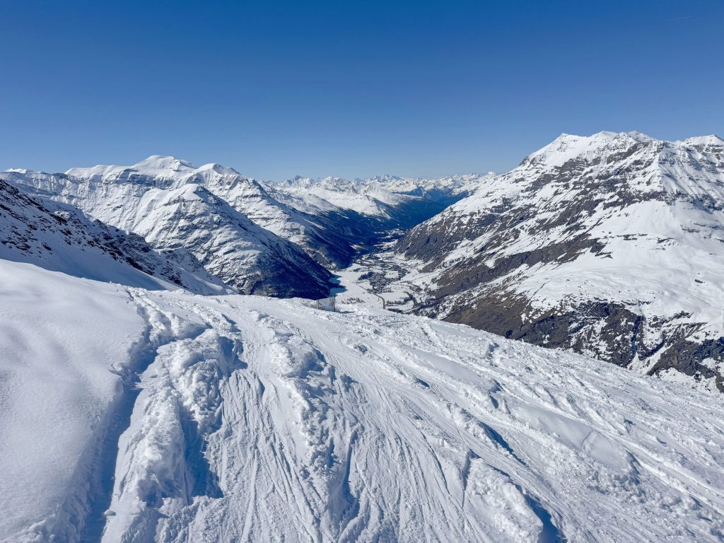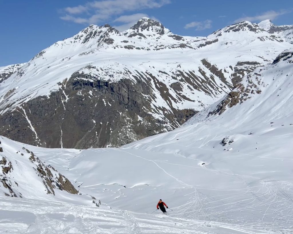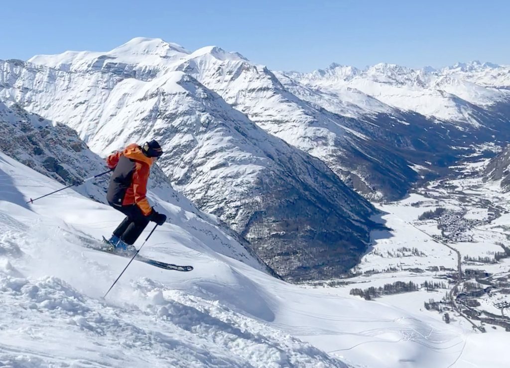 Bonneval is known as one of the snowiest in the French Alps, thanks to its 3000-meter elevation, over 9,800′. Elevation is so important these days skiing the Alps, valleys can be green, while the peaks are snowy, and snowmaking trails and lifts provide access to upper mountain key terrain.