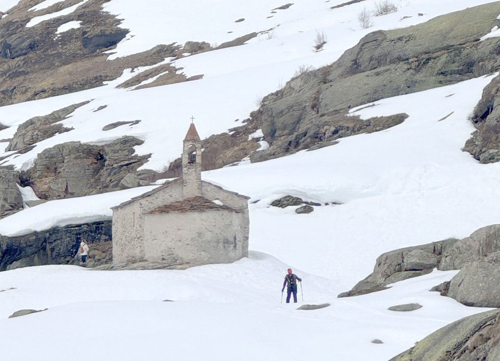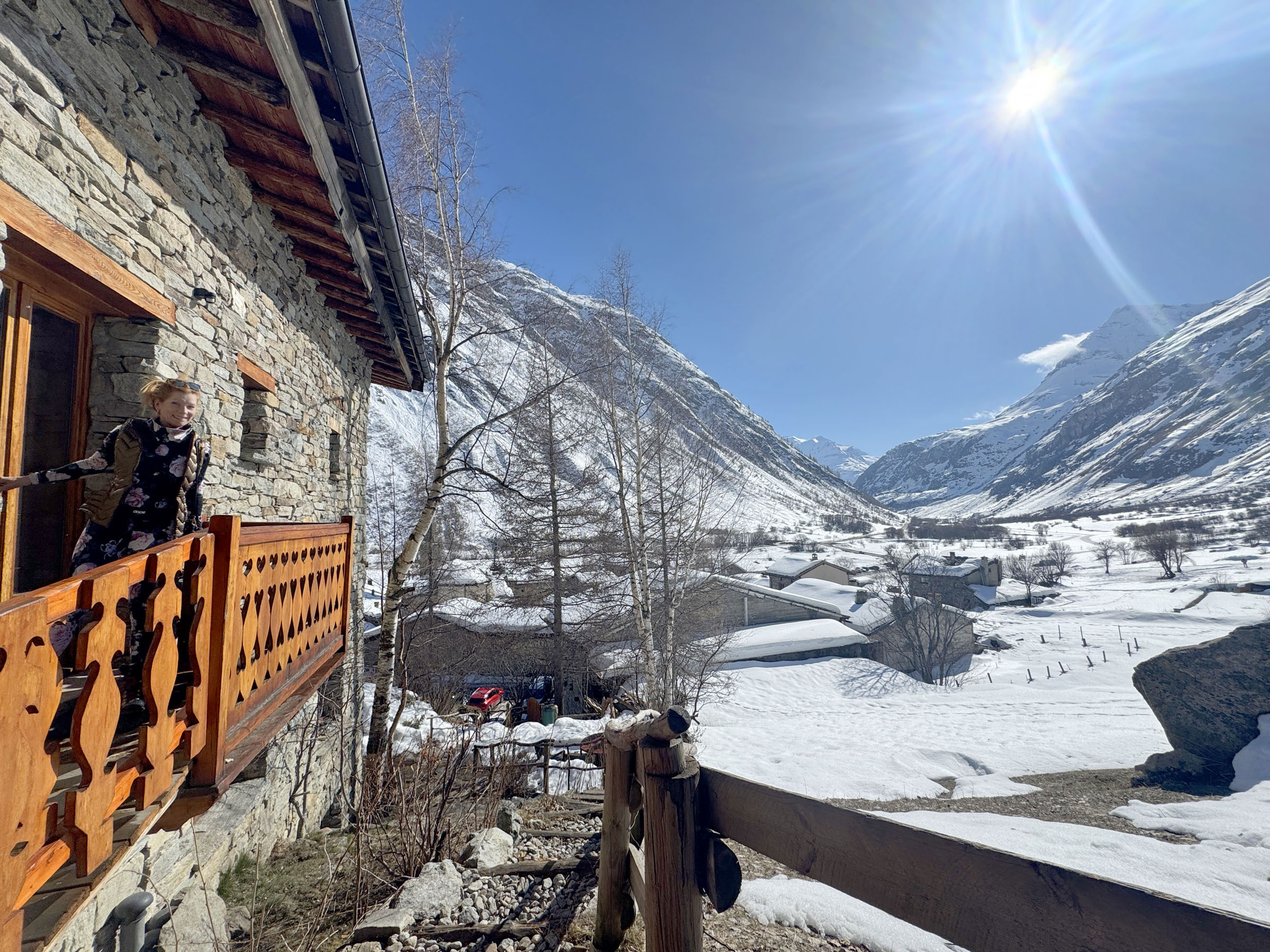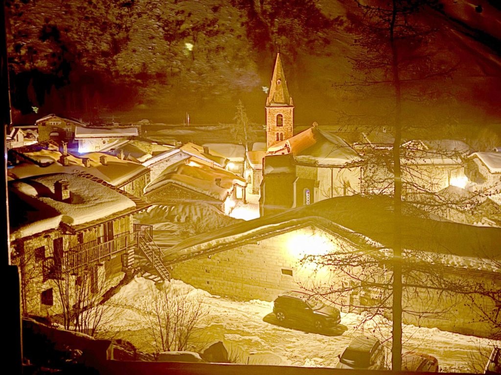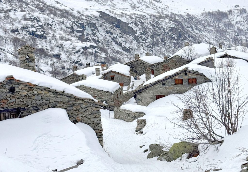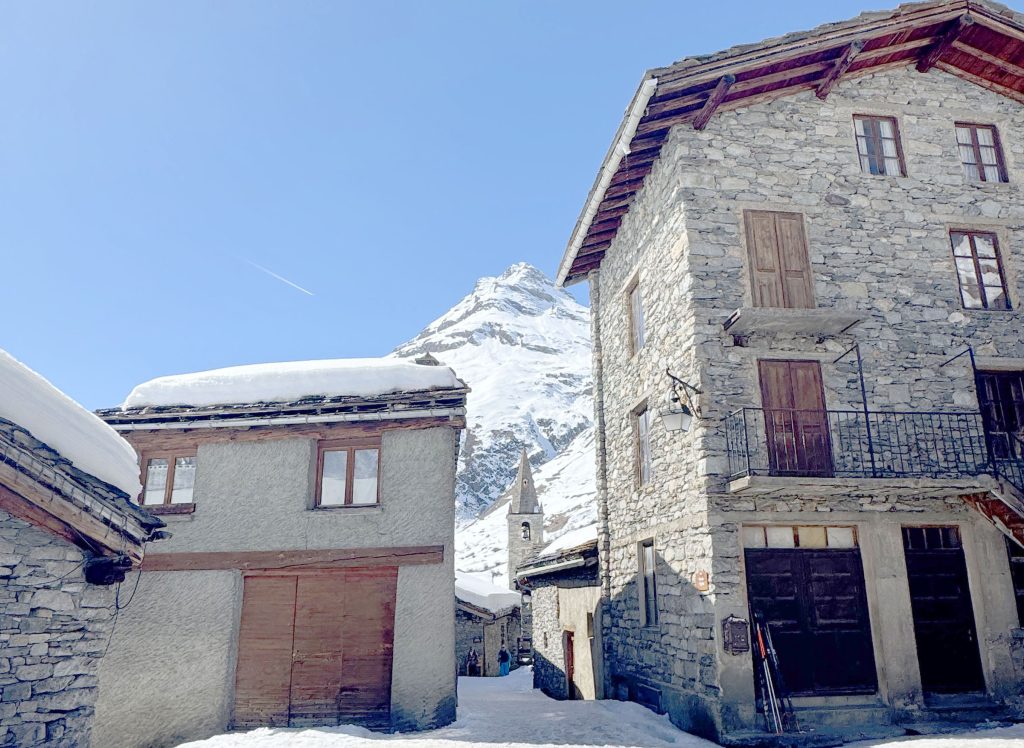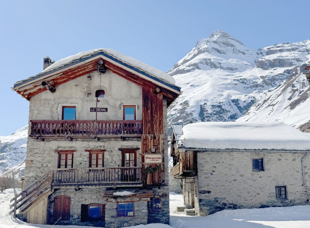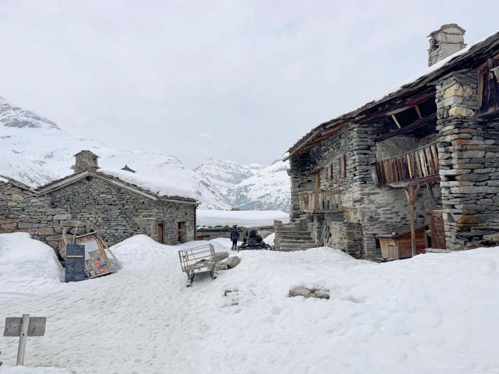 For a special Bonneval adventure, snowshoe, winter hike or ski tour from the base of the ski area up 4-kilometers on the Route de L’Ecot to the ancient village of L’Ecol at 6,500.’ This medieval rustic hamlet has incredible stone wood chalets tucked in the valley, only reached by ATV, skis or walking in the winter. It’s incredible that a full-service restaurant, Chez Mumu, sits in the heart of this authentic alpine village and serves a wonderful lunch, crepes or beef bourguignon with wine, and delectable homemade dessert tarts. It’s a 1-hour adventure hiking, or randonee, up the mountain in winter. 7.5-kilometers round trip. Its so extraordinary and worthwhile to witness this amazing high-altitude village made by hand centuries ago, now a protected site since the 1970s.