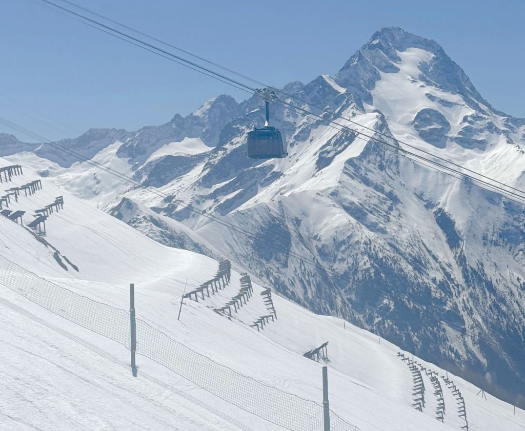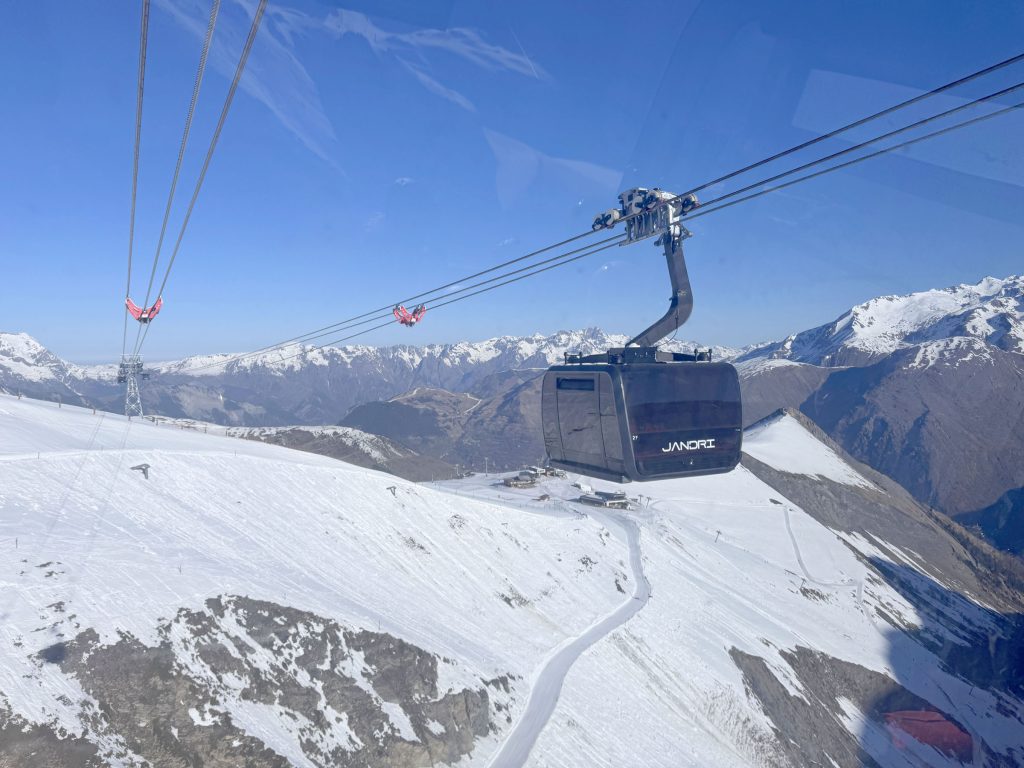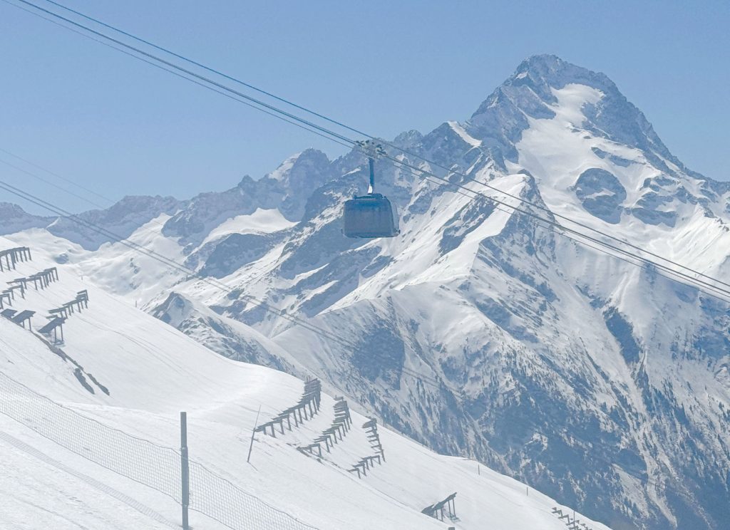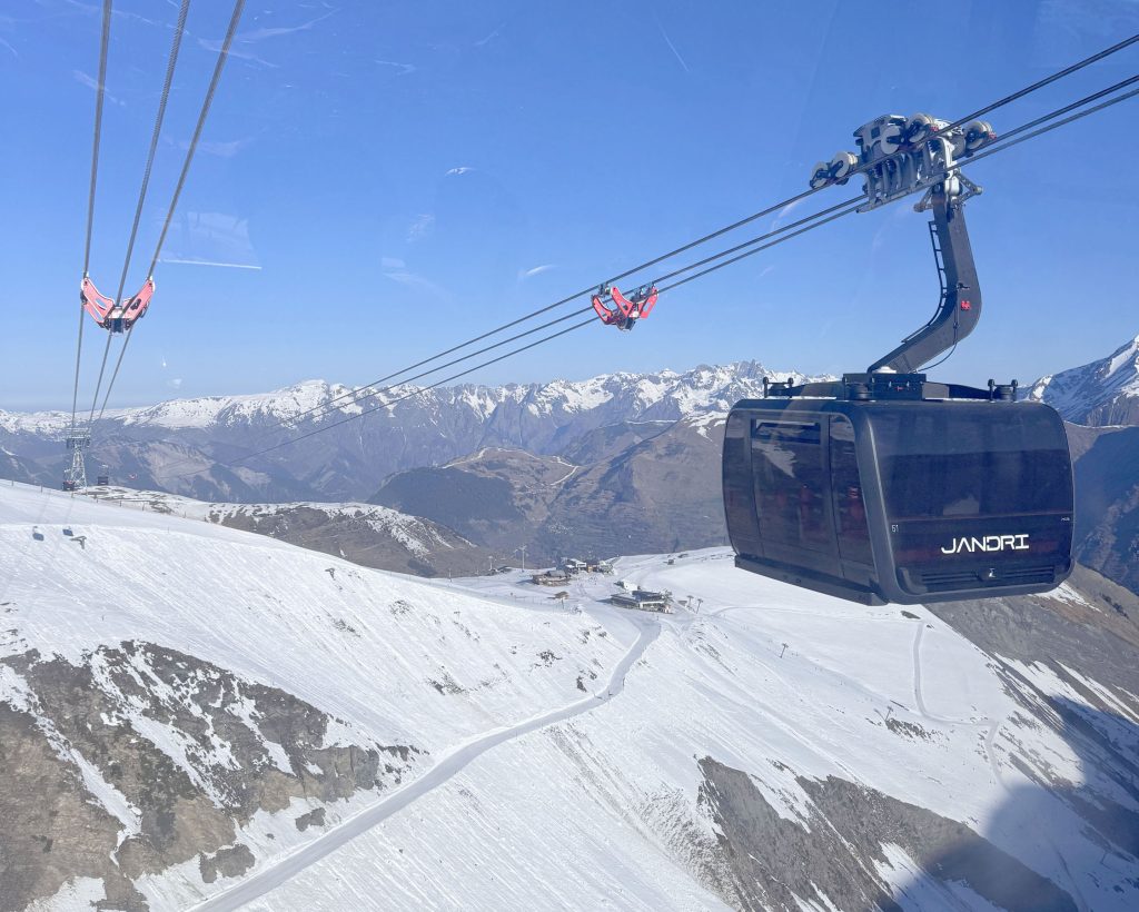 Les 2 Alpes in the southeastern French Alps is massive, with skiing on both sides of the valley on huge mountains. The best skiing is at high elevation. Ride the spectacular $100-million two-stage 32-passenger Jandri gondola up to 3200 meters, where you can ride T-Bars or take a funicular up to the Puy Salie glacier at 3600 meters, 11,800′. This ski elevation is almost as high as Zermatt (at 3800 meters), among the highest in the Alps.