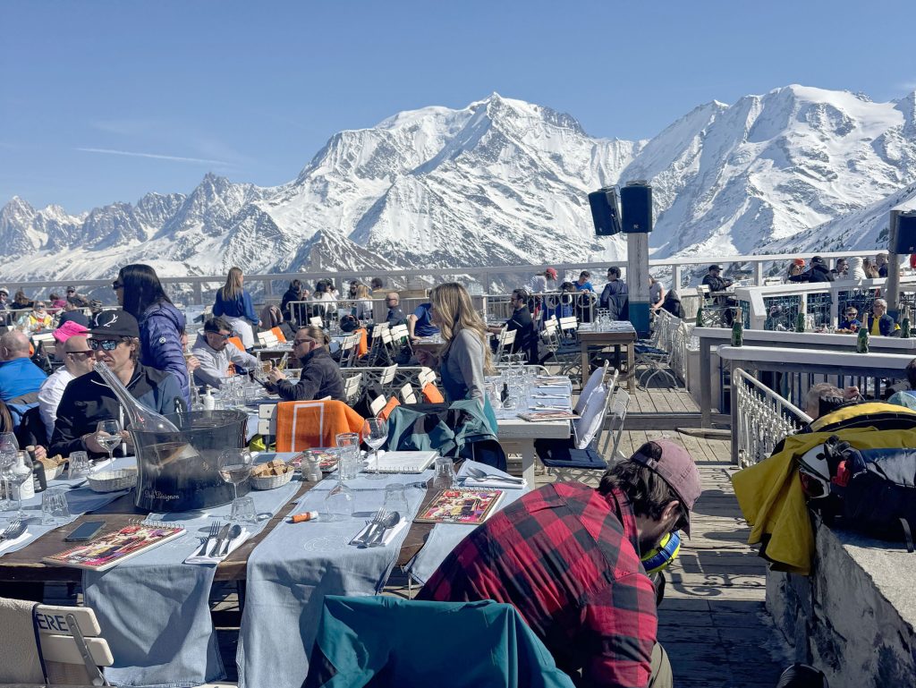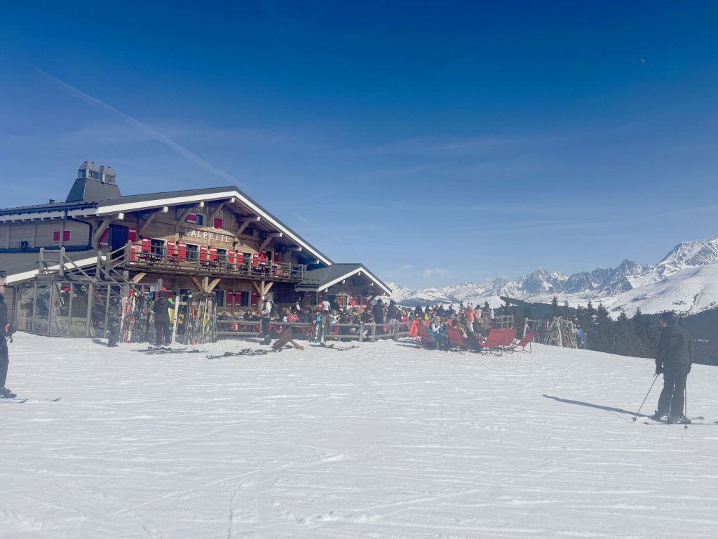 Megève’s upscale reputation (and glamorous portrayal on Emily in Paris) brings the downside of being pricey! We loved our on-mountain chalet lunches, sitting on a chic sun terrace, at l’Ideal 1850 and L’Alpette, but lunch entree prices are often $40 and up, and a small glass of local French wine can be $15 Euros, versus $5 – 8 Euros at other French resorts.