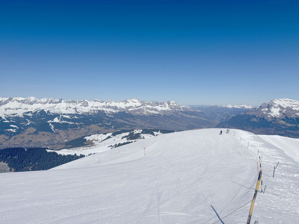 The town of Megeve is at a low elevation and it is a rare winter these days when you can ski to the base, instead you must download the gondola. Up on the mountain, the grassy moderately pitched slopes hold up with modest snow. There is some snowmaking and excellent grooming to manage the snow on the pistes. Despite the low elevation, Megeve has off-piste skiing, with far fewer free-riders than the nearby legendary Chamonix at Mont Blanc.