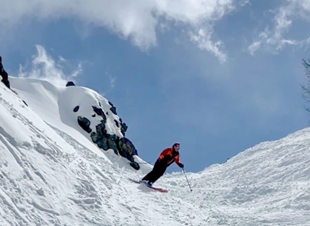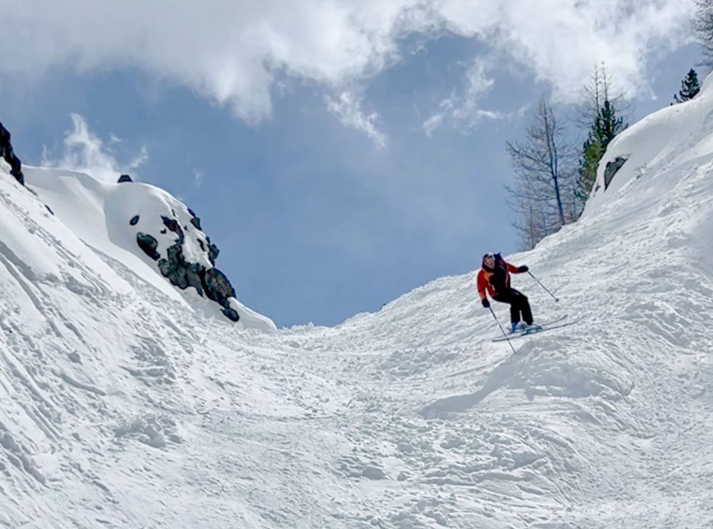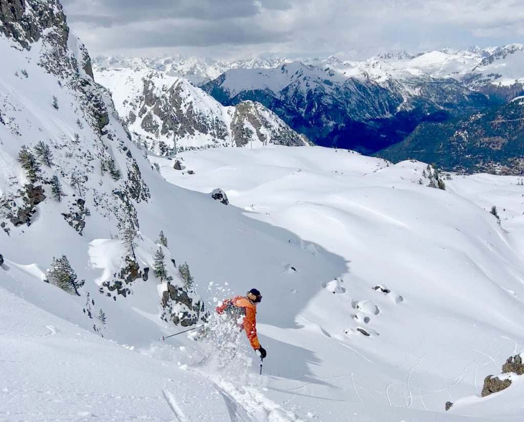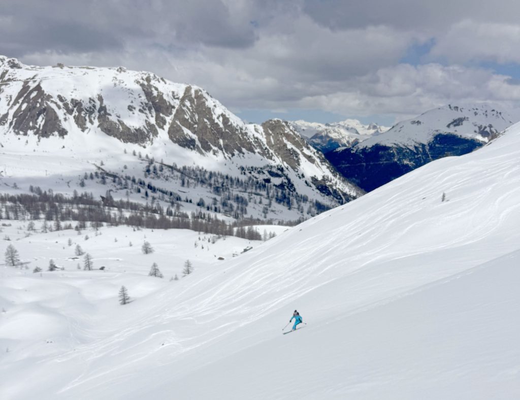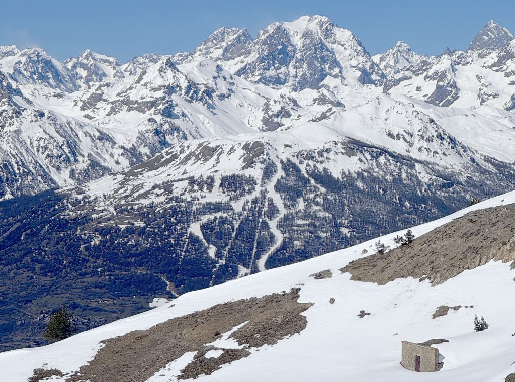 We also loved Montgenevre ego-pleasing wide trails in the upper mountain region of “Gondrans,” where a few low-angle lifts serve 1300-meters of vertical, and stunning views. Here you see ancient military stone structures at the summit – fascinating. Some of our favorite freeride terrain was on the connecting Crete lift up to a wide-open bowl. We also enjoyed the long Chamois prepared trail into Italy. This ski region typically has good snow, high elevation of 2400-2500, with a base elevation of about 1800 meters.