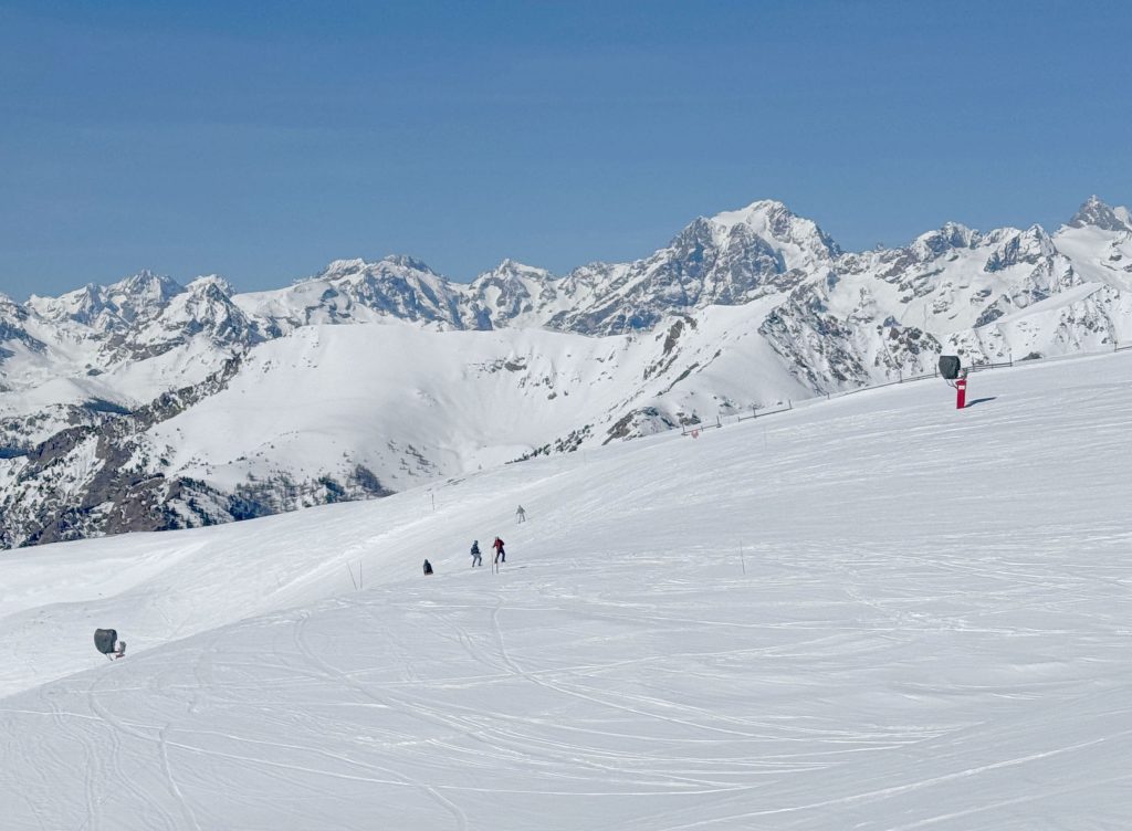 From Montgenevre and Vialetta, on our ski safari, we enjoyed skiing nearby Serre Chevalier in Briancon. We also loved skiing the Haute Maurienne Alps, the next valley over through a 55 Euro tunnel. Here we skied Val Cenis, Bonneval sur Arc, La Norma and Valfrejus ski areas in this more authentic high alpine valley, an hour away via tunnel from Bardonecchia Italy (another fun but rustic ski area) to France.