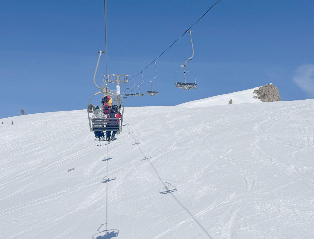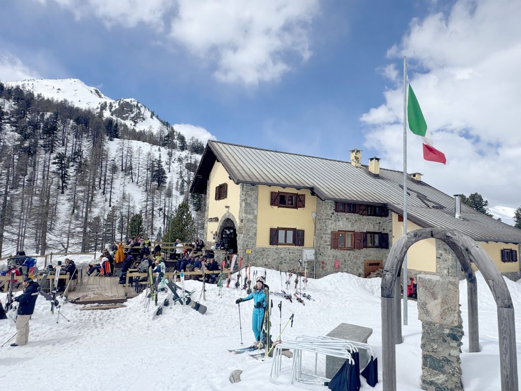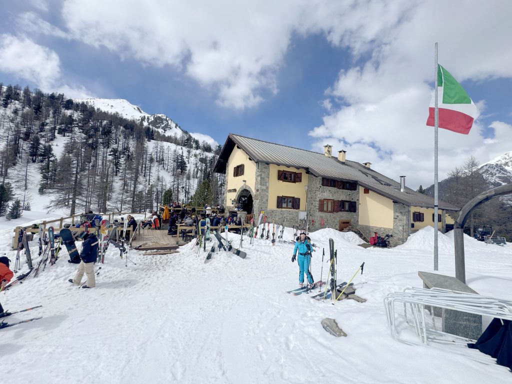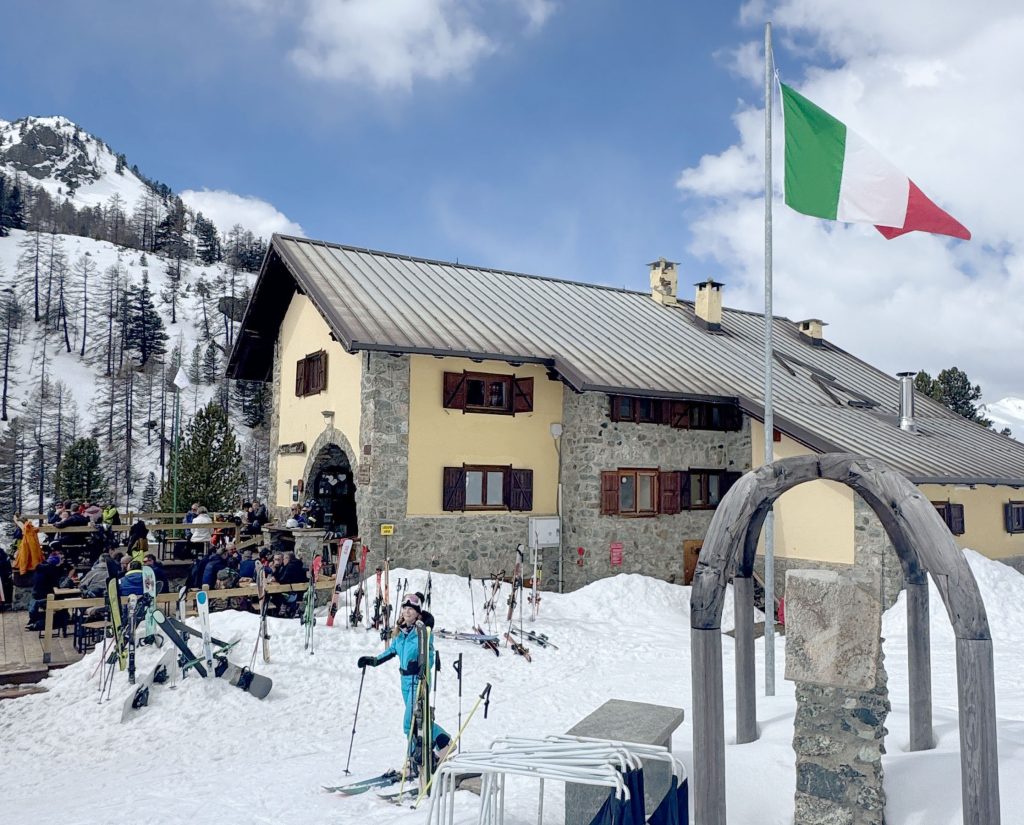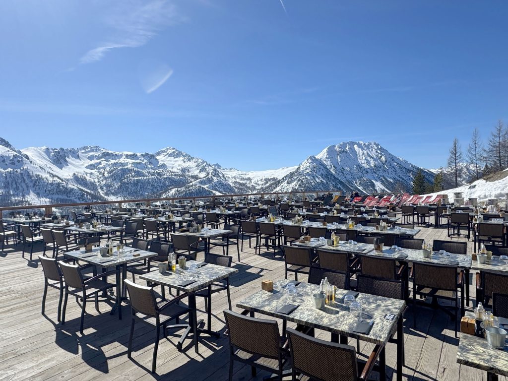 From Montgenevre, ride the beautiful summit gondola to L’Aigle to the summit and the French/Italian border (a fun place for international ski photos). Drop into Italy on a long fun slope and you will find three great on-mountain restaurants for Italian lunch or drinks. We loved our lunch on the sun terrace at Gimont… a wonderful mountain refuge chalet. Here there are several delightful red runs to choose from.