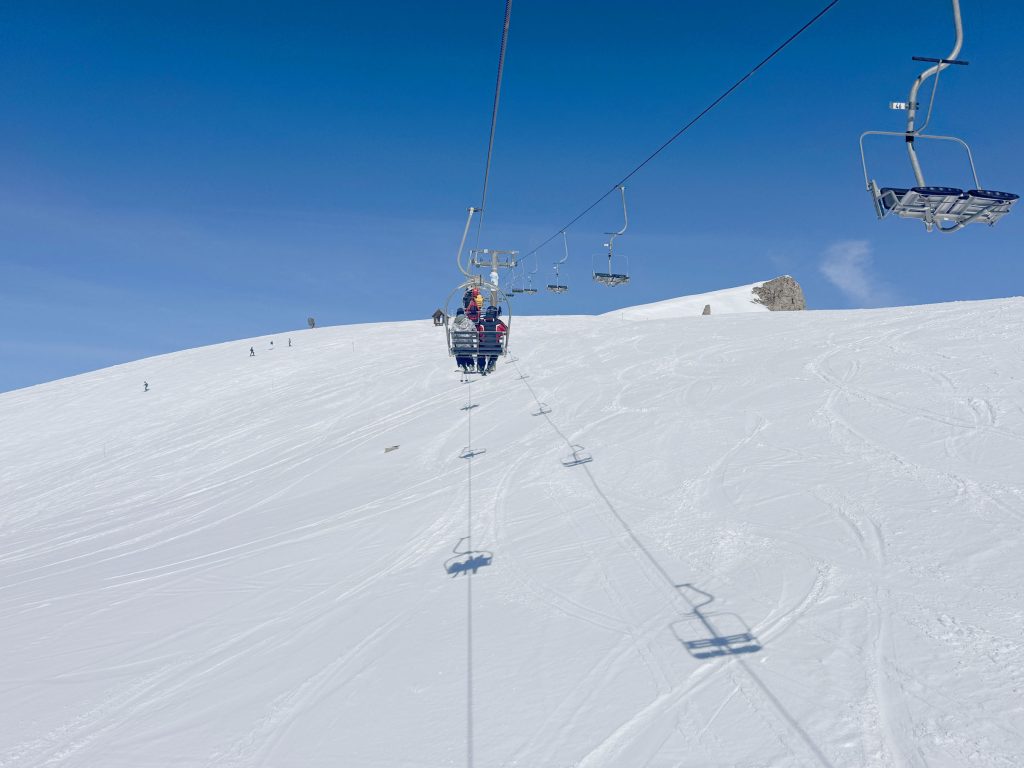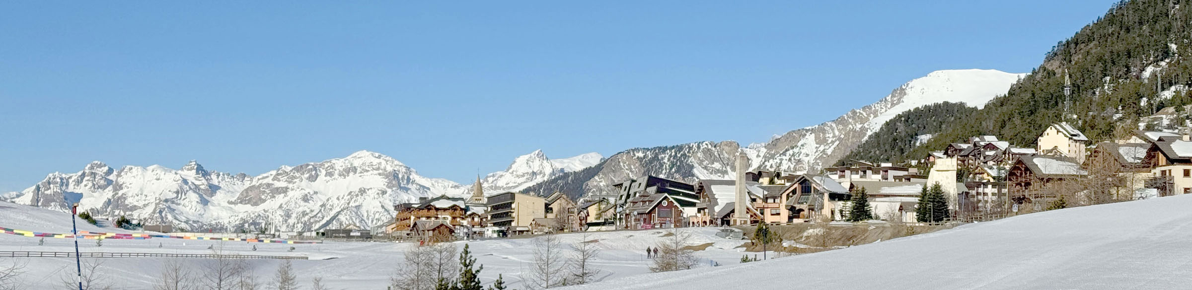 Montgenevre’s base valley, which is divided by a road from Claviere Italy to Briancon France, and actually includes the border, has a nice ski village with hotels, shops and restaurants, and ski bridges. A car tunnel keeps the through traffic hidden from town and the lifts. Montgenevre is family friendly, with snow parks, mascots, fun weekly activities, and there’s a thermal spa for adults and kids. We stayed in quieter authentic Italian Claviere, and could reach Montgenevre’s sunnier ski slopes in just one lift ride and ski run.