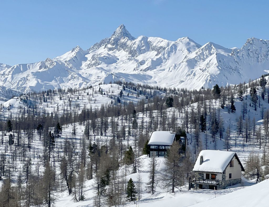 Montgenevre skiing is a delightful mix of every type of ski terrain you could hope for on both sides of the village, with beautiful French and Italian Alps scenery. You can ski all aspects, from the north side, south facing which is a great place to start the day in the sunshine. Montgenevre has a dozen nice red and blue trails, plus a couple steep black trails which face north and east, served by three fixed grip chairs and the modern Serre Thibaud six pack chair/gondola “telemixe” lift. On the Chalvet (south facing side) side of the valley, just one beautiful lodge, Les Terraces sits mid-mountain on the beautiful Pharo trail and is lovely for a cappuccino stop or lunch on the terrace or inside the modern alpine-chic interior.