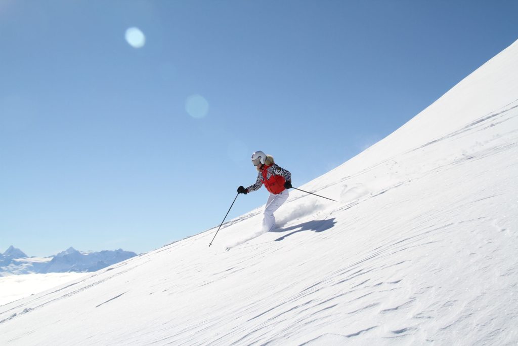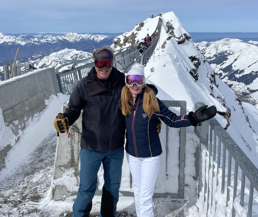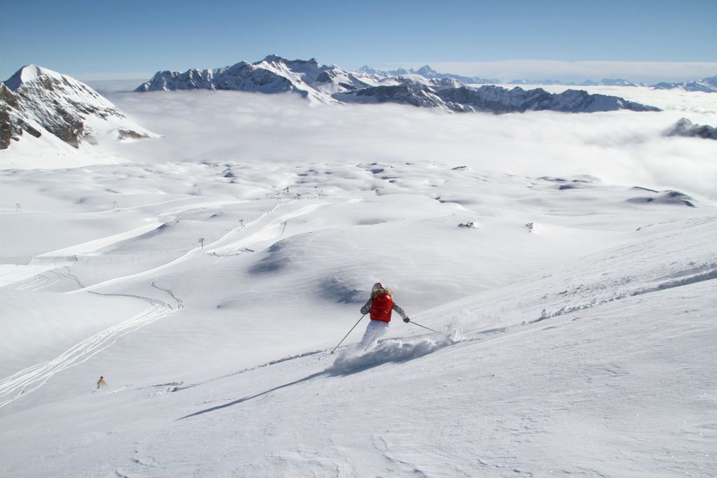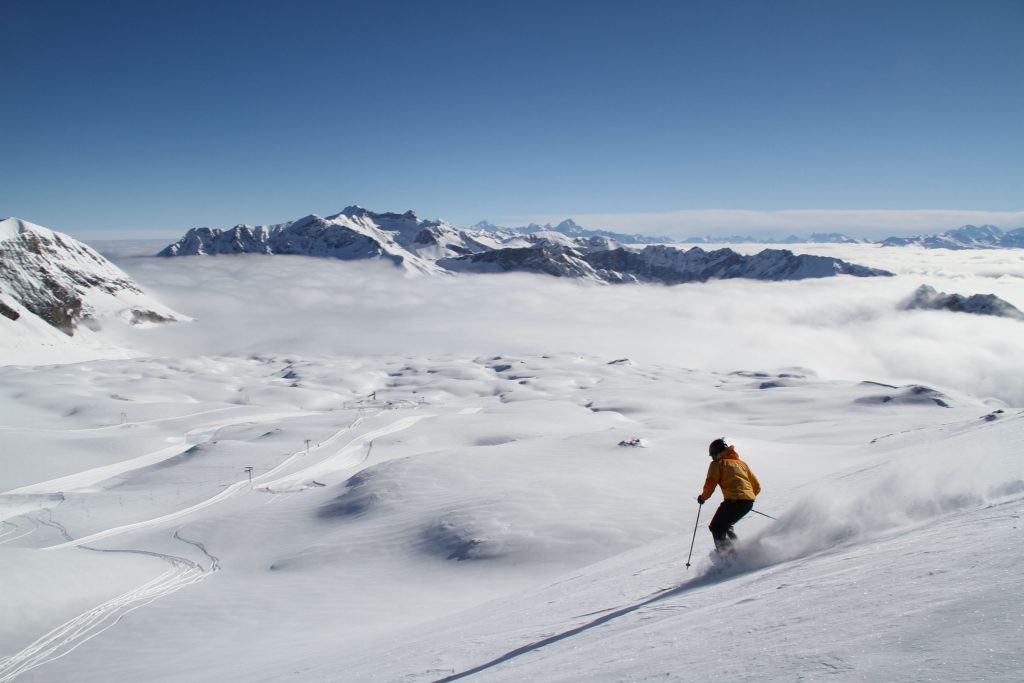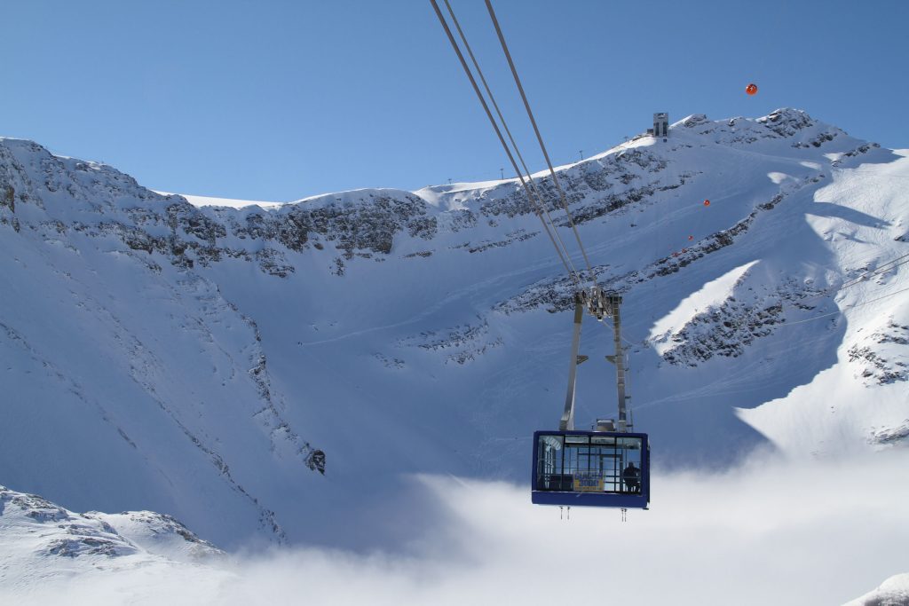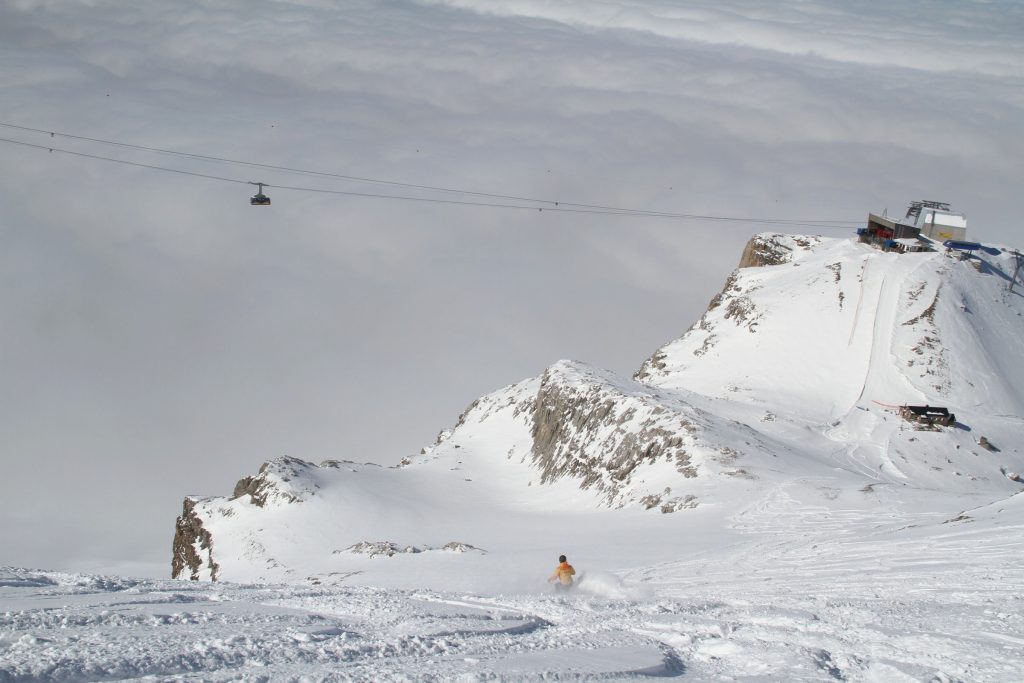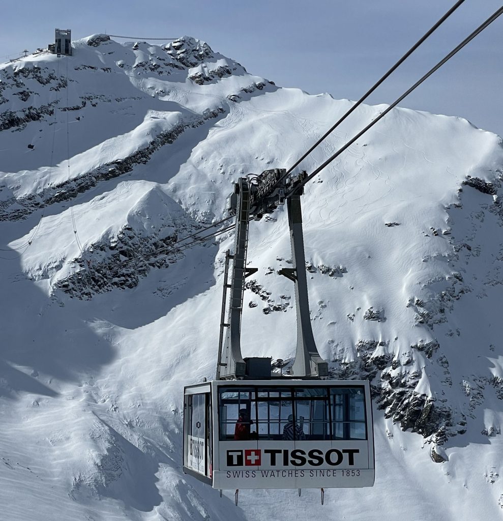 As Glacier 3000 name implies, this is Swiss “Glacier” skiing, at 3000-meters, almost 10,000’ in elevation. With such high elevation in the Alps, Glacier 3000 has a long ski season – often October to May, and spectacular views from the summit. What’s especially cool about the Glacier skiing here, pardon the “cool” ice pun, is the mountaintop skiing on a high plateau with vast intermediate terrain – not too steep or difficult. Because it’s glacial, mostly served by T-Bars. There is more expert and even extreme free-riding skiing as you descend from the summit back toward the base, off-piste. You’ll see paragliders and kite skiers launching into the wind from the summit – which is crazy!