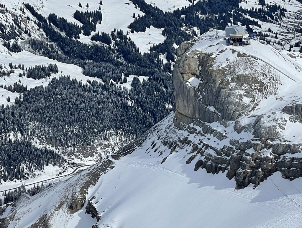 “The Black Wall”, a new tunnel at Glacier 3000 brings you through the mountain (seriously!) opened in 2023 from mid mountain to a ski trail towards the base of Col du Pillon. Other options are to download the Tram or to ski the off-piste run under the tram, but that’s tricky, steep at the top, with a narrow cliff passage in lieu of the tunnel.