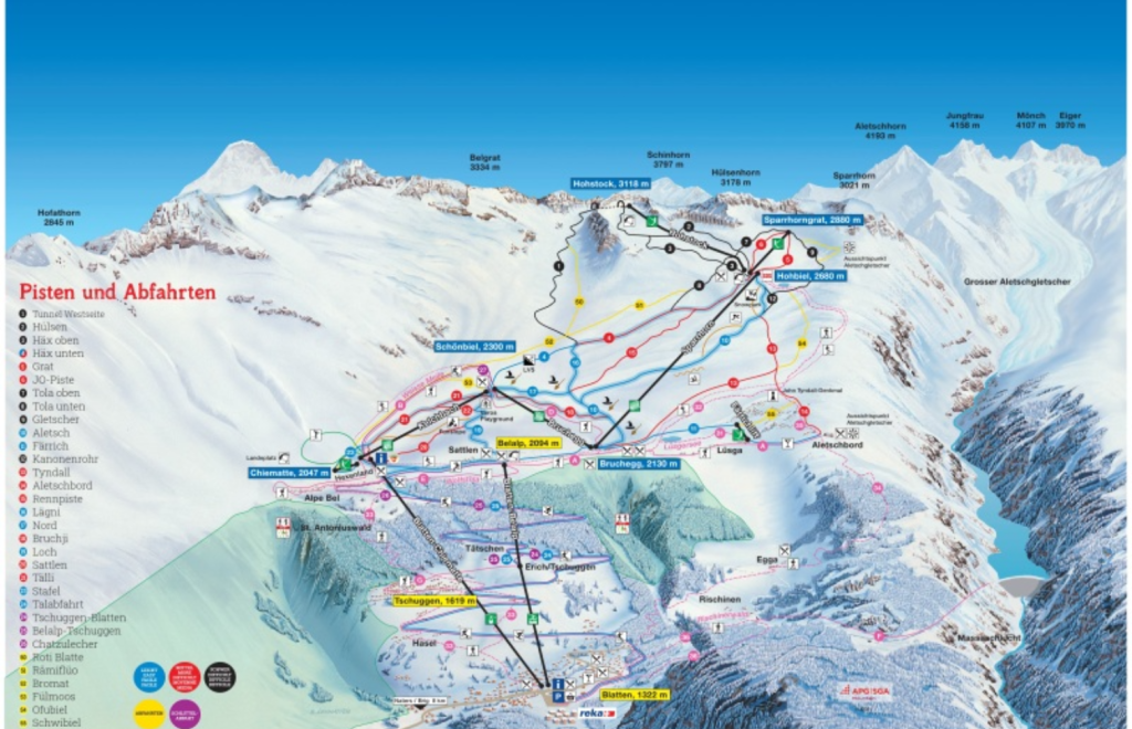 Belalp-Blatten is a mid-size ski area located in Valais (Wallis) Switzerland above the village of Blatten bei Naters. Belalp is very close to the larger Alestch Arena, in fact you can see the slopes of Reideralp and the magnificent Aletsch glacier from some of Belalp’s slopes. On a clear day, you can also see the Matterhorn of Zermatt, and too many stunning mountain peaks to begin to count.