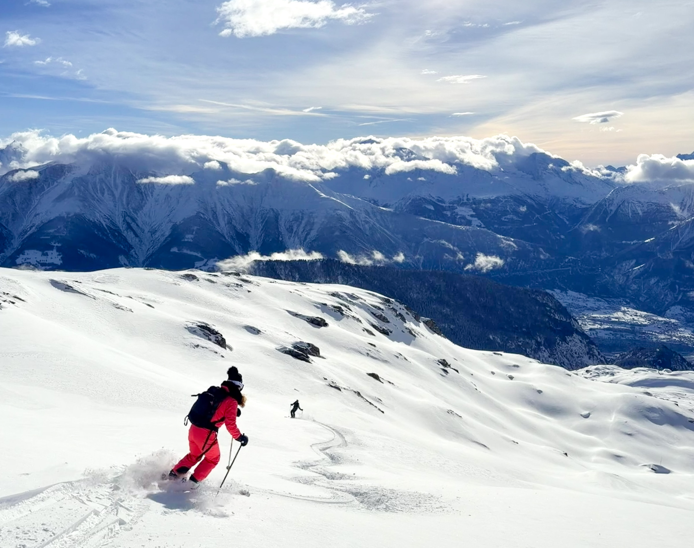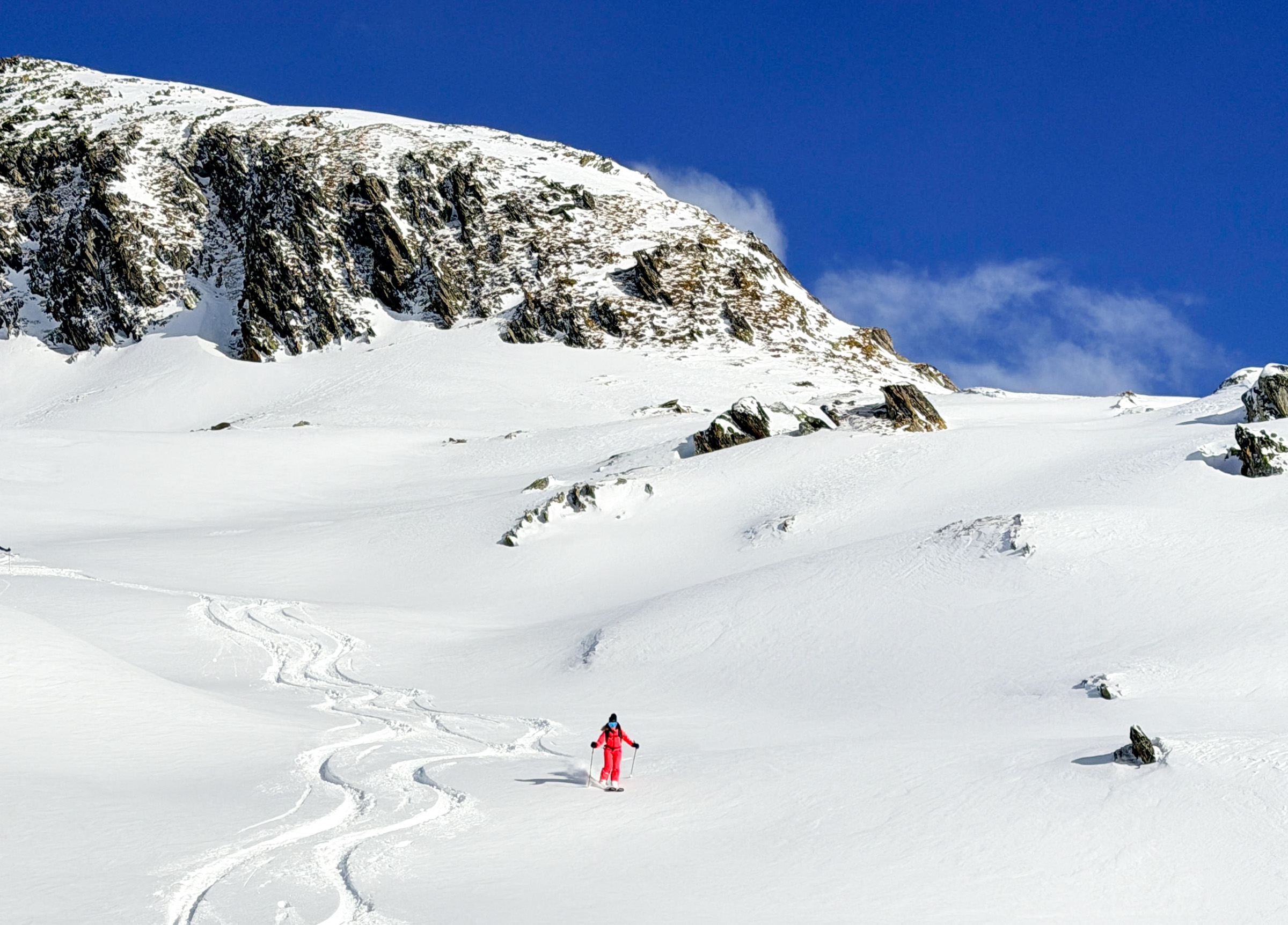 Much of Belalp’s ski slopes are south-facing with stunning views of numerous 4000+ meter peaks, including the Matterhorn, the Dom and Weisshorn The high elevation of Belalp-Blatten, especially the Sparrhorn and the two steep summit T-Bars Hohstock at 10,230’ and Sparrhorngrat, makes it very snow-assured. The upper mountain has loads of off-piste skiing, easily reached, but also dotted with rocks, ravines, and avalanche risk, so beware.