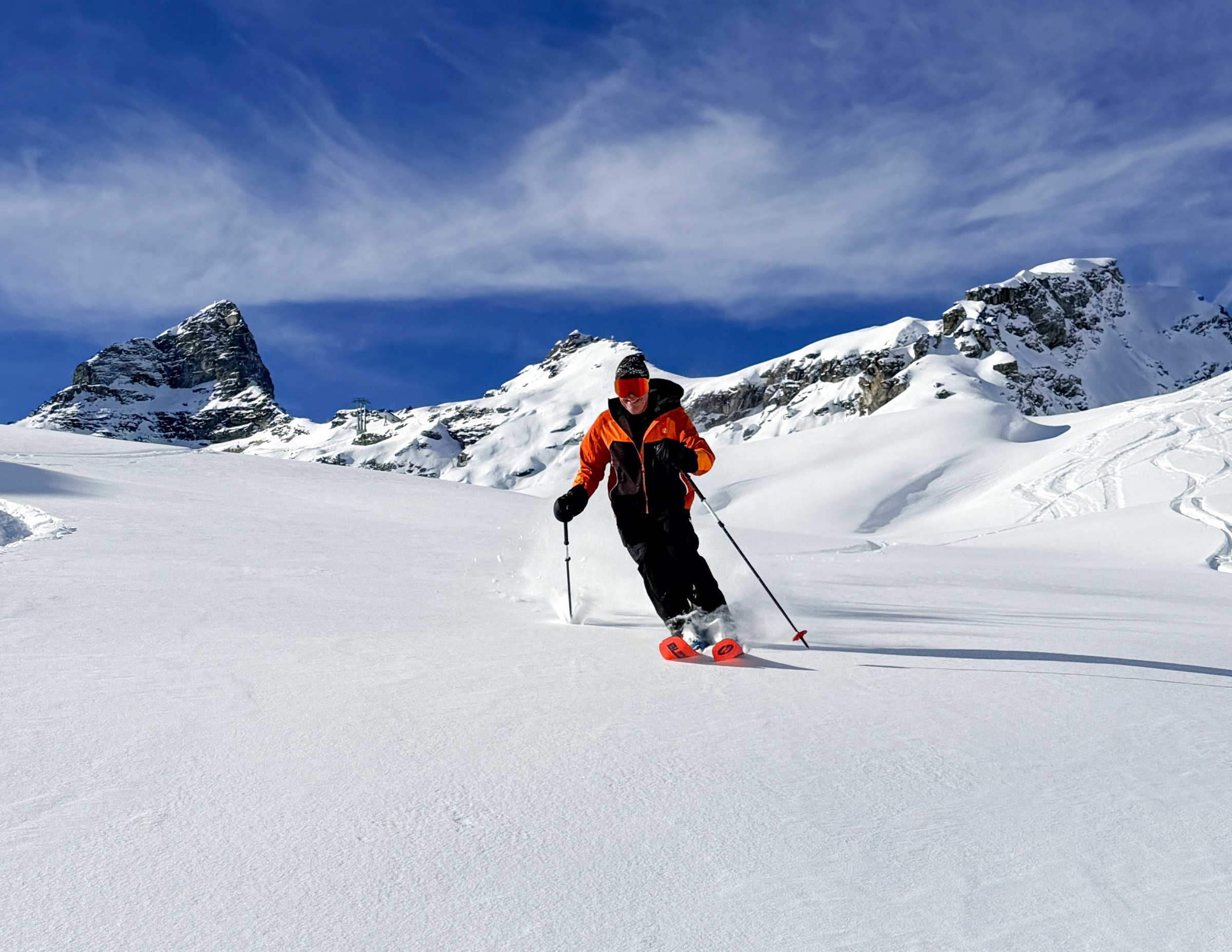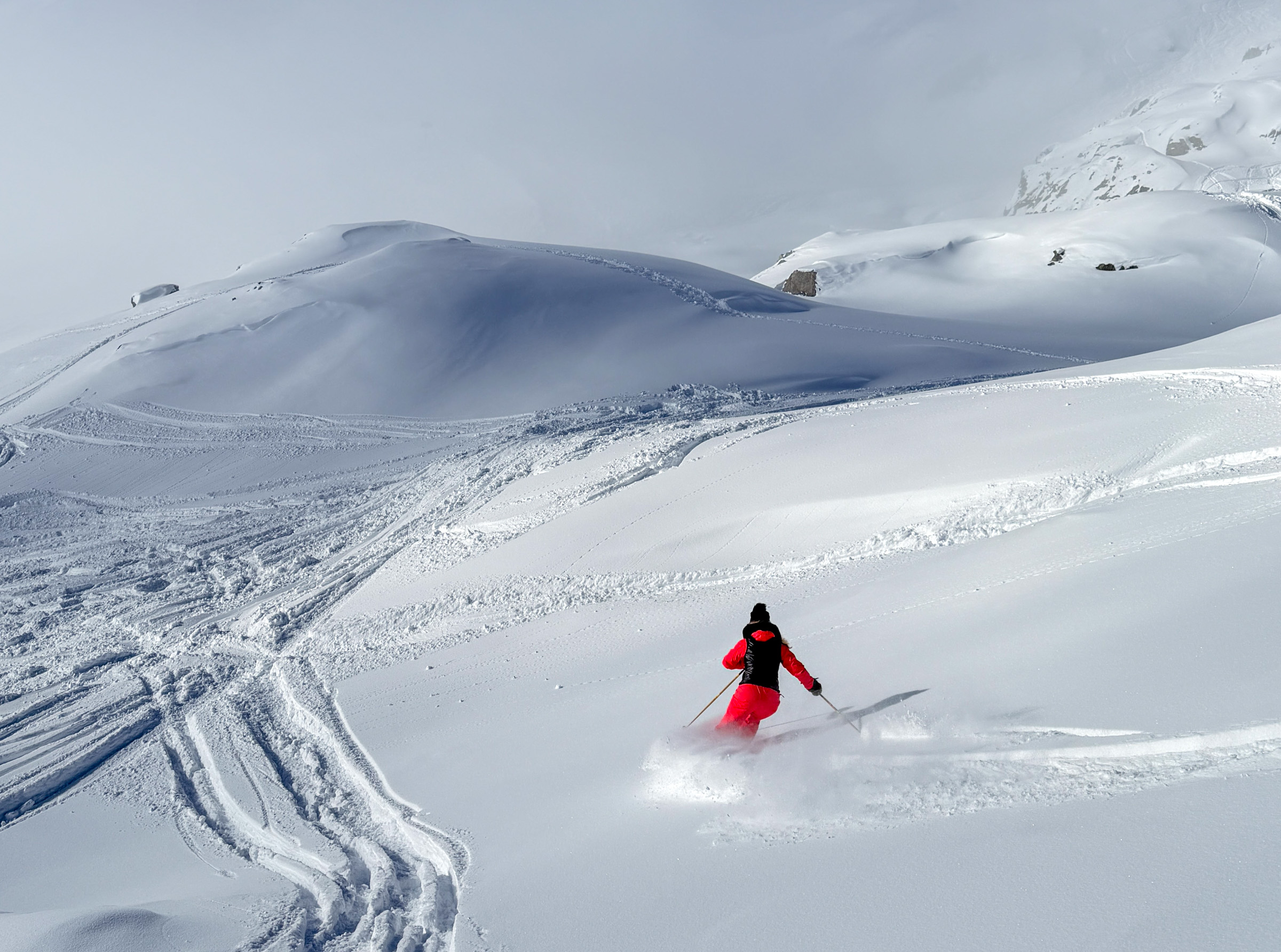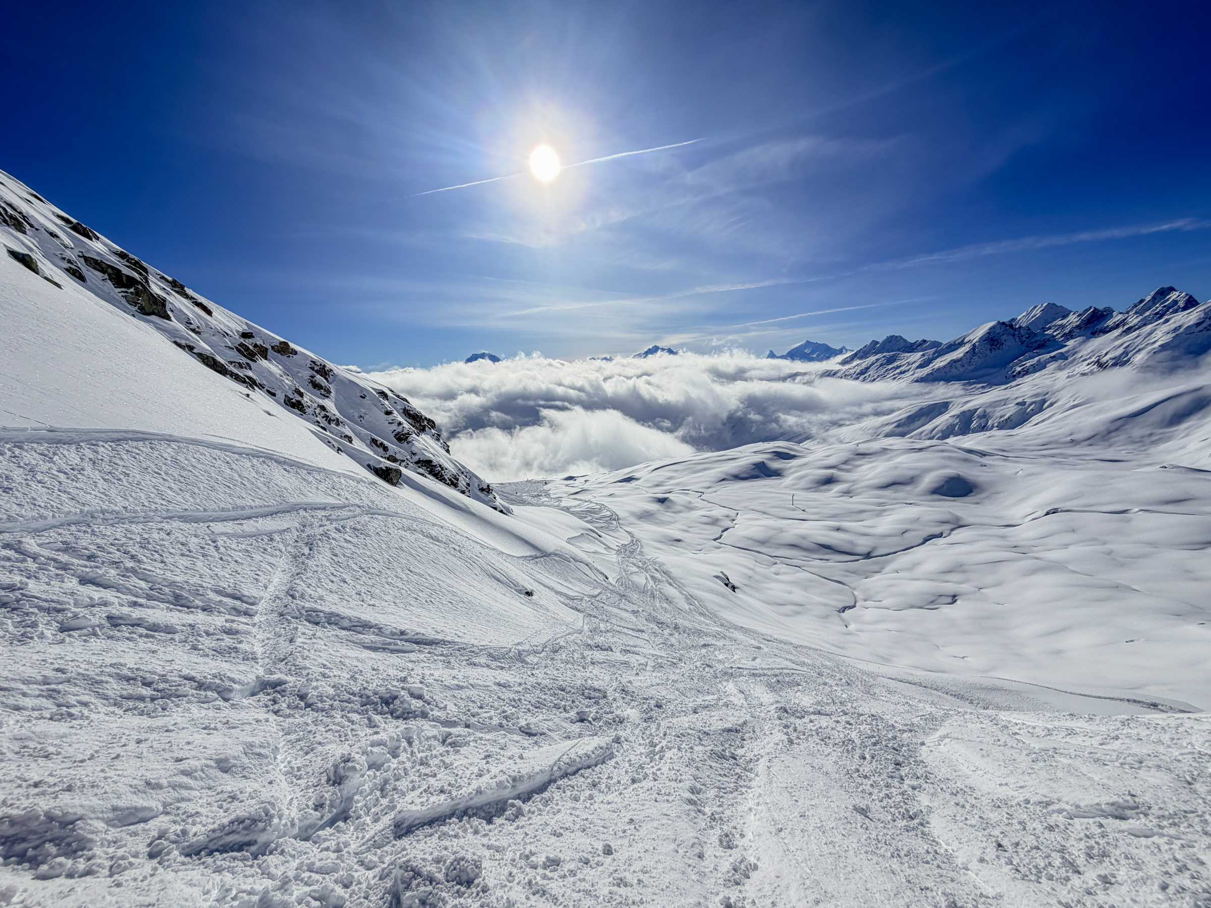 An Aerial Tramway and a Gondola access the Blatten/Belalp Ski area from the base village. Belalp sits at 2094-meters, it takes 2 chairlifts and a T-Bar to reach the Hohstock summit (3118-meters) 10, 230′. Most of Belalp’s upper mountain skiing is from the Sparrhorn bubble-covered six-pack lift, which accesses a few great trails, mostly low angle – and a huge playground of freeride terrain. My favorite prepared piste is Aletsch, #10 – its a ten and named for the famous local Aletsch glacier (smaller every year but still the largest in the Alps), this trail is scenic and feels so far from the rest of the resort.