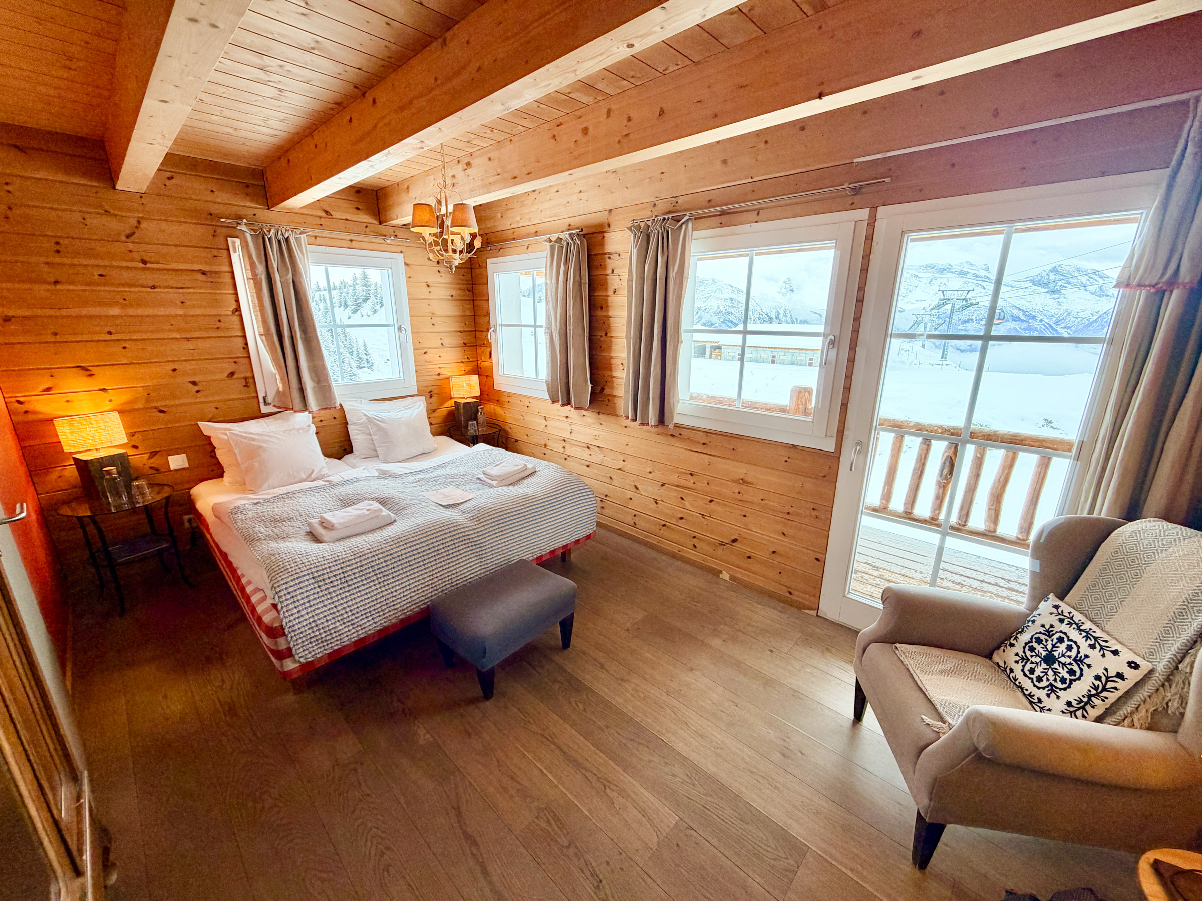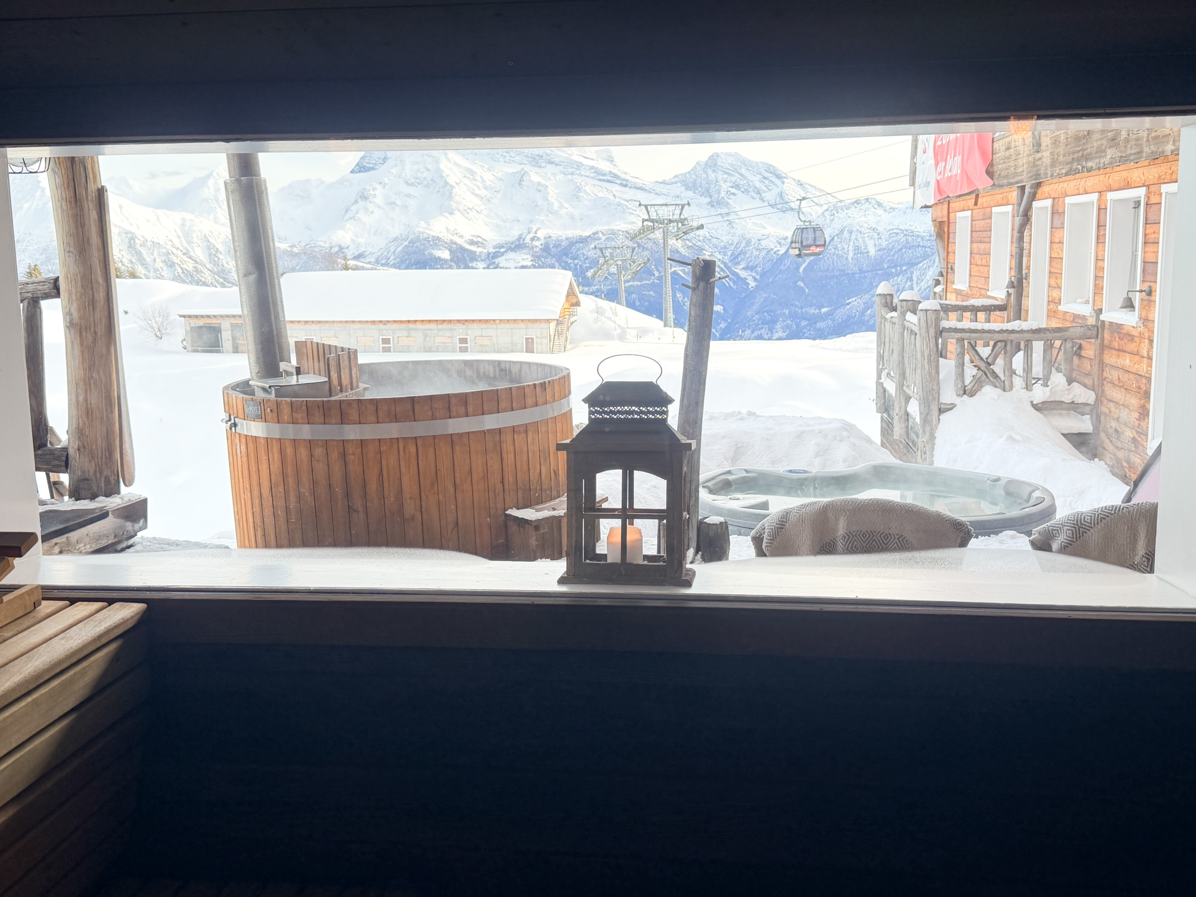We loved our stay at Hamilton Lodge, arriving here with our gear by Gondola, on skis, we packed light for skiing après ski, and enjoyed being on mountain while most skiers descend down the mountain by skis, gondola or tram at 4pm. Our cozy alpine themed room had a balcony with a view of the gondola. Hamilton’s spa can be reserved après ski for sauna and outdoor hot tub. For apres ski, you can enjoy the chalet’s fireplace lounge and living room by the restaurant – which is open to the public. Our plentiful breakfast buffet was included in our room, evening dining is a la carte- we enjoyed the food here very much, from traditional Swiss fondue to Chef’s entrees. We especially loved being able to walk from our room in slippers to the bar and lounge, breakfast and dinner, while it snowed outside! The quiet starry nights from our balcony were magical!