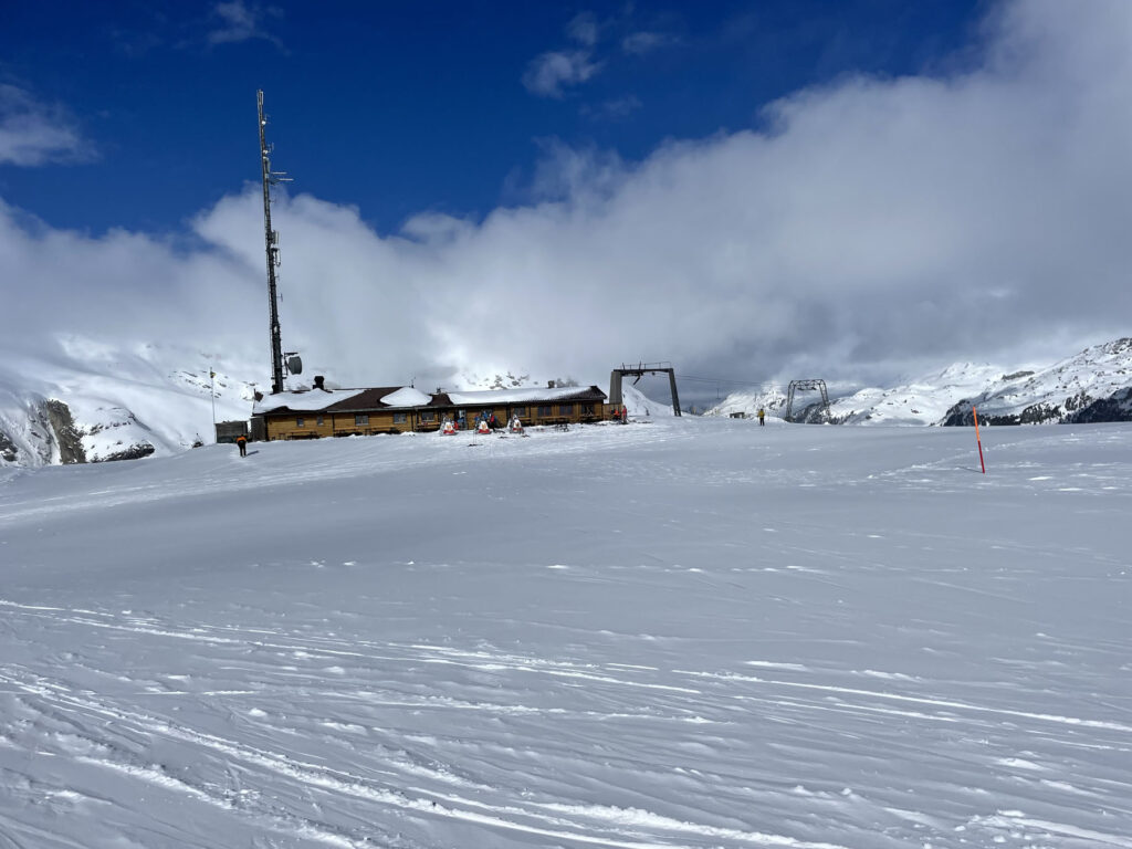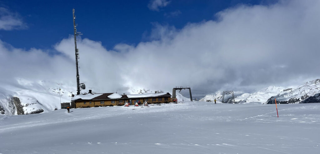 Lunch at Bivio, the mid mountain Camon lodge offers self-service style cappuccino or humble soup du hour or pasta and fabulous daily specials – rösti, lasagna. Its cafeteria style but homemade and friendlier than your average base lodge, with a fireplace, wood tables and a view from the comfy chalet, or the sunny deck.