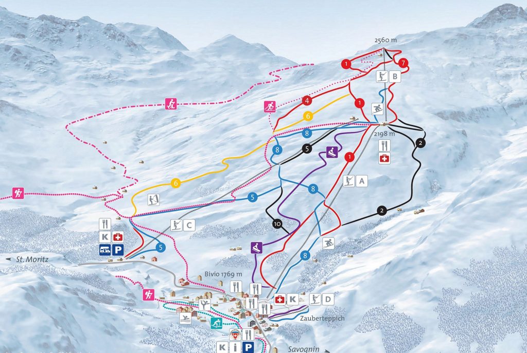 The skiing at Bivio is simple – 4 ski lifts, all T-Bars, accessing an astonishingly large and expansive area. 3 very long T-Bars and one learn to ski T-Bar. El Cant, Tua and Camon T-Bars get you to an impressive 2,595’ vertical, and 12 ski runs, named and numbered accordingly. With 80- kilometers of prepared, groomed and marked, ski runs in Bivio are ideal for young families. There’s a fun park, a ski school, and a relaxed vibe, with just one mid mountain lodge – Camon, and a Pizzeria at the base of Tua.