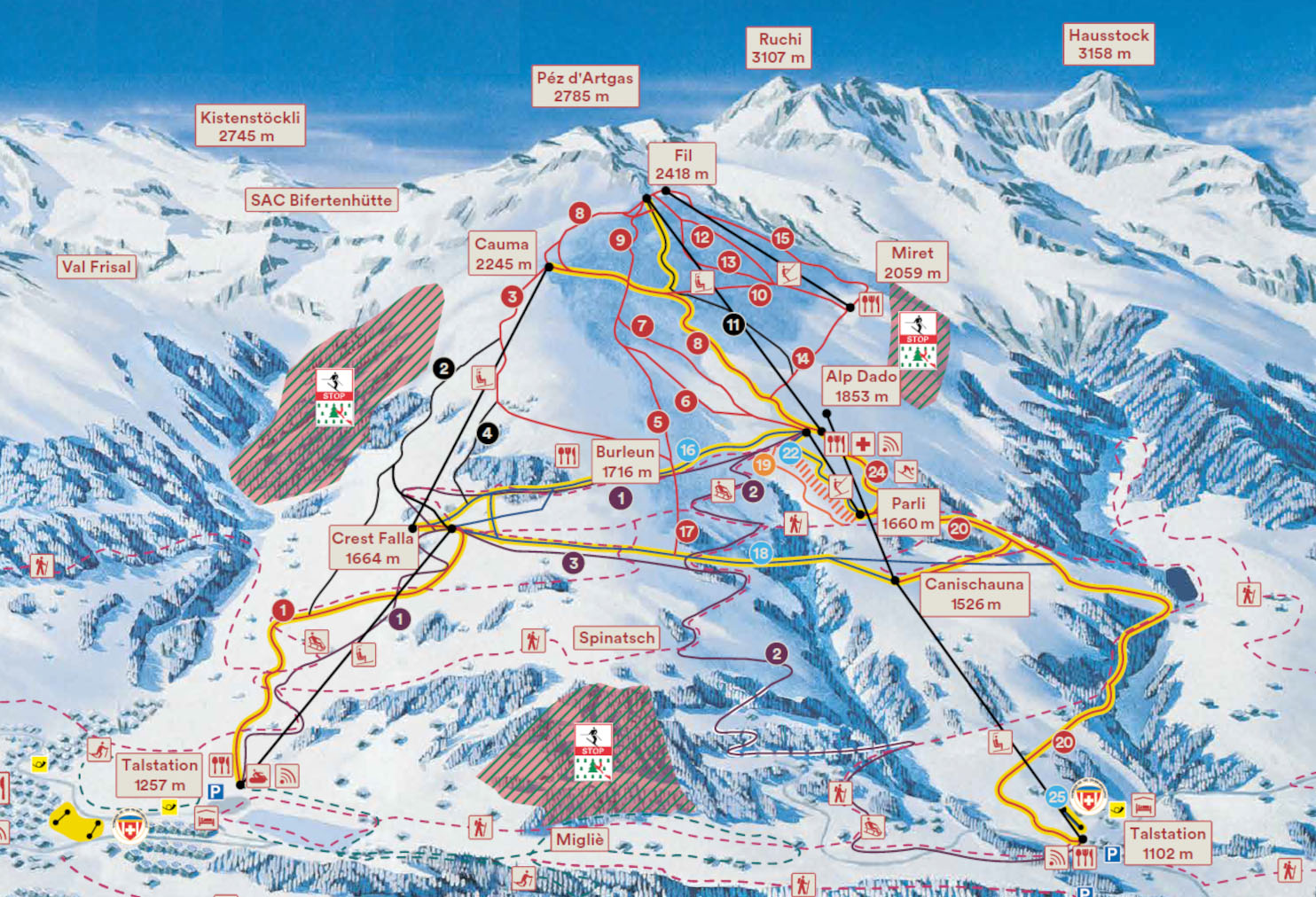 Brigels’ 11 lifts serve 28 pistes – big wide gently pitched trails with boundless free riding (off-piste) between the prepared trails. Brigels’ elevations is 1,102 – 2,418 m (7,933’) and a very respectable 4,318′ vertical drop of primarily above-tree-line skiing. The south facing slopes earn it the slogan “where the sun likes to shine”. Which of course means Brigels can get sunbaked in warmer weather. The ski resort connects the slopes on Pez d’Artgas mountain between the villages of Brigels, Waltensburg and Andiast. Winter wandering – hiking on snow trails, and sledding are super popular here for the non-skiers that want to enjoy the alpine forest and high plateau sun and snow fun. Brigels has several on mountain chalets with grand sun decks for lunch.