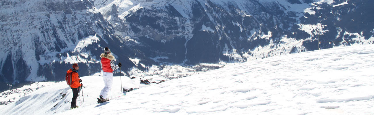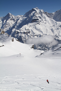 Kleine Scheidegg-Männlichen ski slopes are in the center of Jungfrau’s skiing above Grindelwald on one side and Wengen on the other. This Jungfrau ski area offers skiers modern ski lifts and 110 kilometers of red and blue prepared trails for intermediate and advanced skiing.