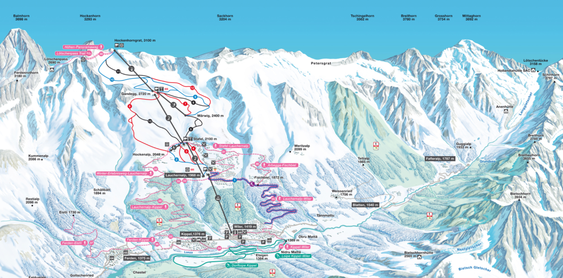 Lauchernalp has just 13 trails, but they are fun, long, interesting and undulating terrain, well-groomed. The terrain is steeper than nearby Belalp Blatten for example. Corwds mid week are non-existent, while prime weekends you may encounter a small lift line of mostly locals and folks from nearby Bern.