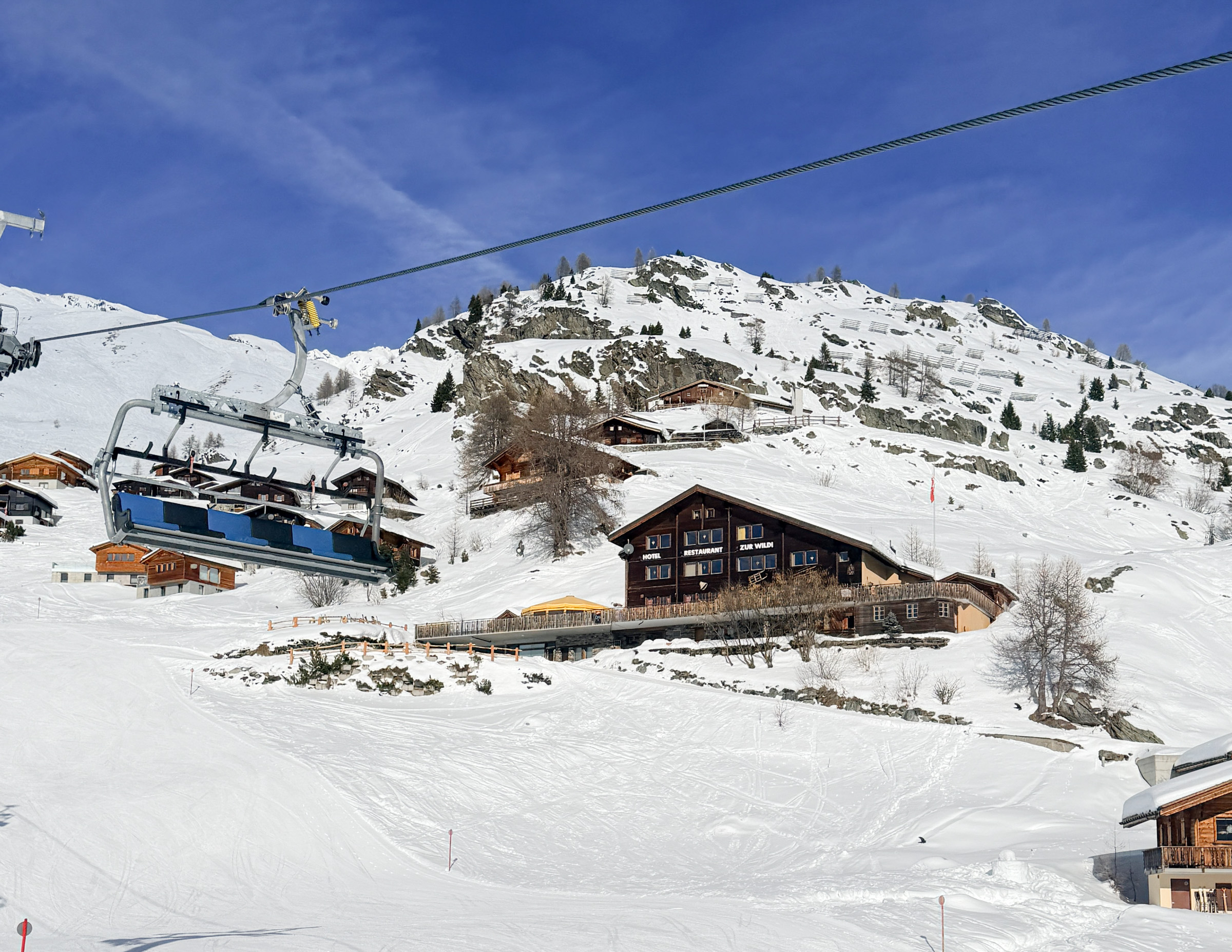 Skiing to the base village of Wiler, is a long, 4-mile, ski run shared with winter wanderers and sledders, with a dozen switchbacks. The winding trail ends at the far side of the Village of Wiler, so it’s a 15-minute walk through the rustic chalet village, back to the Tram or the paid parking (about $8 Swiss francs per day).