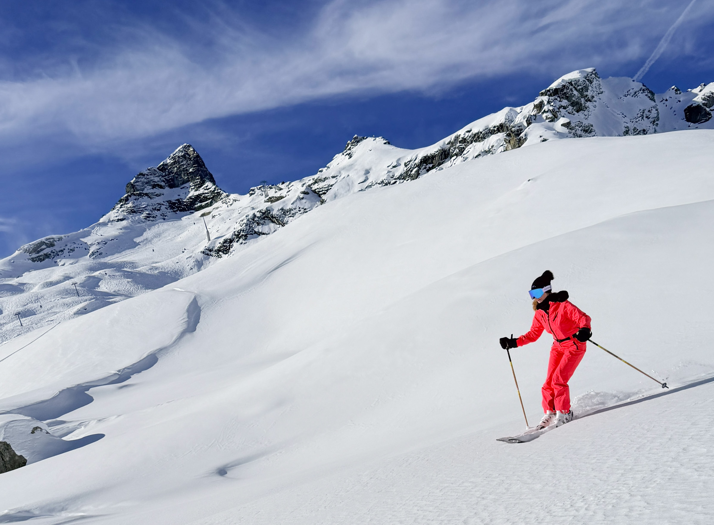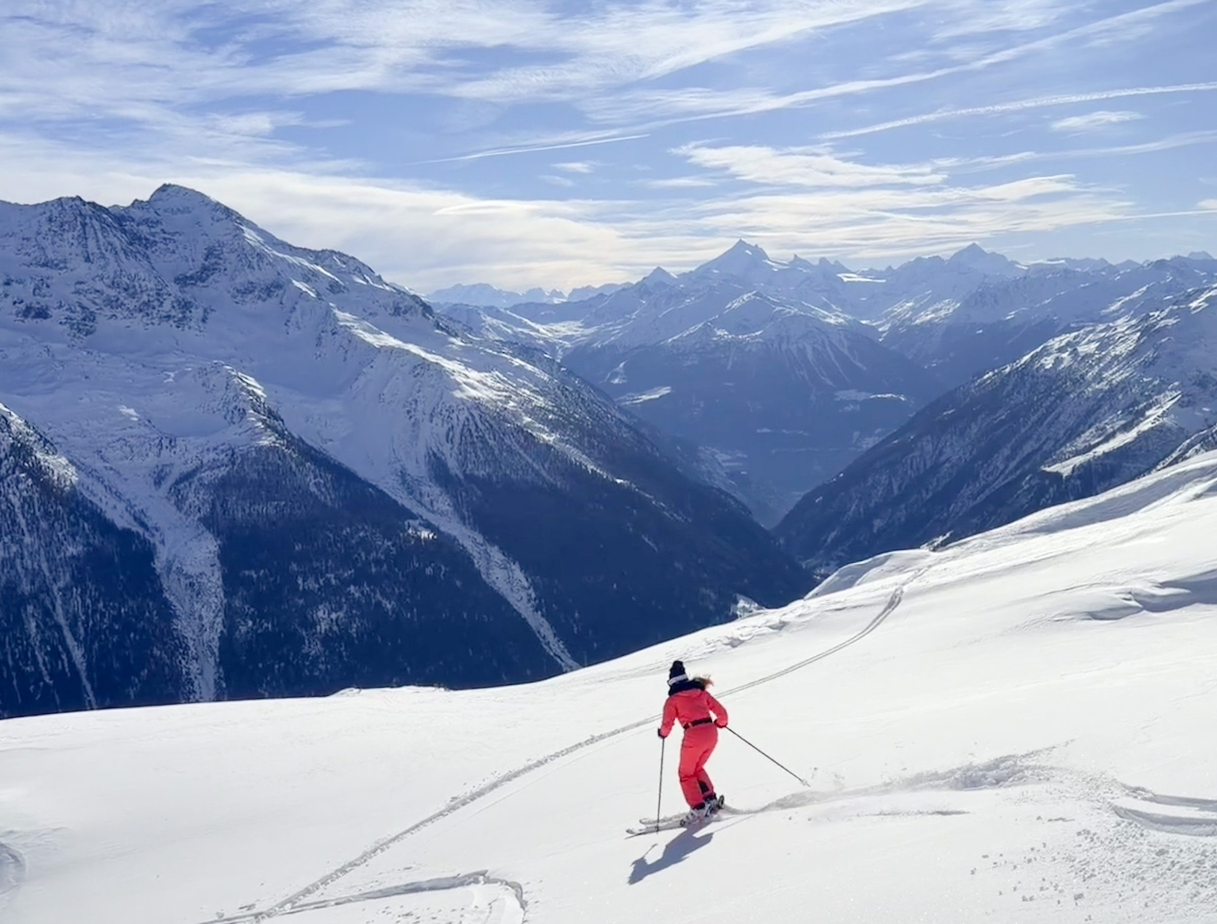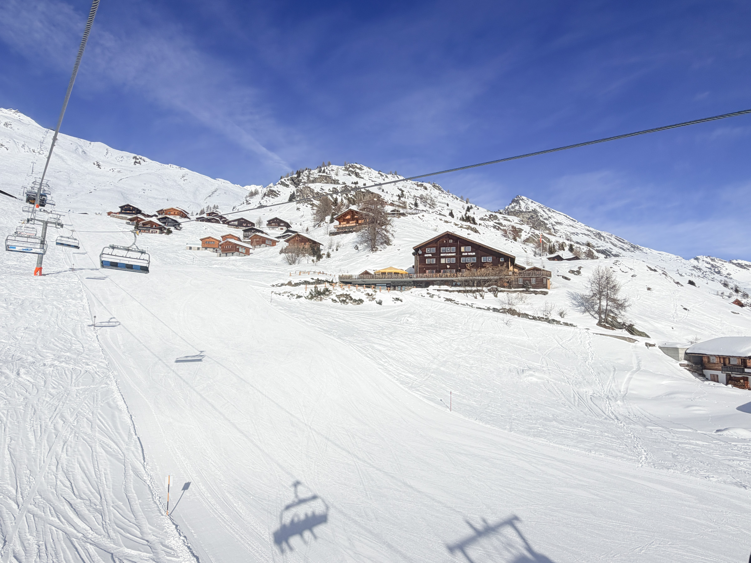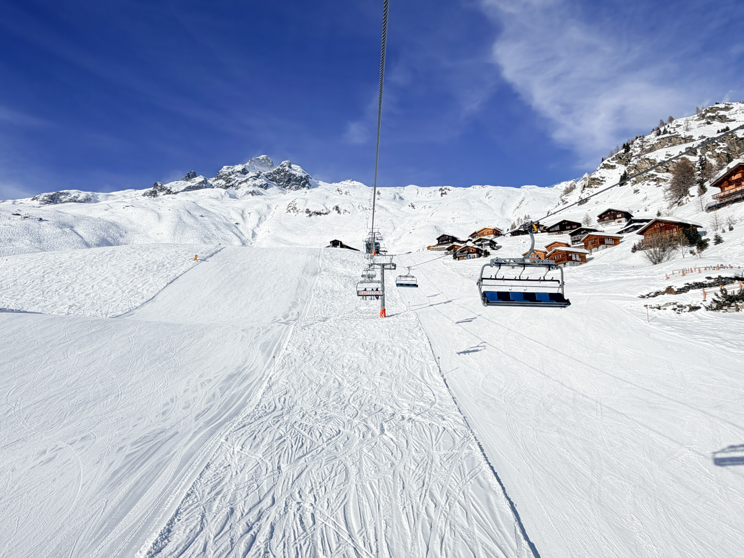 Charming ski-to huts and chalet restaurants for lunch or a drink include Berghaus Lauchernalp – just below the T-Bar – you can traverse out to this special historic spot. They serve the best wood-fired pizza in the Swiss alps, with an amazing view too! Restaurant Bargsunna chalet just above the Tram and six-pack chair has a sunny terrace and an amazing alpine cheeseburger among other offerings. Bargsunna is a great spot for après ski too at Lauchernalp before you ski a few turns back to the Tram to download to the village, or ski to your on-mountain chalet.