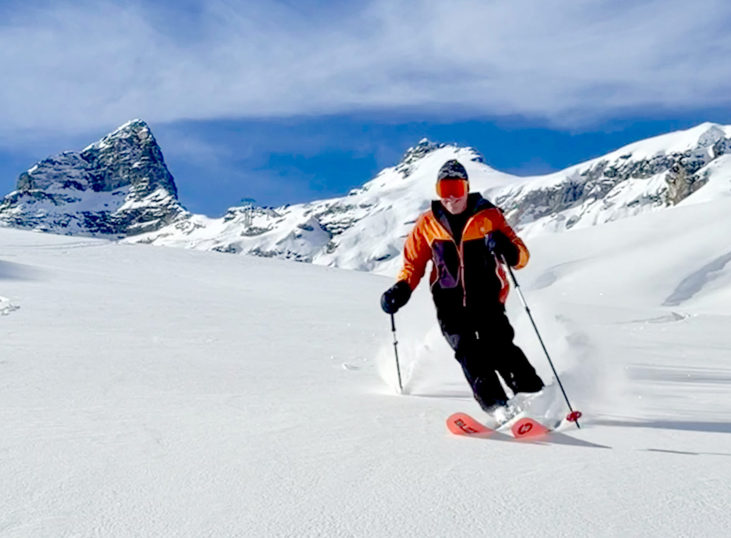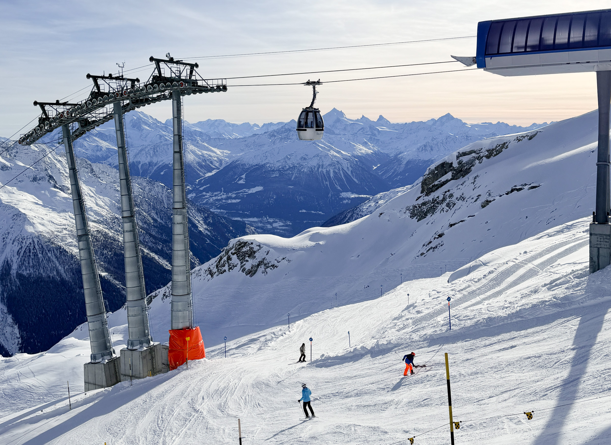 Skiers take 4 lifts, the Wiler tram to a six-pack, to a triple to a summit gondola, to access Lauchernalp’s Hockenhorngrat summit (3100-meters) at 10,170′ to get the full ski experience. Its over 5,500′ vert if you ski from the “tip top” as the Swiss say, back to Wiler village!