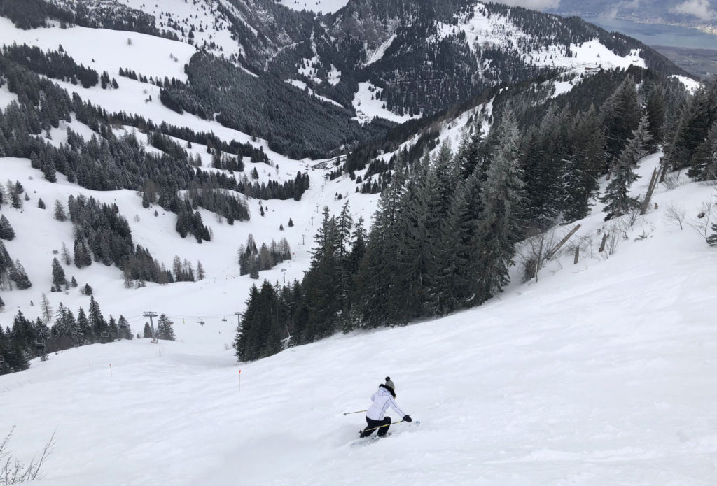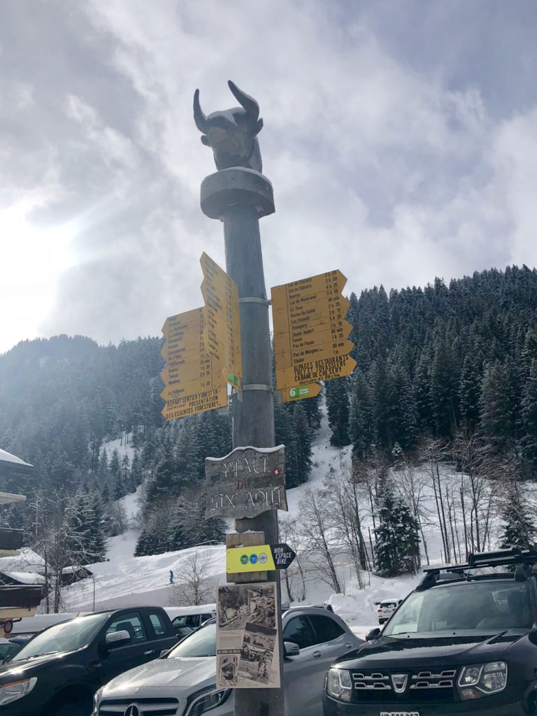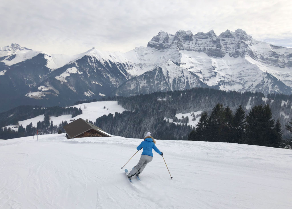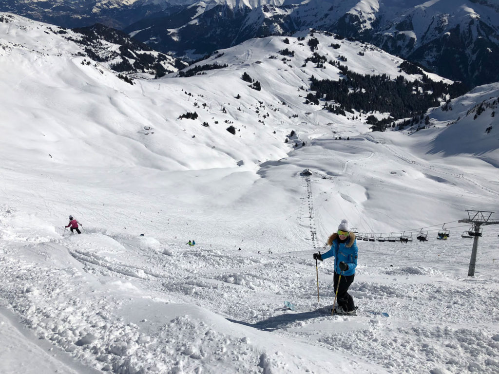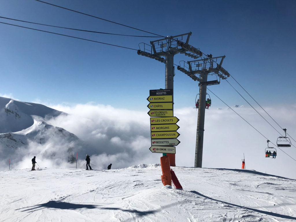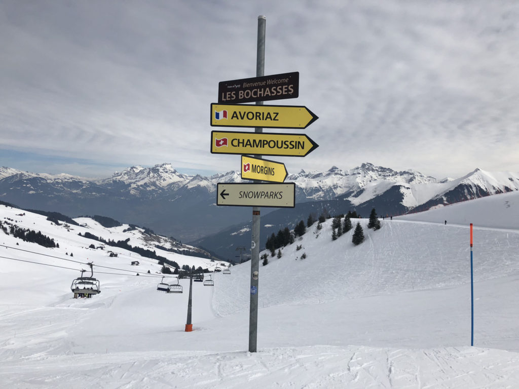 We preferred the Swiss ski terrain and scenery, the Region Dents Du Midi, with far lesser crowds than the French ski resorts – especially the ski slopes of Champoussin. Given its proximity to the grandeur Verbier, Crans Montana, Saas Fee, Zermatt and more, few Swiss ski here. France’s Avoriaz and Châtel are among the busiest, given the quantity of lodging and high capacity lifts. Its wonderfully fun to ski “cross-country” back and forth with ease. The French/Swiss borders are marked and the signage is helpful pointing you to the next ski villages. Don’t expect good signage on the pistes however, they barely have trail names, just numbers and designation of difficulty – green, blue, red, and black, then yellow (expert/extreme). The two or three prepared pistes (groomed) off each lift are lined with intermittent bamboo poles on each side, you could easily ski between poles and be off a cliff, so pay attention to this mostly wide-open above-tree-line terrain. When it’s foggy, snowing or white out, it’s especially challenging.