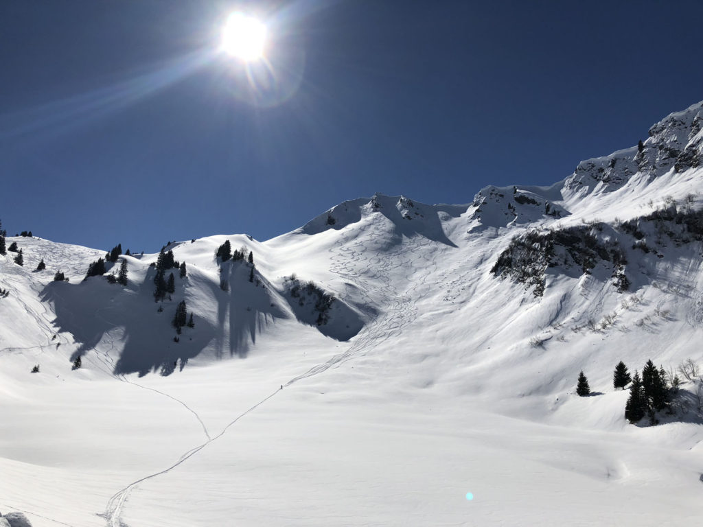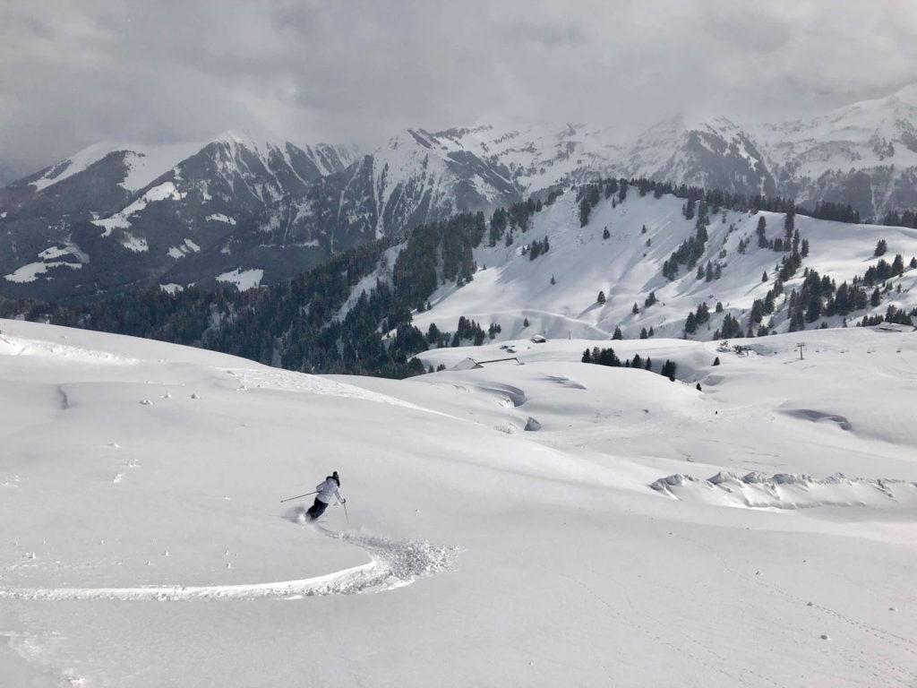 Portes Du Soleil off-piste is off the hook, in every direction between the prepared runs. Wide open gently pitched powder fields, many of them cow pastures in the summer, to steep avalanche prone chutes loaded with windblown snow. You could have a blast here, and you could get into grave danger – read: hidden cliffs, crevasses and sudden slides! To explore the vast off-piste, hire a guide, and you can score long gorgeous untracked runs comparable to heli skiing in Canada. In these Alps however, if you see a helicopter, its for a medical evacuation, so take out the insurance and ski with care on the busy ski trails and intersections, and especially when skiing outside the marked patrolled pistes.