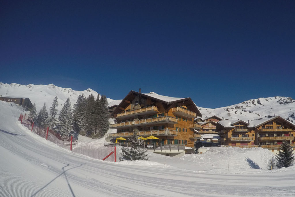 Les Crosets is an ideal lodging spot, a nice size ski village, with key lifts that deliver you to the border, at Point Mossette you can drop into France, or ski the Swiss side. The Mountain Lodge is the best chalet, perfectly located by a poma lift, with modern but cozy alpine décor, and views of the ski slopes from most every suite balcony. The cuisine is delicious, and everything is geared toward skiers from the ski and boot room, to the hot tub and spa, to après ski at the bar and fireplace living room.