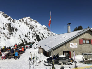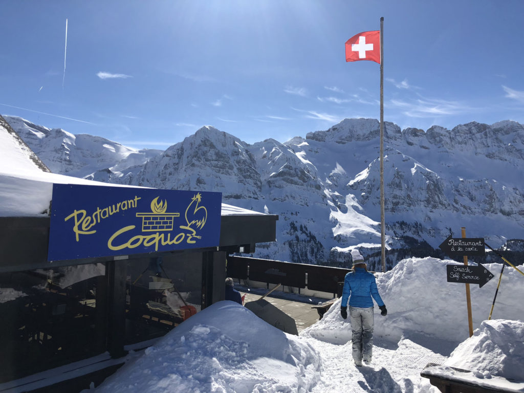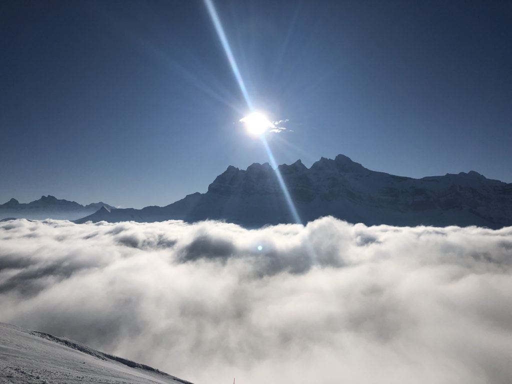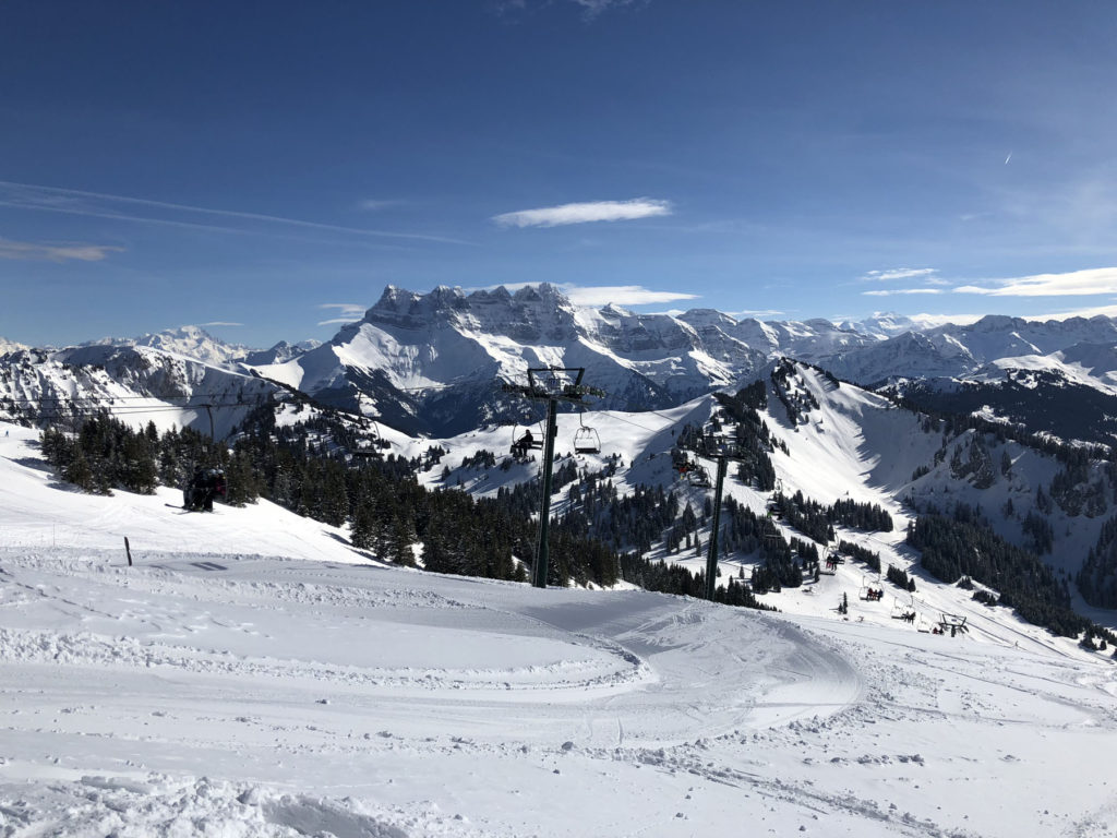 We recommend skiing off the PDS tour, instead exploring less-tracked ski trails and enjoying the scenery on the Swiss side, with less crowds than the busier French ski resort towns of Avoriaz and Châtel. We particularly like the ski slopes of Champoussin, served by two quad chairs and three drag lifts (Poma & 2 T-bars) with amazing views of the Dents Du Midi – the seven distinct summits soaring up to 3,257-meters (10,685’) which are perfectly lit up at noon, hence the name – teeth of midday.