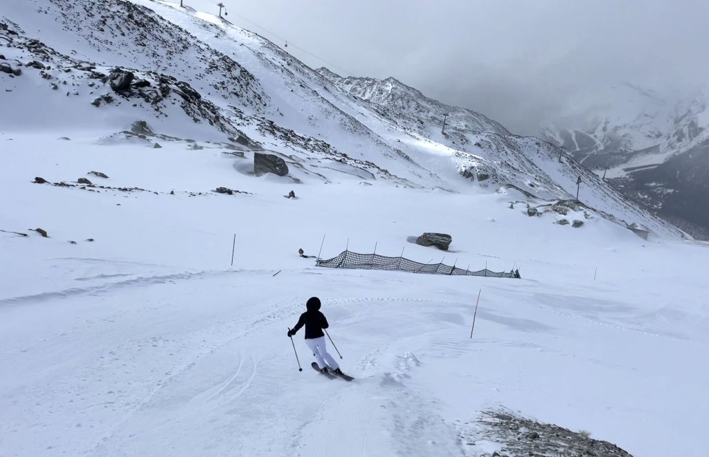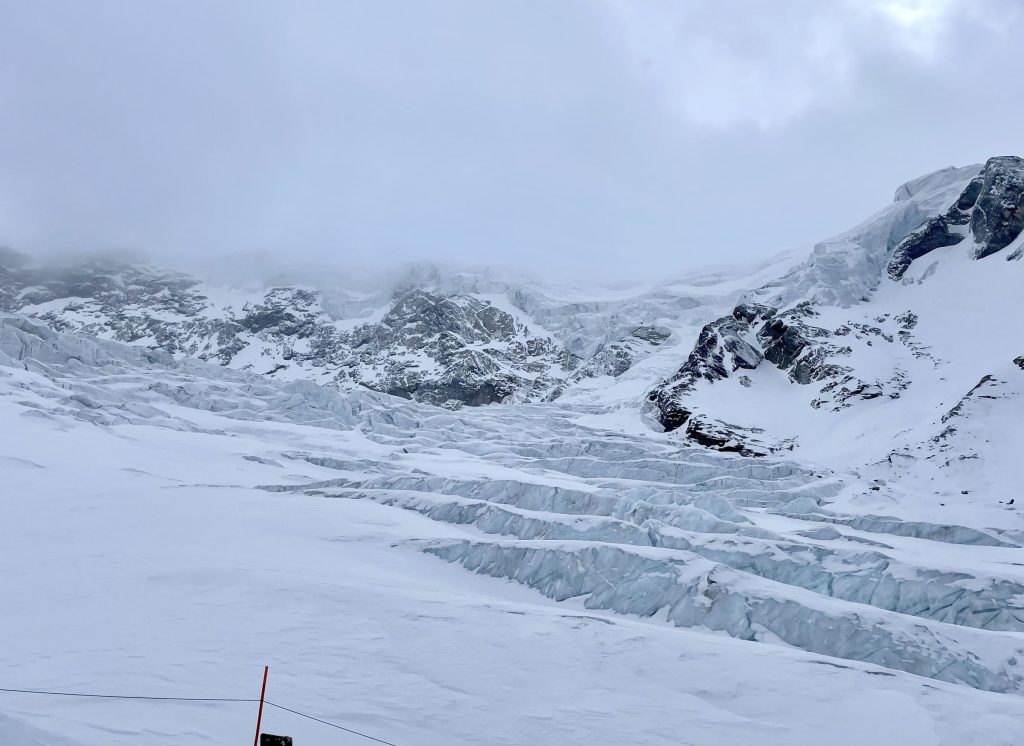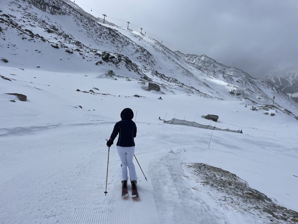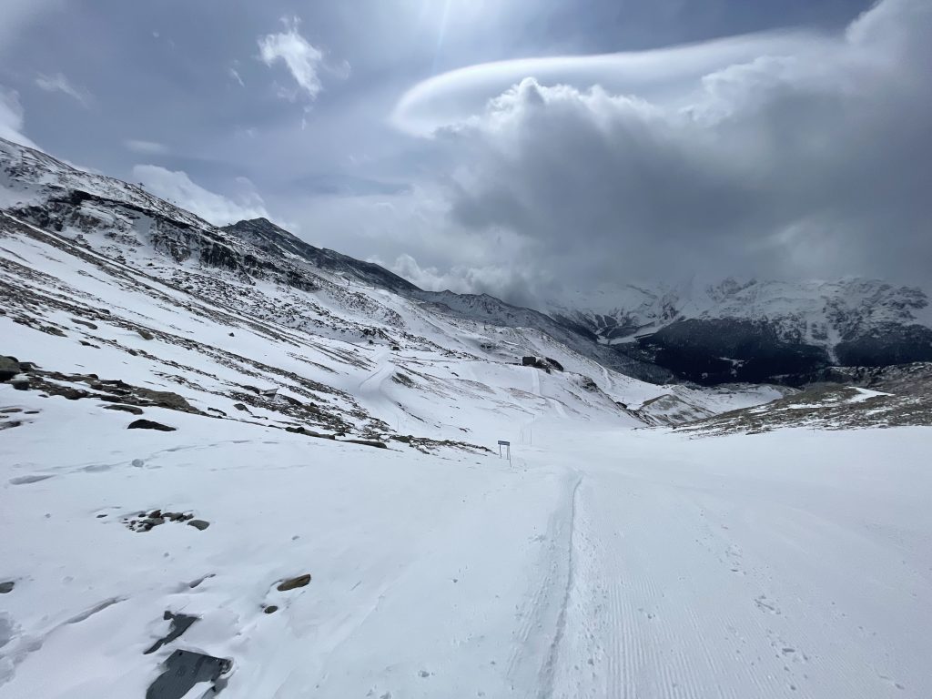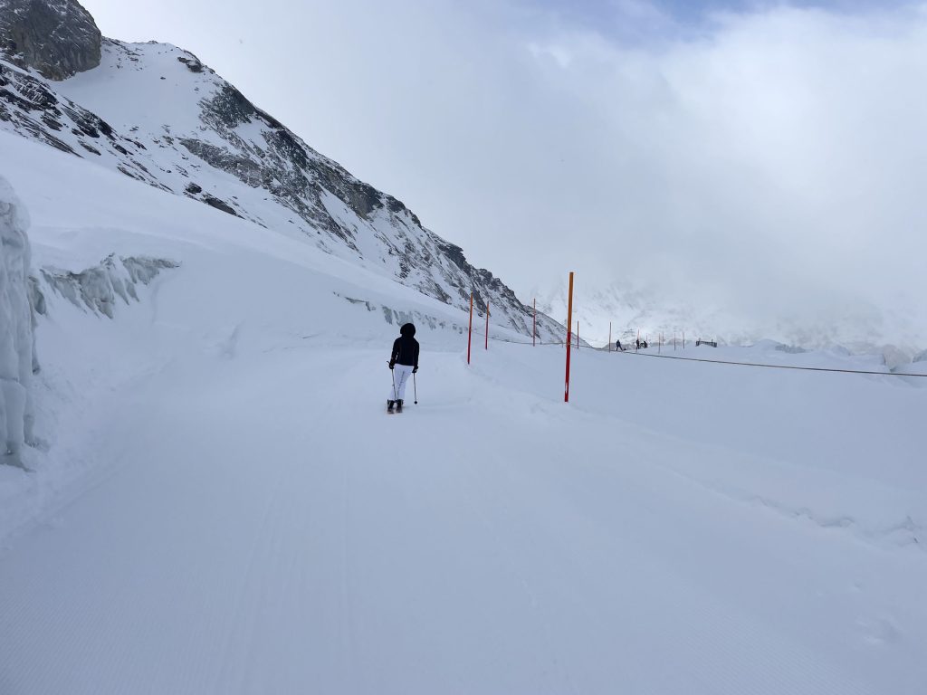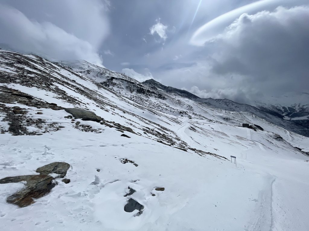 The upper mountain most stunning feature, besides the view of Saas-Fee across the valley and other peaks of 4000 meters, are the glaciers that surround you. With just two trails off Saas-Grund’s summit, plus a yellow (off-piste) route, these runs are long and scenic. The terrain between prepared pistes is wild, rocky, unfriendly. Its actually surprising that there is a ski area carved into this mountain of harsh cliffs, glacial deposits and rock debris. Aside from the few trails, the mountain is quite inhospitable for skiers.