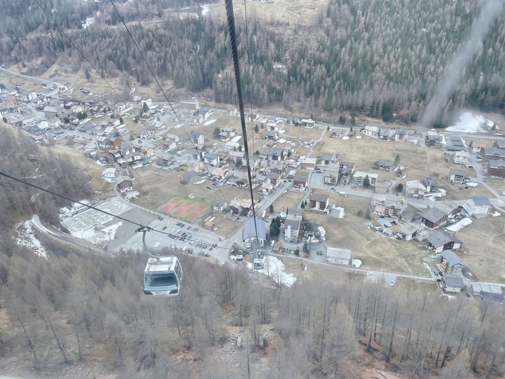 We were unable to ski to the base during our mid-March 2023 visit, not enough snow to maintain Saas-Grund’s lower mountain trail. In fact, the valley floor was verdant green. So downloading the lower mountain gondola at the end of the ski day was our “last run” with a scenic descent to the village.
