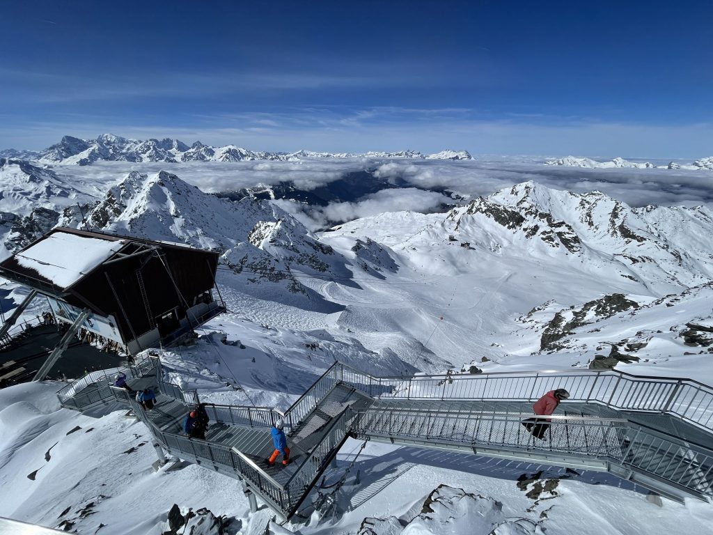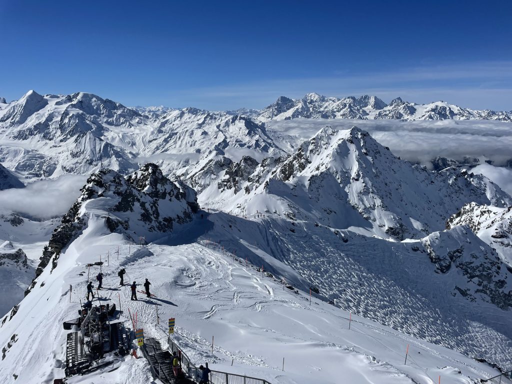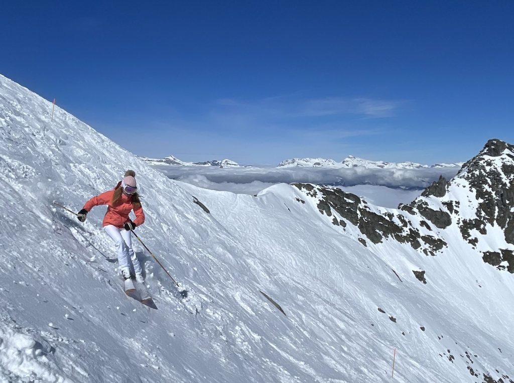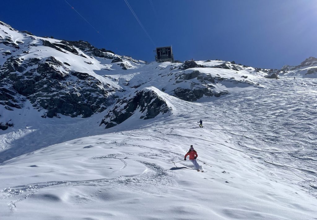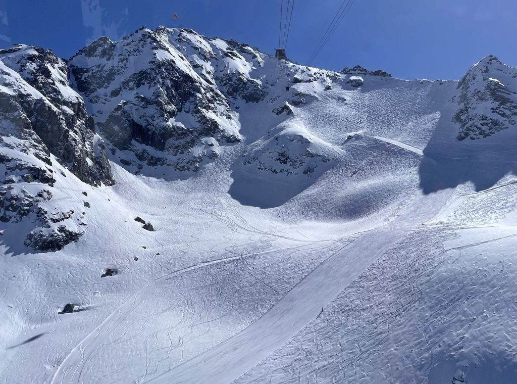 Mont Fort is also host of the Extreme Freeskier World Cup Finals. If you are an expert skier, ski the marked (steep and not-groomed) trail section – otherwise plan to download the Mont Fort tram to gentler mid-mountain skiing.