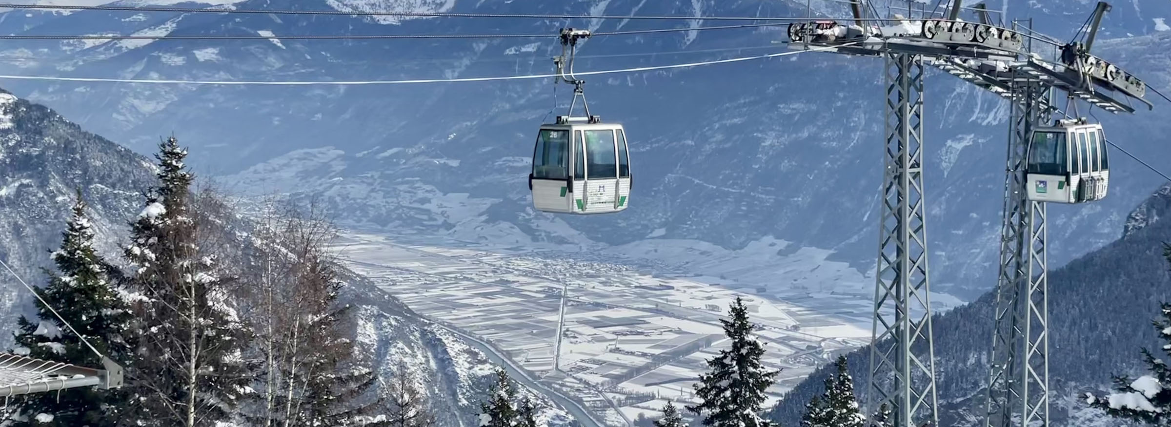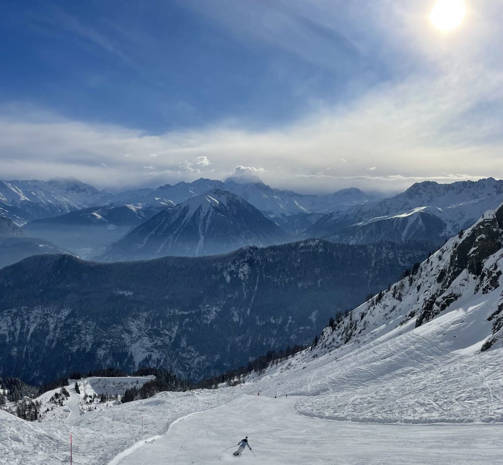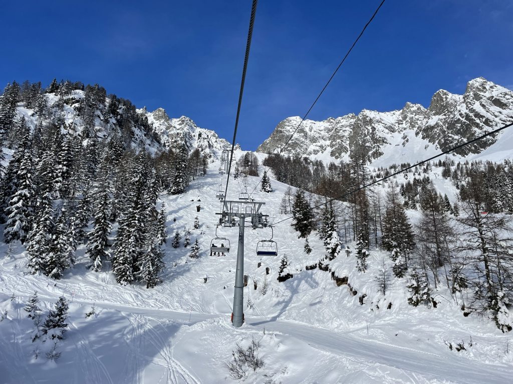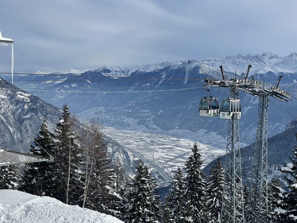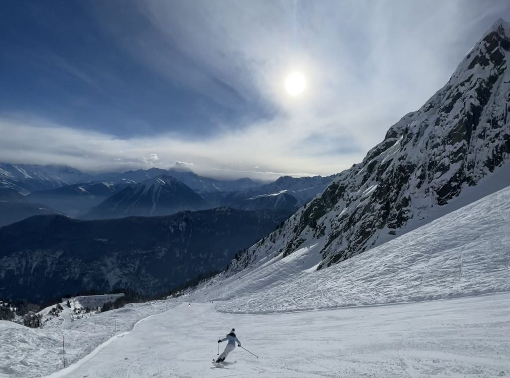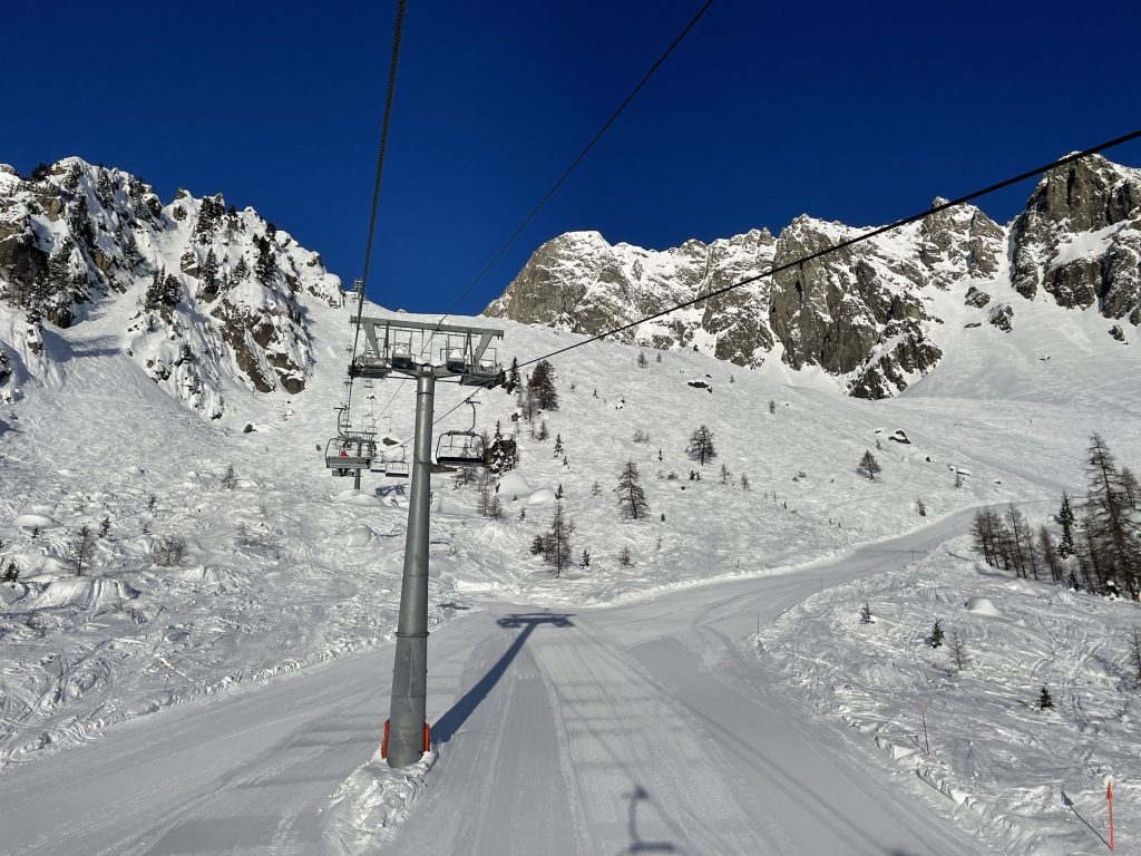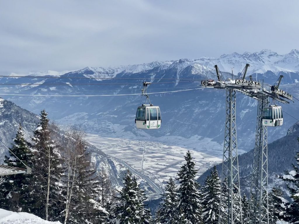 Just one old base-to-mid mountain gondola takes you up from 1,110-meters, a tin-can-of-a-vintage-lift that squeezes in 4 skiers, though its unlikely you’ll have to share on a weekday. The ride up is steep, and steeply scenic. You arrive mid-mountain and ski down to the high-speed quad Velarde which wisks you off to the 2220-meter summit (7,280’) called Golettaz.