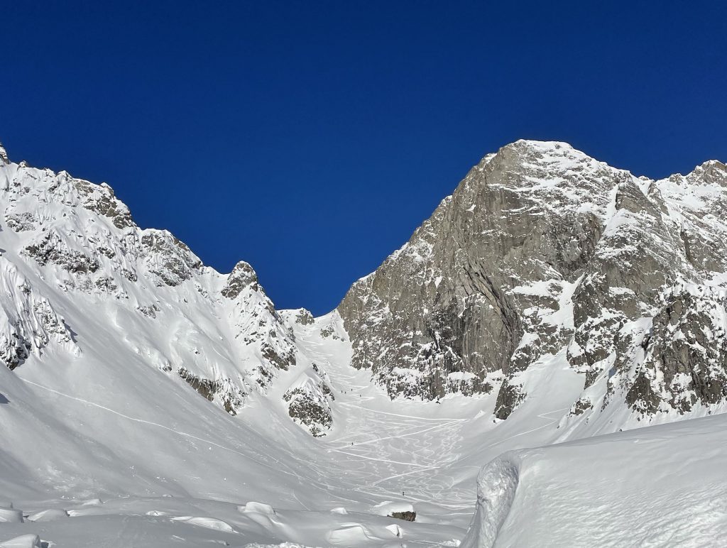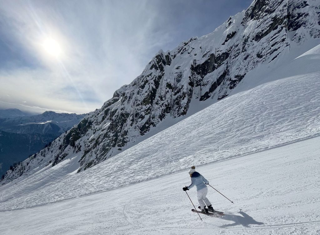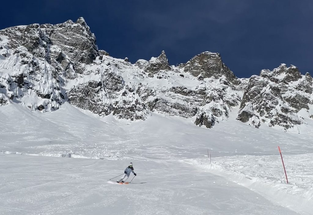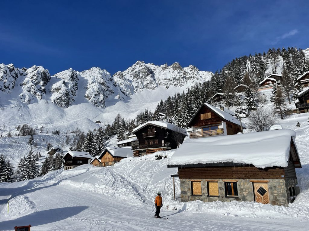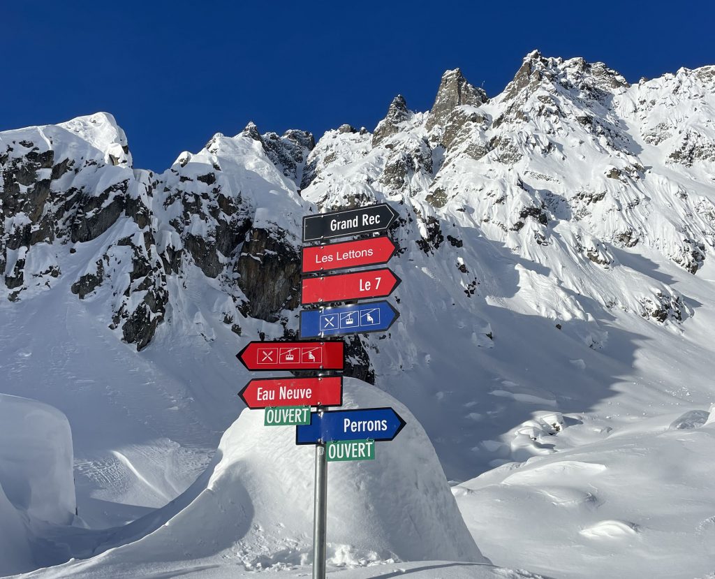 From Golettaz peak, you have magnificent views – like you can reach out and touch the surrounding peaks in this close Alps valley. Five prepared pistes drop serendipitously off both sides of the lift. Each trail is exciting, undulating, fun. Laps on the quad are 1600’ vertical, and each trail deserves a few laps with its interesting aspect and various fall lines. The ski area has an northeastern exposure, so its soon sunny in the morning and the all-natural snow softens a bit after a few hours.
