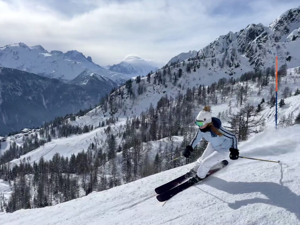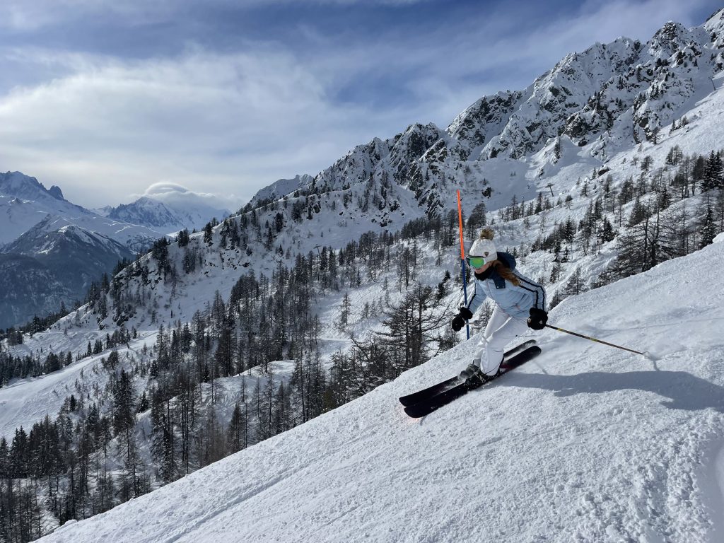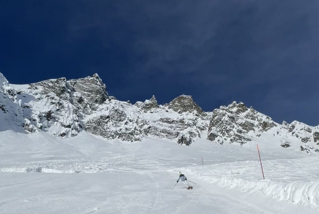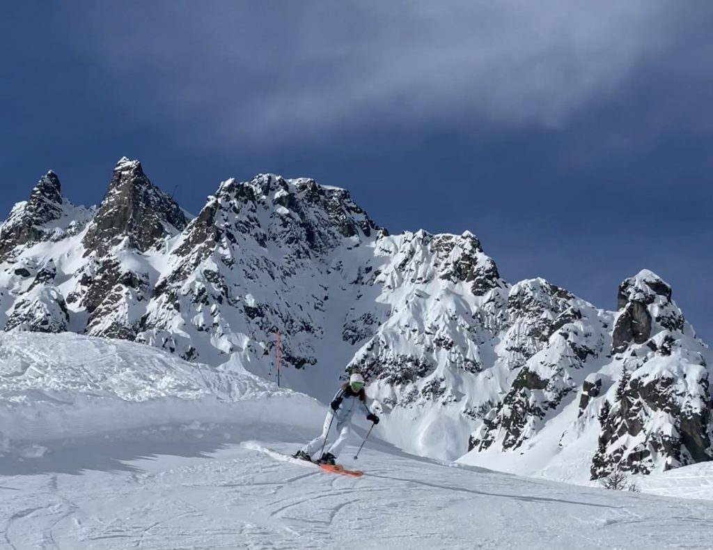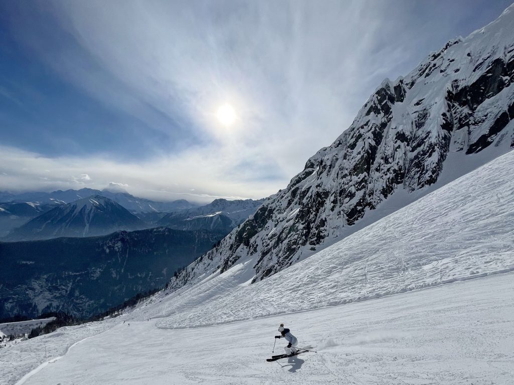 From Golettaz peak, you have magnificent views – like you can reach out and touch the surrounding peaks in this close Alps valley. Five prepared pistes drop serendipitously off both sides of the lift. Each trail is exciting, undulating, fun. Laps on the quad are 1600’ vertical, and each trail deserves a few laps with its interesting aspect and various fall lines. The ski area has an northeastern exposure, so its soon sunny in the morning and the all-natural snow softens a bit after a few hours.