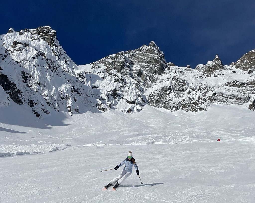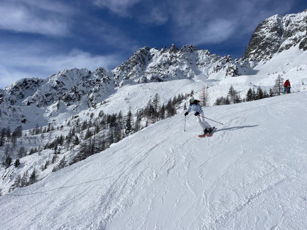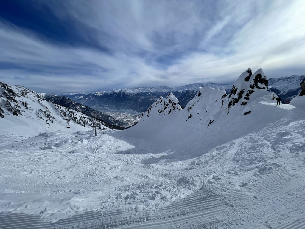 Télé Marécottes is a very cool little ski area that skis big. Perched high on a mountainside (a wild curvy road from Salvan). We loved our day skiing this unique, scenic, super special place! Télé Marécottes is in the next valley over from Verbier, beautiful, overlooking the Valais and Rhone River. If you’re a freeskier or just love a fun hidden gem of a ski area with well-pitched exciting groomers and no crowds, check out Télé Marécottes – which is on the Swiss Magic Pass. The drive up is a few switch backs on narrow steep mountain road clinging to the mountain side so your adventure begins right away.