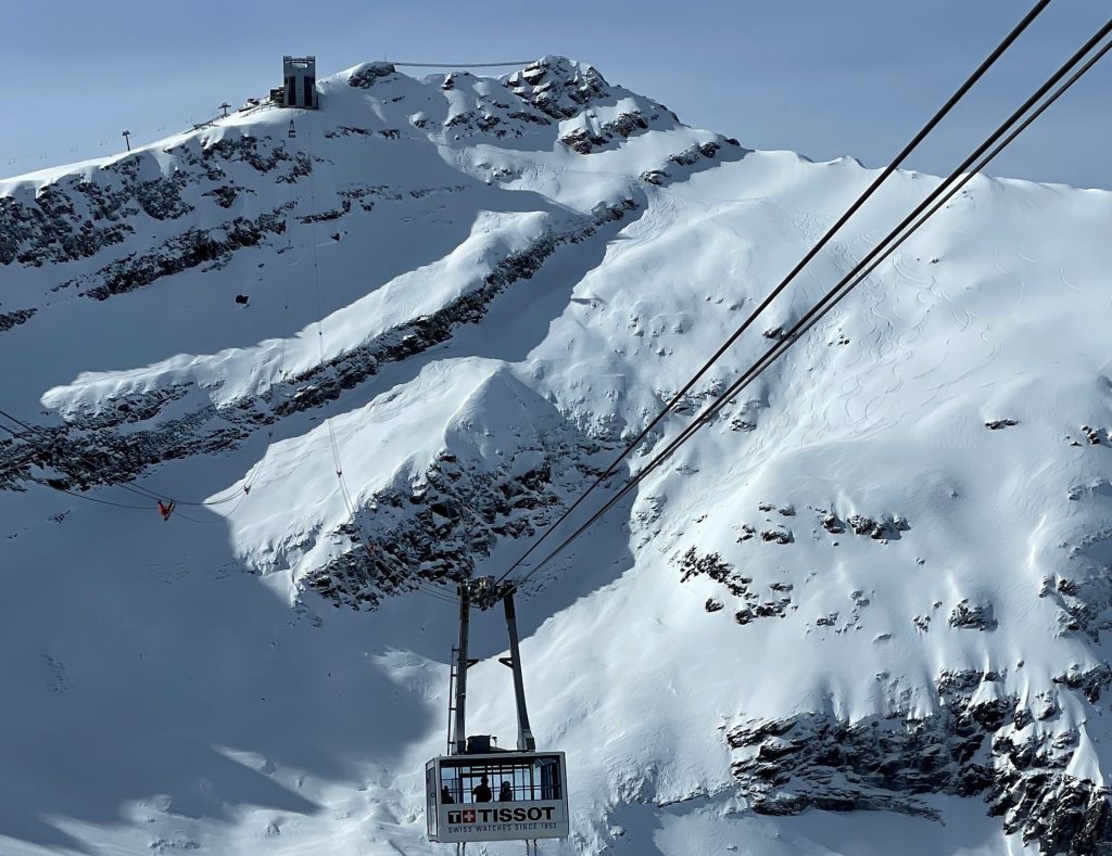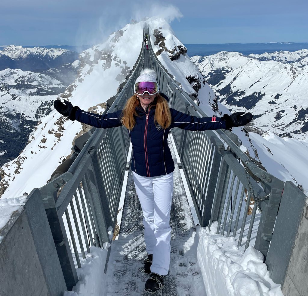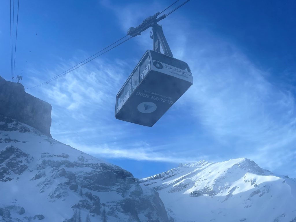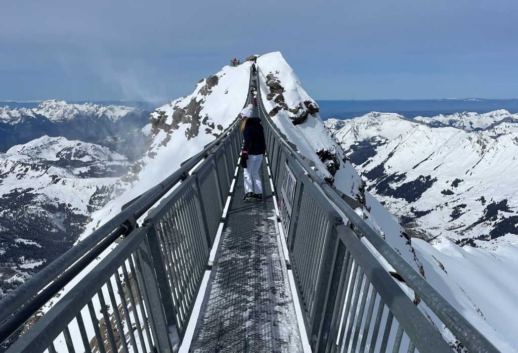 Glacier 3000 is often considered part of this ski region. This is the highest elevation, with separate terrain on a high plateau – which is a glacier – at 3000-meters (hence the name). Once you ride up Glacier 3000’s two connecting trams, the upper mountain is low angle snowfields served by T-Bars on the gorgeous glacial summit. Its spectacular. The Peak Walk atop Glacier 3000, new in 2021, is amazing – the highest suspension bridge in the world connecting two peaks. Walk it and see the wonder of engineering, and the wild drop below this wiggly bridge, admission is included with your ski pass. Glacier 3000 is also just a 20-minutes drive above the chic ski town of Gstaad. Gstaad like to claim it as part of their Gstaad Super Ski Region including Zweisimmen and Saanemoser.