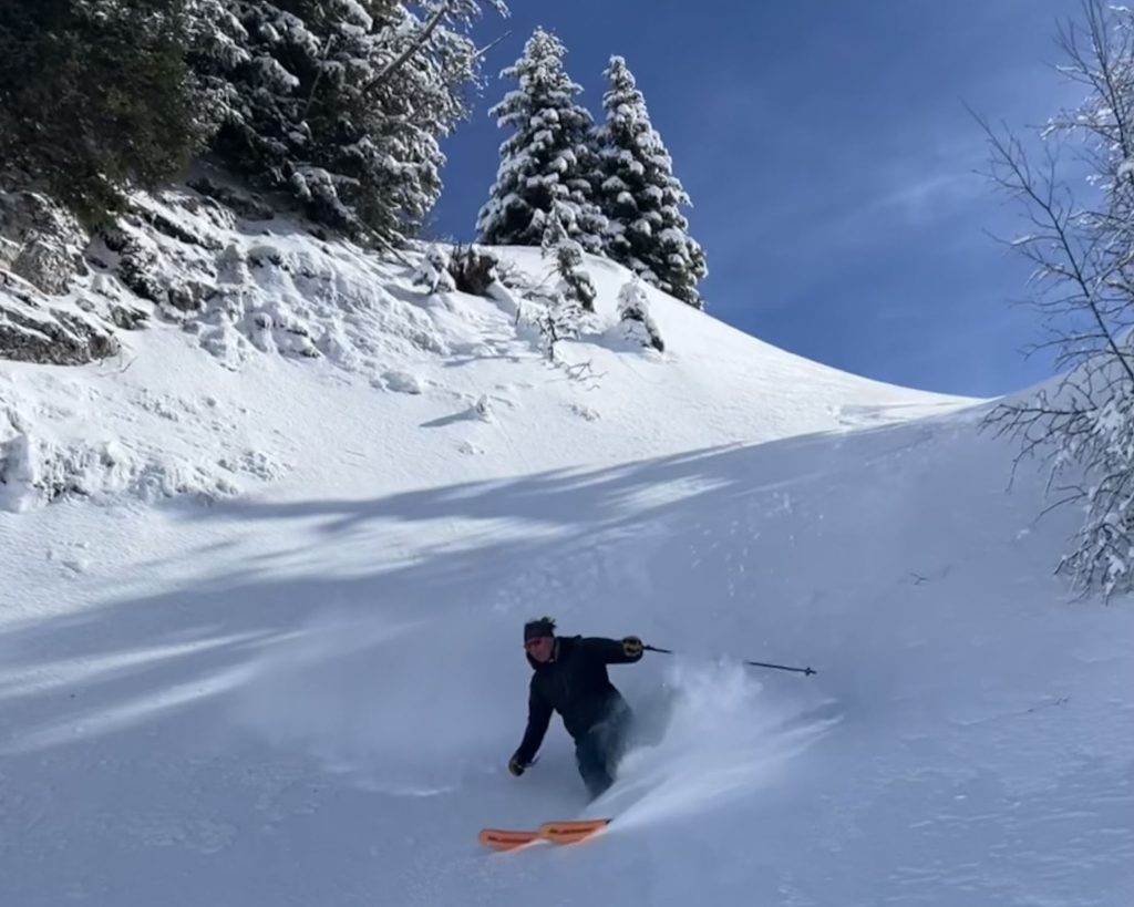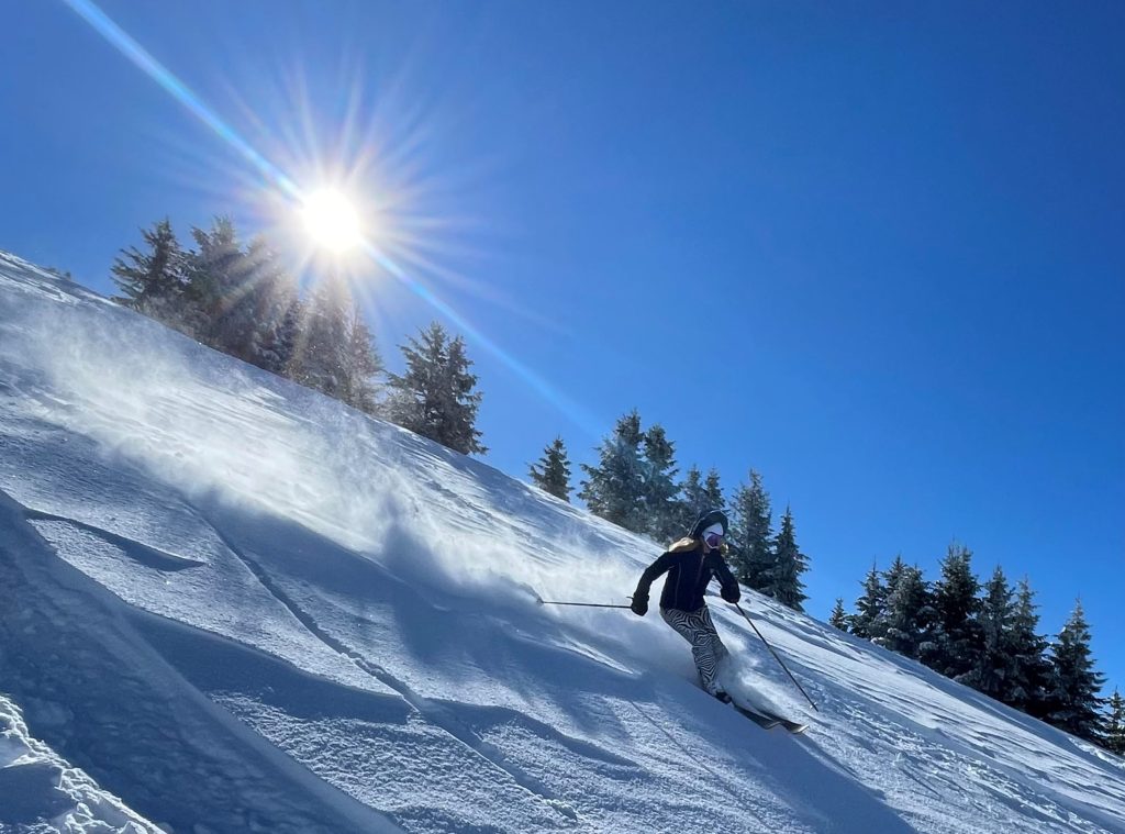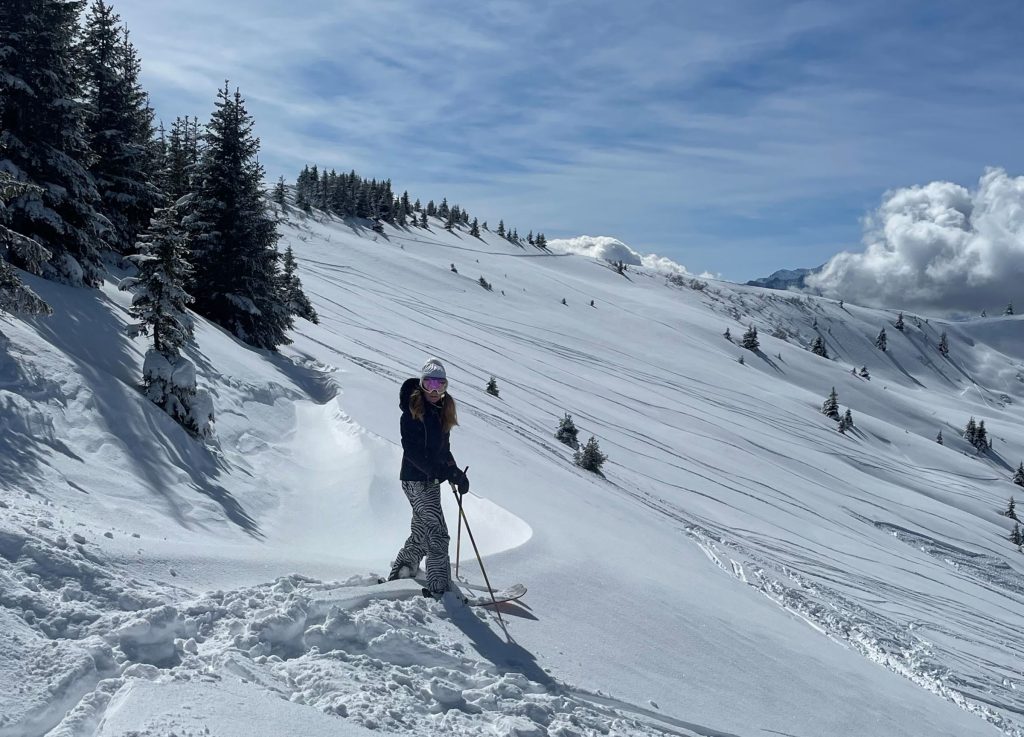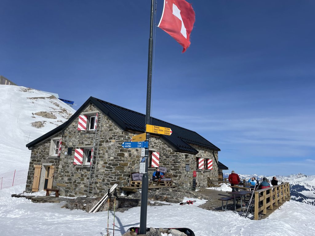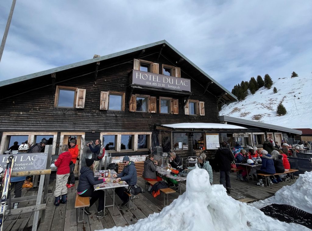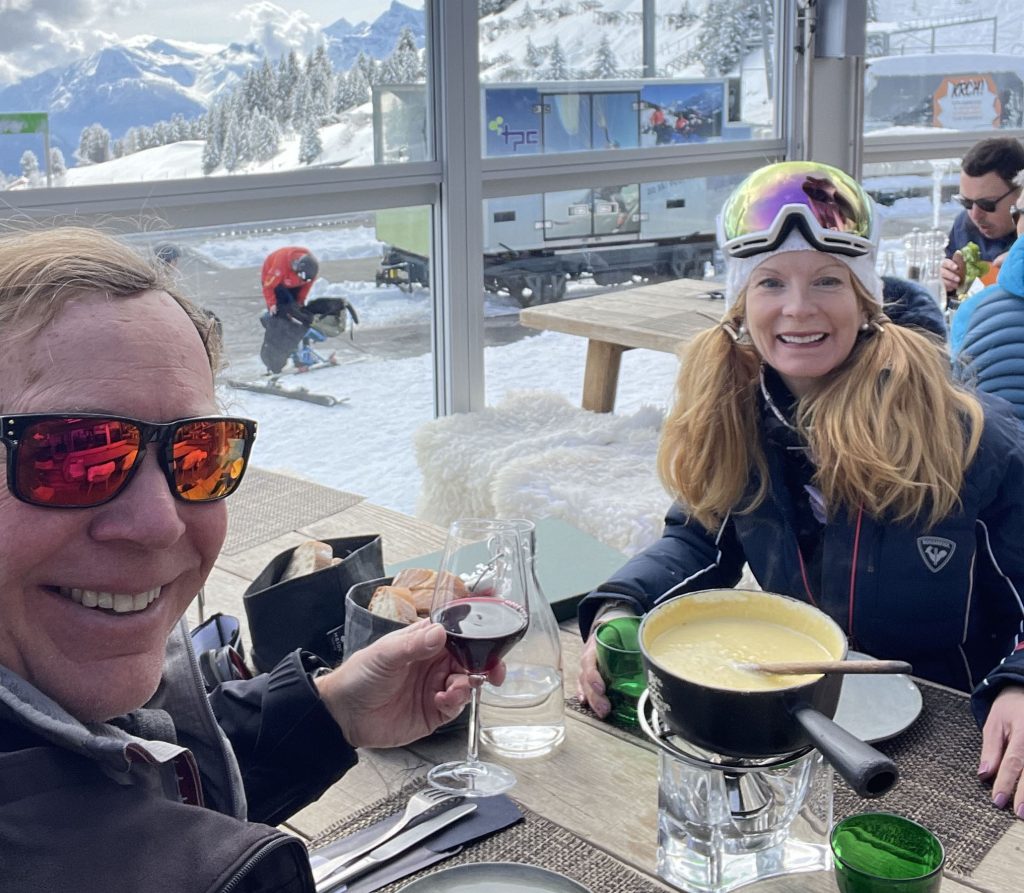 Villars mid-mountain (referred to as Bretaye), where the train arrives from Gryons and Villars, is the ski resort hub. Here you will find ski school, several lodges and restaurants, and a ski in ski out hotel – Hotel du Lac – where we dined on a delicious lunch. Next day, a sunny perfect powder day, we sat on the terrace at Bretaye 1808 and savored Swiss cheese fondue with a view!