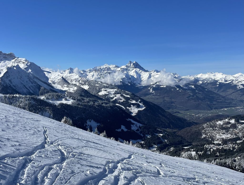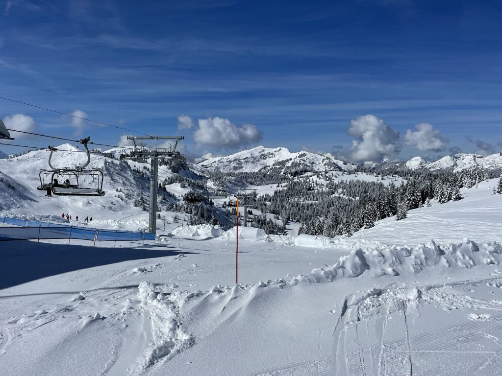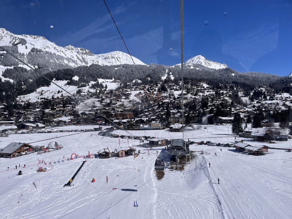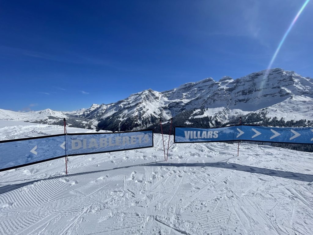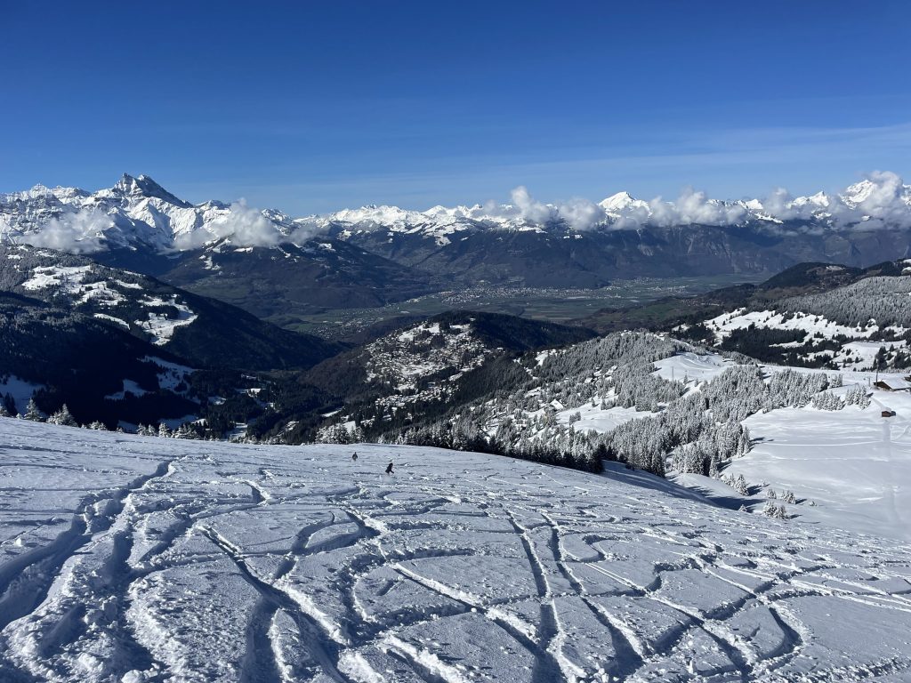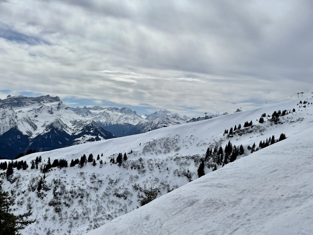Everywhere you ski as you navigate around each – Villars and Gryon and Diablerets… the views of the Alps are astounding, often the peak of Mont Blanc is clearly visible. From each of the three villages, three base-to-mid-mountain gondolas flank the mountains. There is also a train from Gryon and Villars up the mountain to Bretaye which is the heart of the upper elevation terrain.