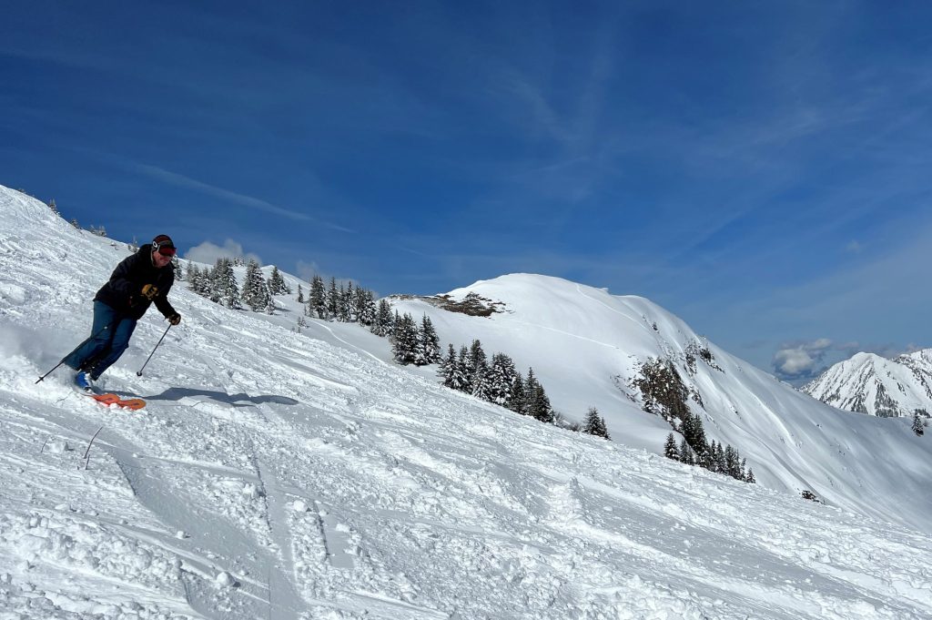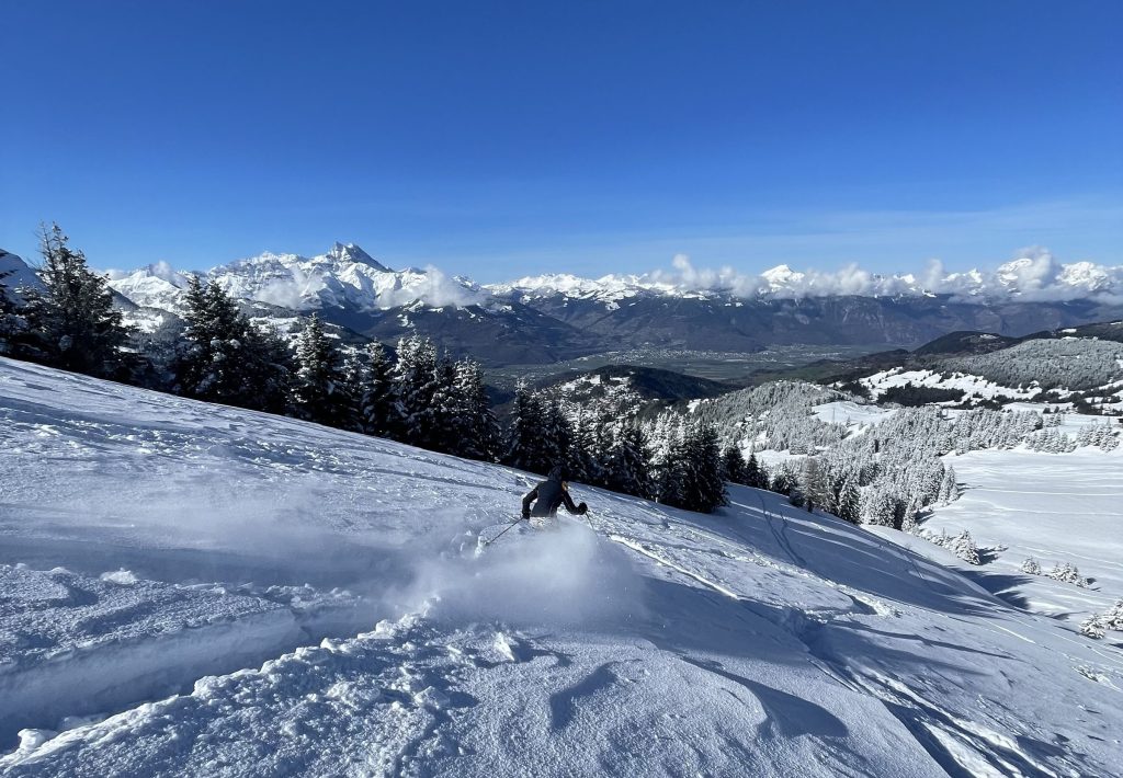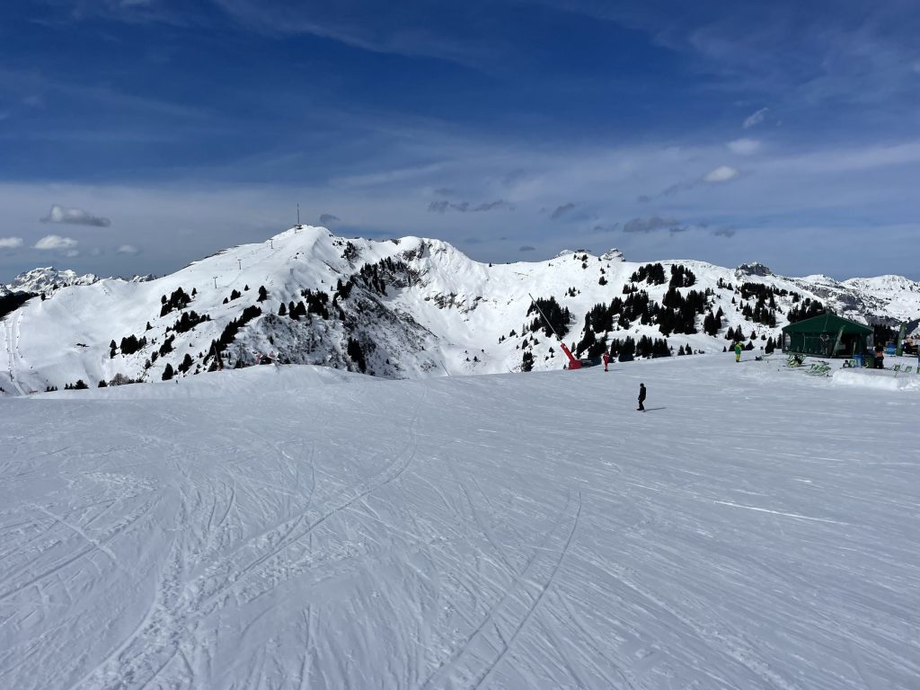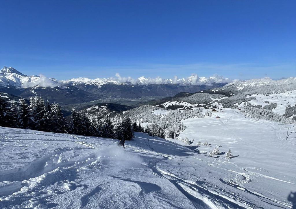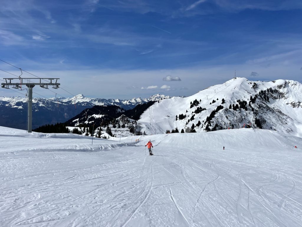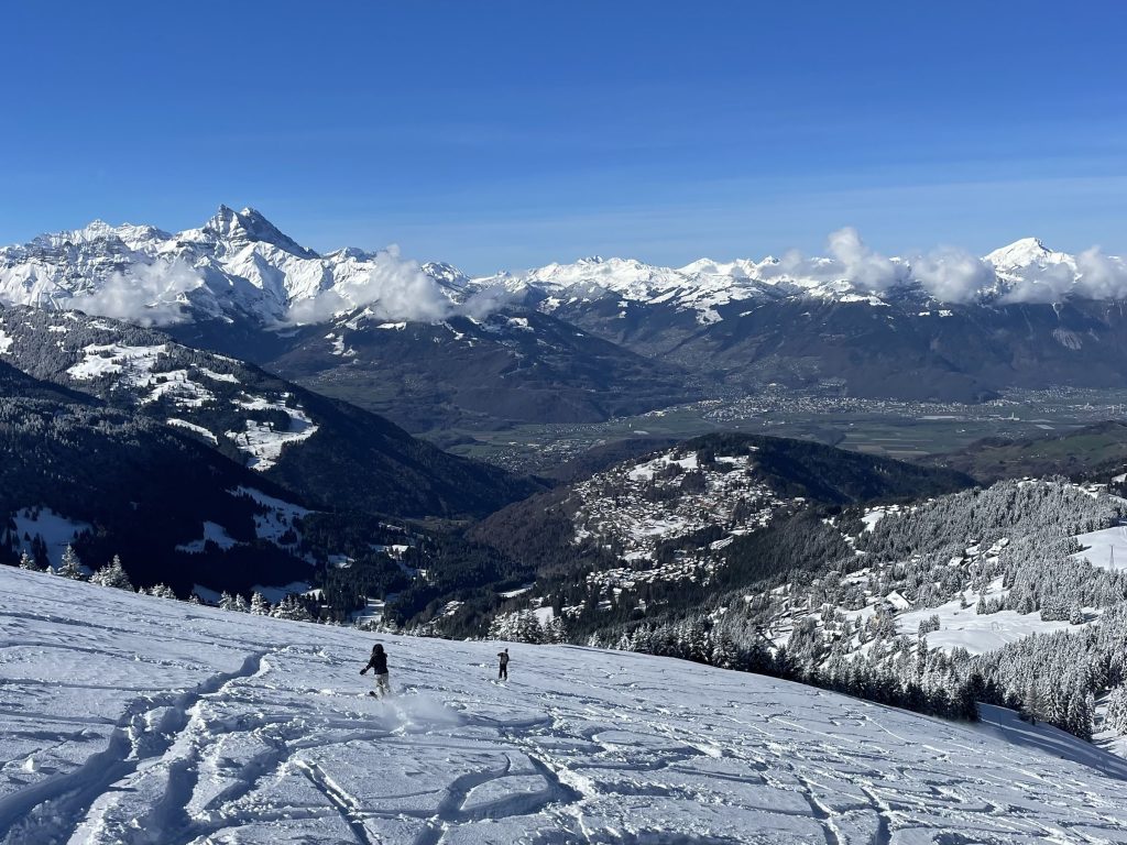 Everywhere you ski as you navigate around each – Villars and Gryon and Diablerets… the views of the Alps are astounding, often the peak of Mont Blanc is clearly visible. From each of the three villages, three base-to-mid-mountain gondolas flank the mountains. There is also a train from Gryon and Villars up the mountain to Bretaye which is the heart of the upper elevation terrain.